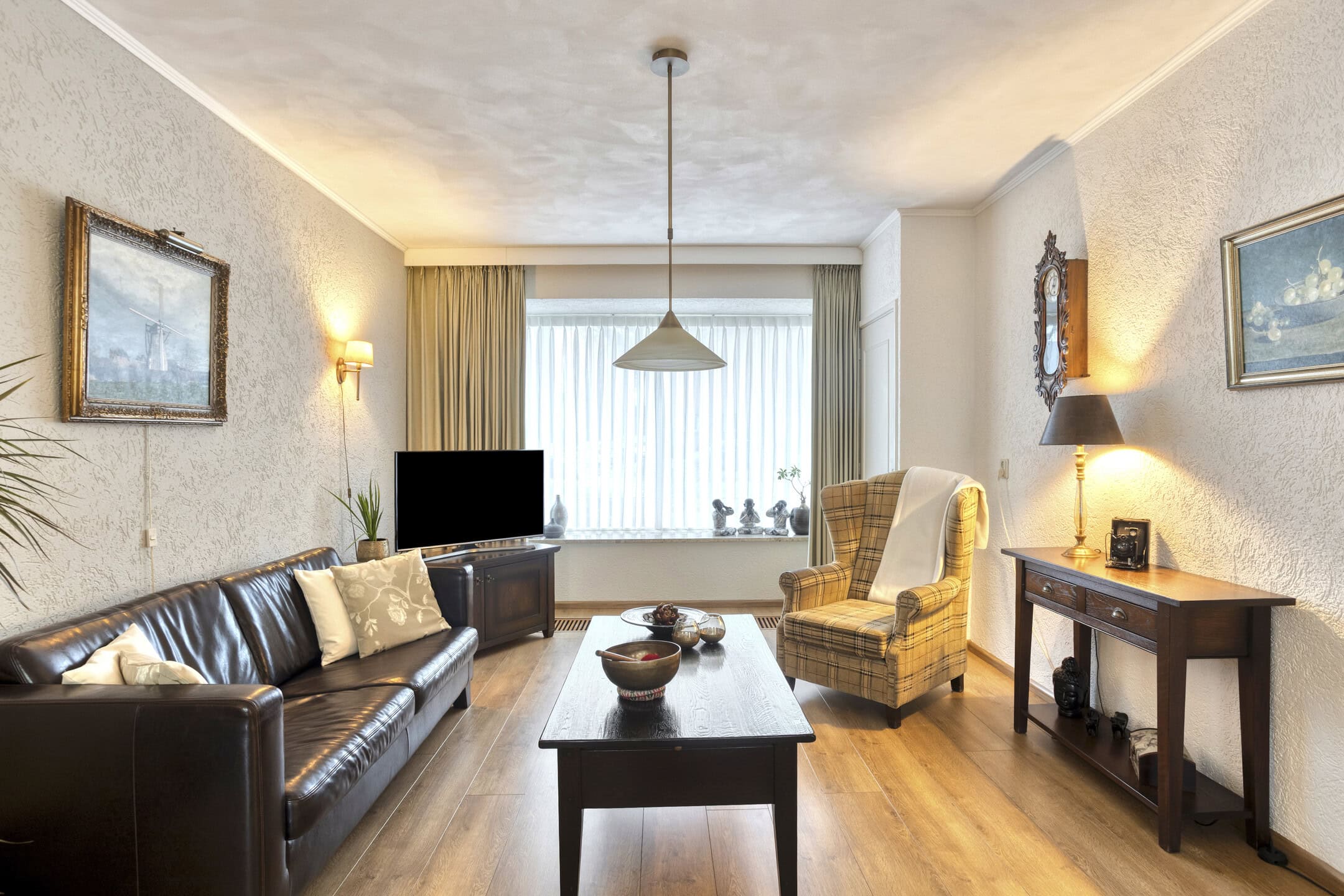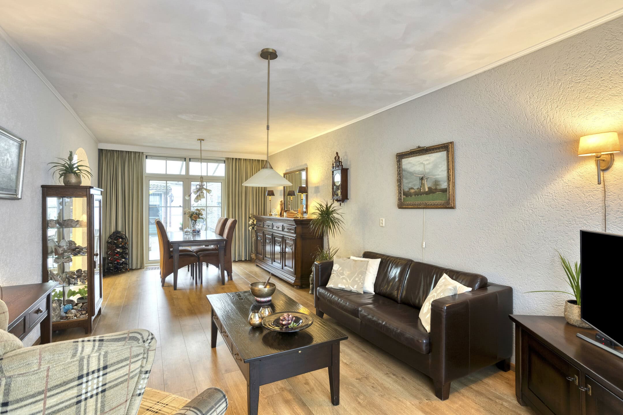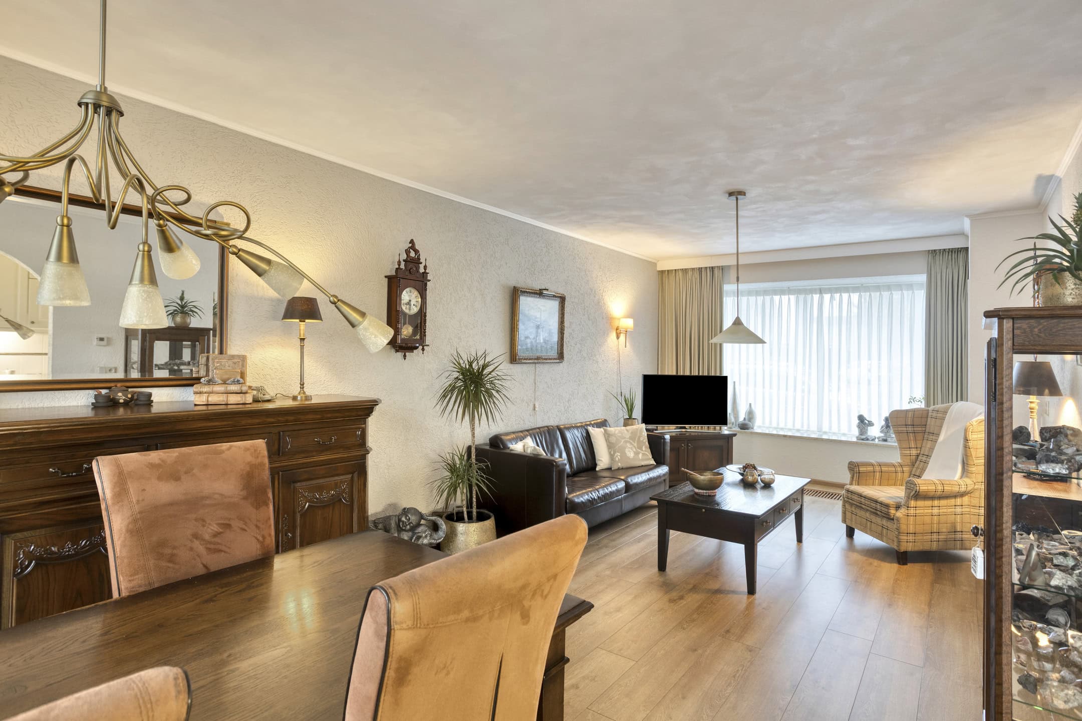 Via de hal kom je in de doorzonkamer, waar het licht van beide kanten binnenvalt. De erker aan de voorzijde zorgt voor extra ruimte en een leuk uitzicht op de rustige straat. De woonkamer is afgewerkt met een nette laminaatvloer, een vernieuwd stucplafond en beschikt over een praktische muurkast. Aan de tuinzijde geven openslaande deuren toegang tot het terras, terwijl twee convectorputten zorgen voor een aangename temperatuur zonder dat radiatoren het zicht belemmeren. De ruimte voelt warm en uitnodigend; ideaal voor zowel ontspannen avonden als gezellige etentjes.