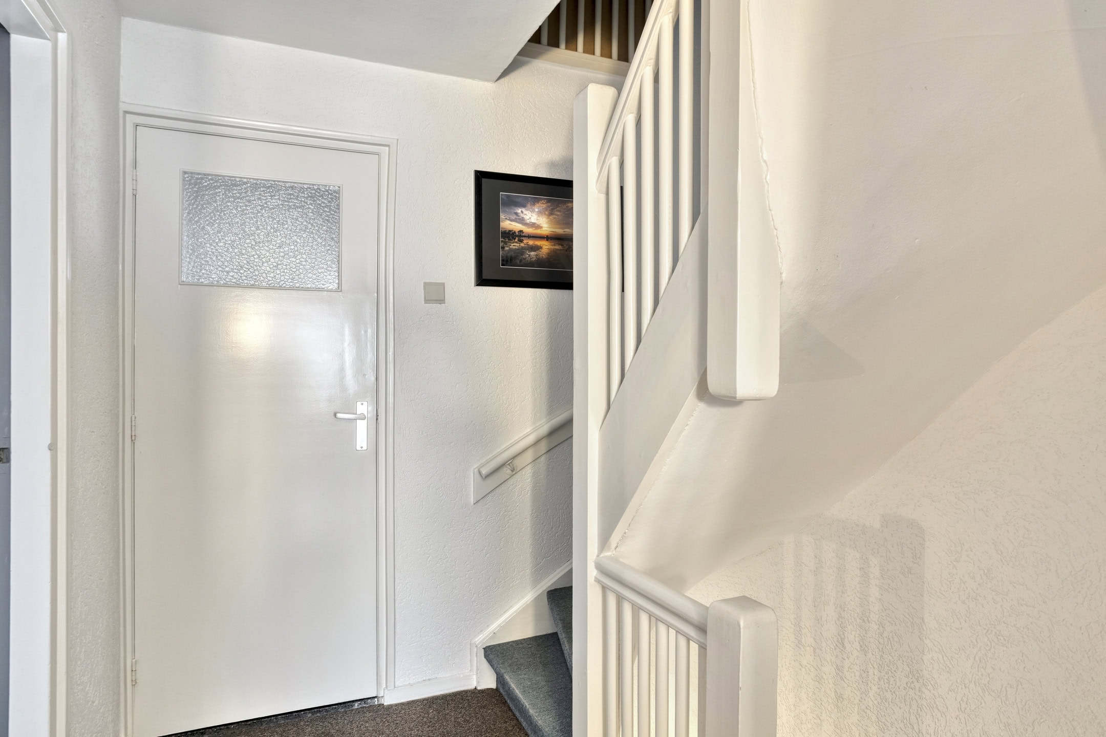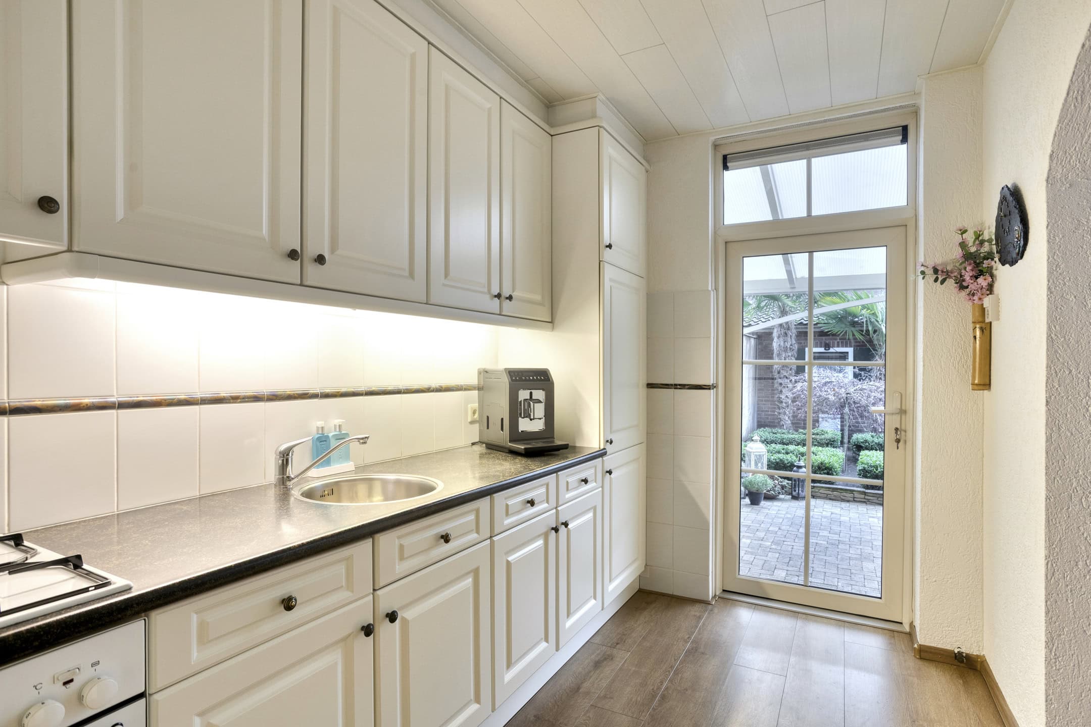 De open doorgang naar de keuken maakt dat het geheel ruimtelijk aanvoelt. De keuken heeft een verzorgde wandopstelling met een gaskookplaat, afzuigkap, oven en koelkast. Dankzij de loopdeur naar de overkapping kun je gemakkelijk buiten eten of koffie drinken, ongeacht het weer. De diepe kelderkast onder de trap biedt extra provisieruimte.