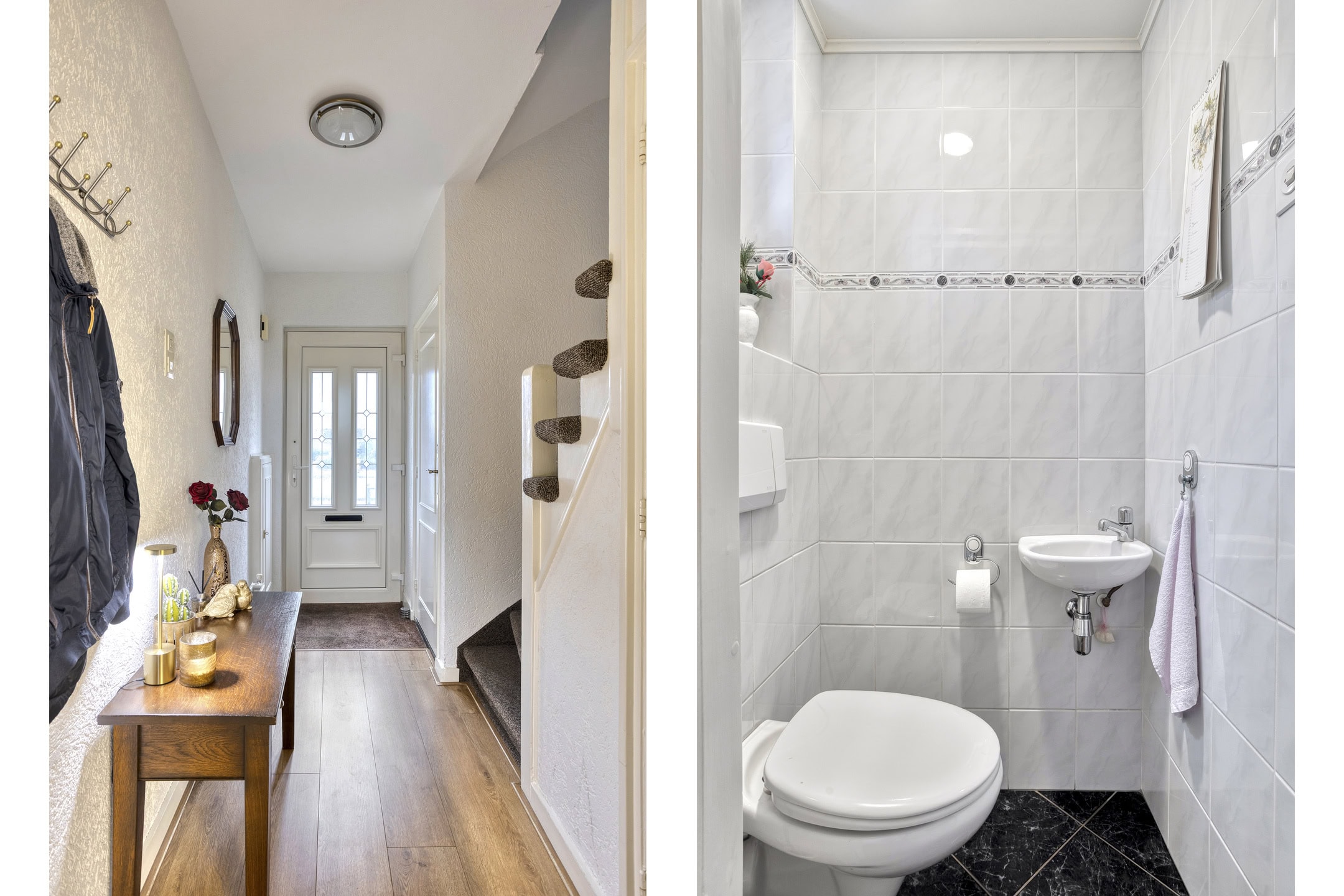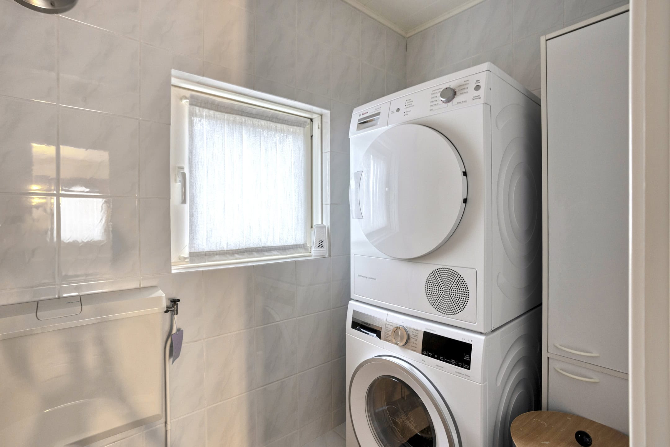 De oorspronkelijke badkamer fungeert nu als praktische wasruimte. Hier vind je de witgoedaansluitingen en een tweede toilet.