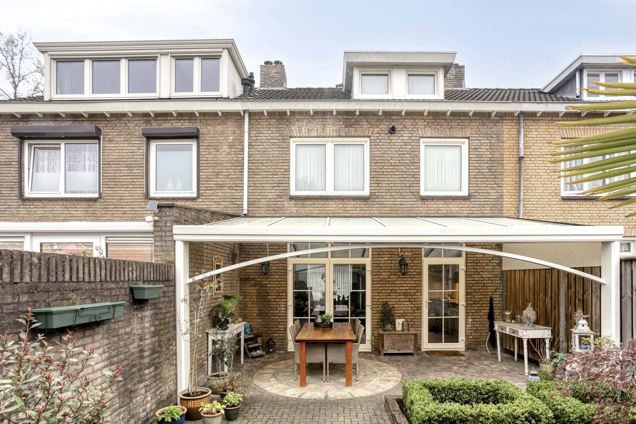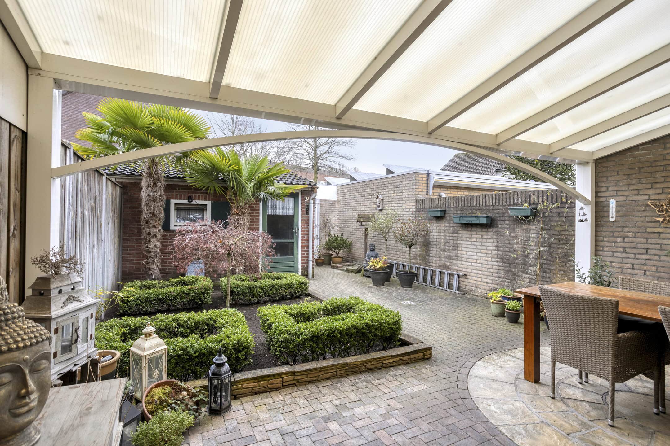De achtertuin is fraai aangelegd met groene borders, een betegeld terras en een aluminium overkapping die beschutting biedt in elk seizoen. Dankzij de vrije achterom is de tuin goed bereikbaar. Achterin staat een stenen berging met elektra en een extra overdekte opslagruimte — ideaal voor tuinspullen of fietsen. De tuin biedt veel privacy en vormt een prettige plek om te genieten van rust en groen.