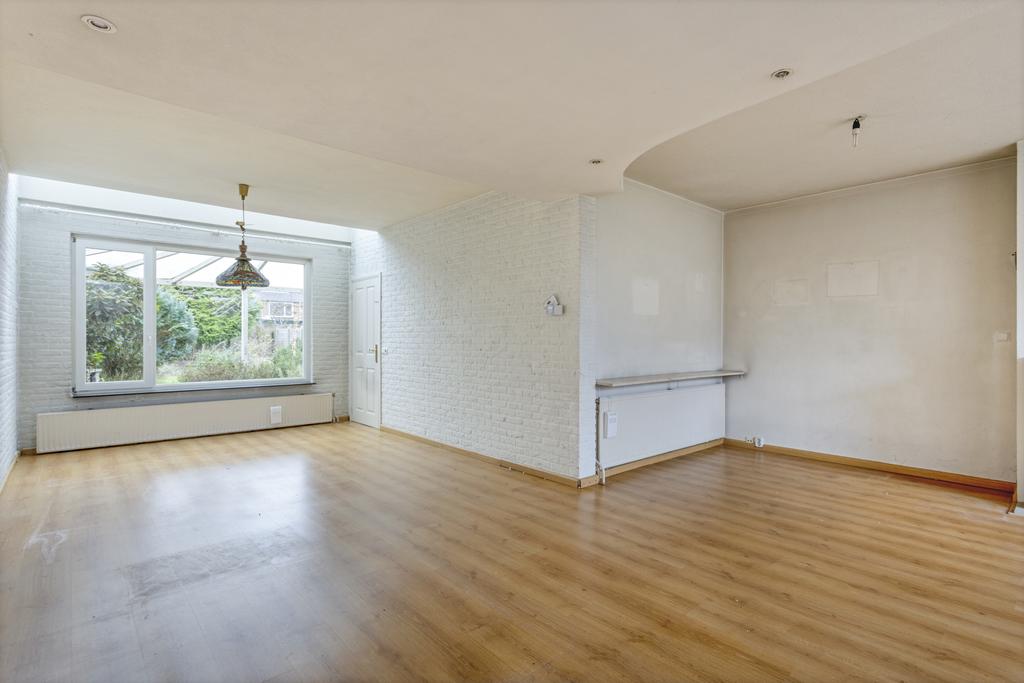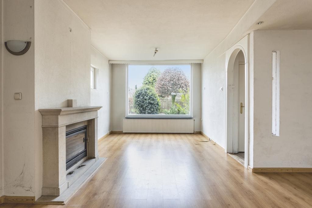 De woonkamer is erg ruim vanwege de uitbouw aan de achterzijde. De inbouwspots, de open haard met schouw en de lichtstraat in de aanbouw geven de woning een sfeervolle uitstraling. De woonkamer beschikt over een laminaatvloer (met daaronder prachtige blauwe tegels) en de wanden zijn deels voorzien van schoonmetselwerk en deels stucwerk.