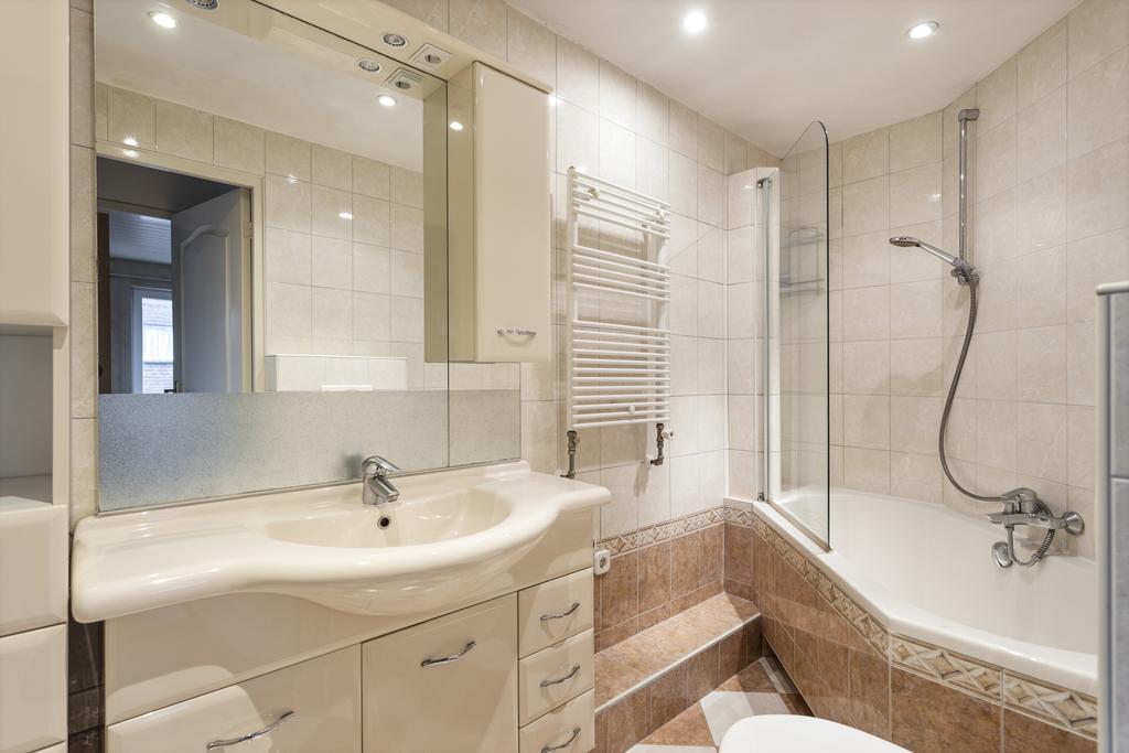 De badkamer is uitgevoerd in een lichte kleurstelling en heeft daardoor een frisse uitstraling. De ruimte is voorzien van een toilet, een ligbad met douche, een wastafel in meubel, een design radiator, inbouwspots en mechanische ventilatie.