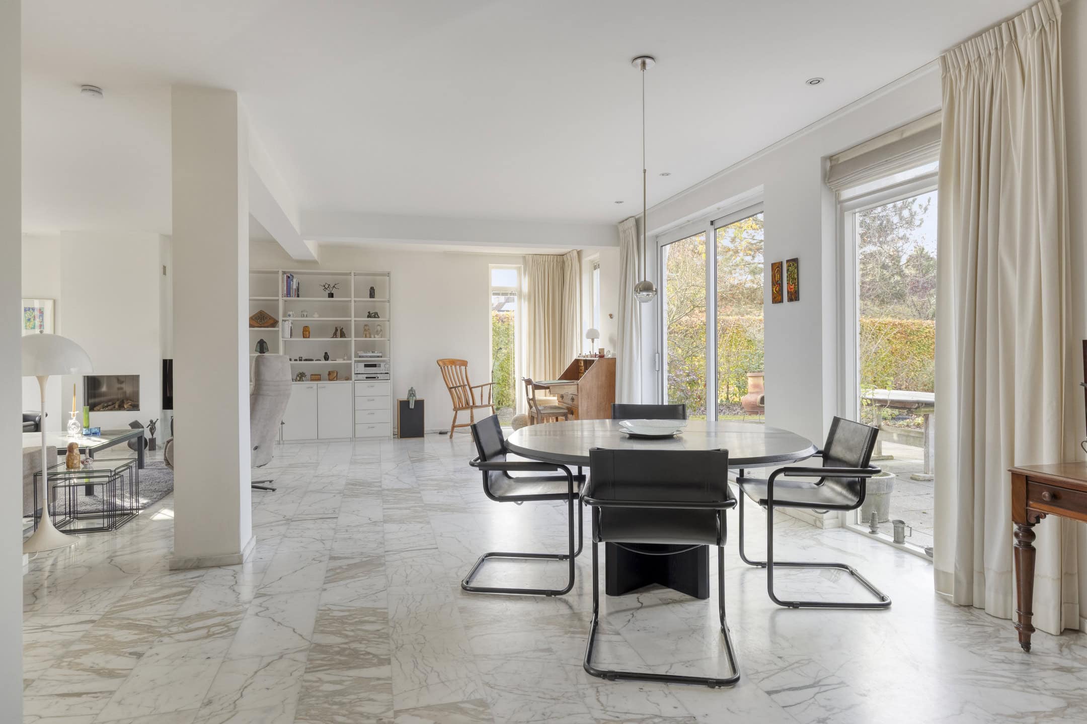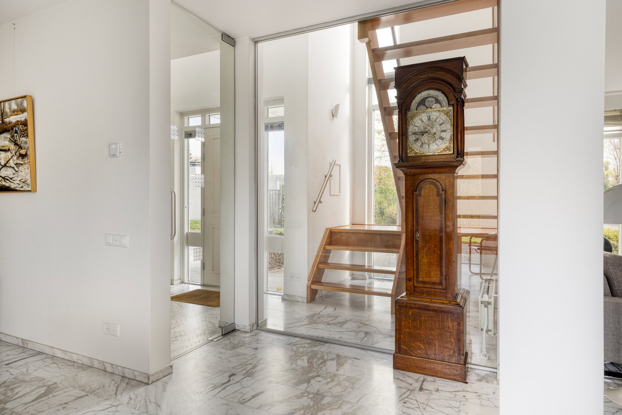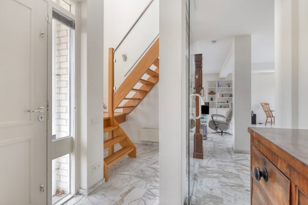 Eenmaal binnen word je verwelkomd door een ruime ontvangsthal waarvan de open trapopgang tot aan de nok doorloopt. De marmeren vloer voorzien van vloerverwarming die over de gehele begane grond is doorgelegd zet direct de toon voor deze charmante woning met volop mogelijkheden. De grote raampartijen met veel natuurlijk lichtinval zorgen voor een warm welkom. De hal beschikt over een garderobe voor de jassen, een keurige toiletruimte met fonteintje, trapopgang naar de eerste verdieping en een glazen deur naar de woonkamer.