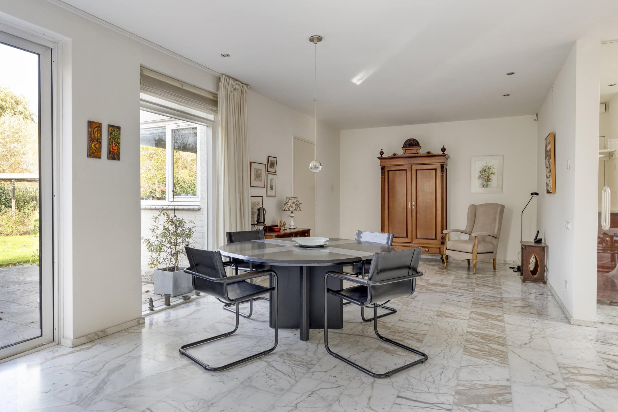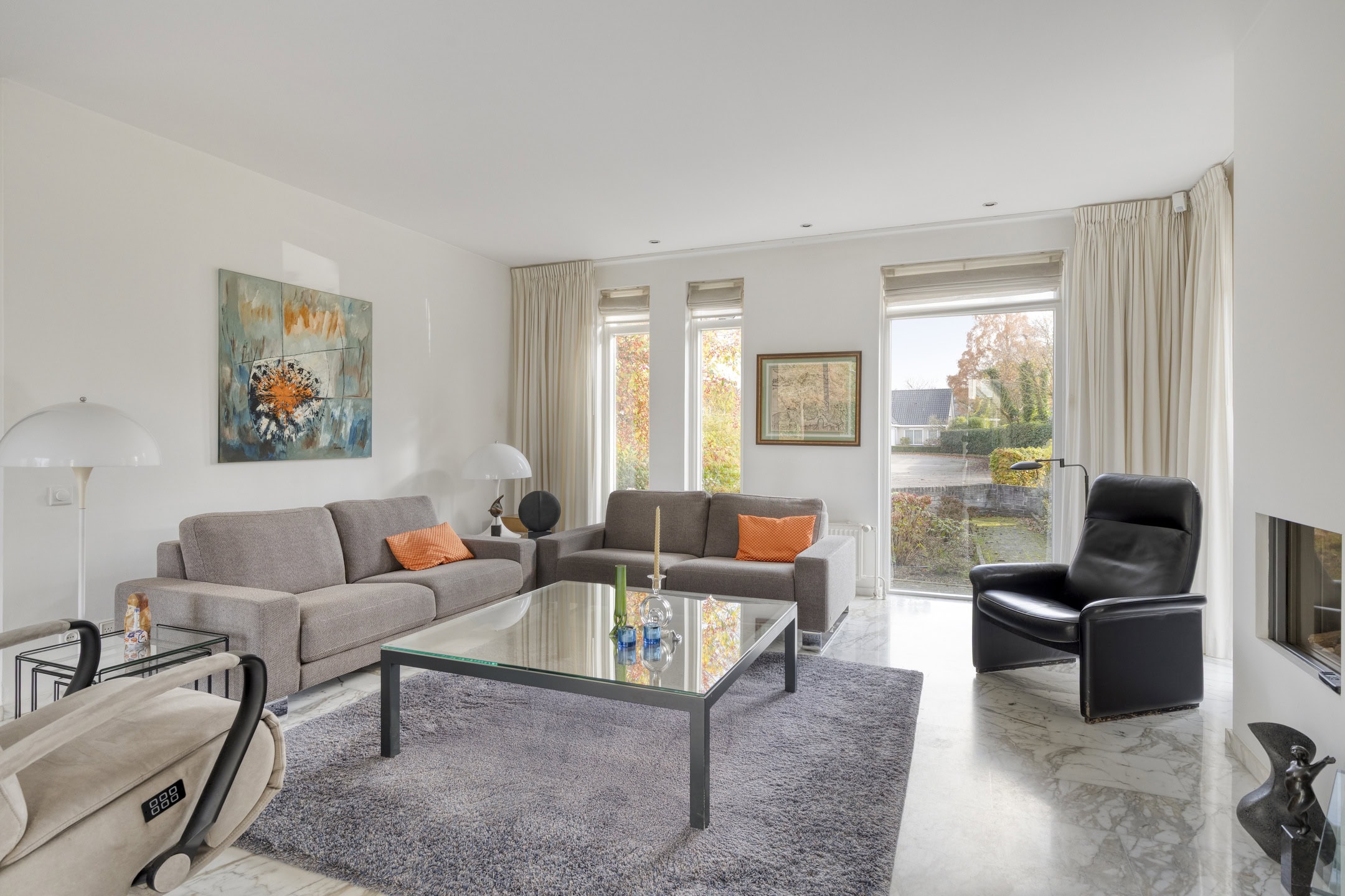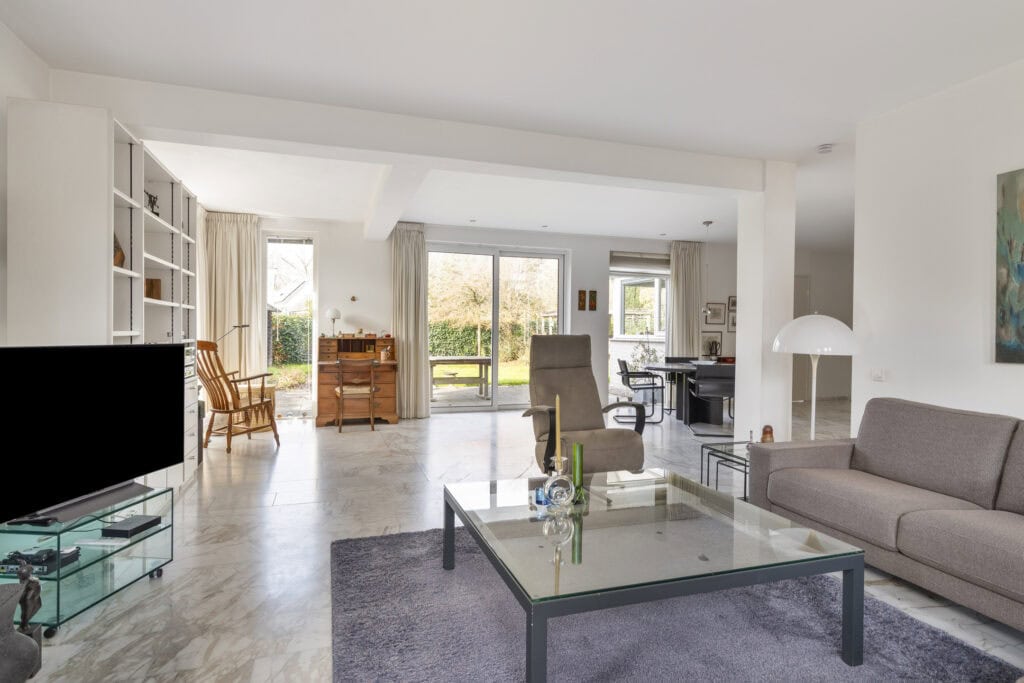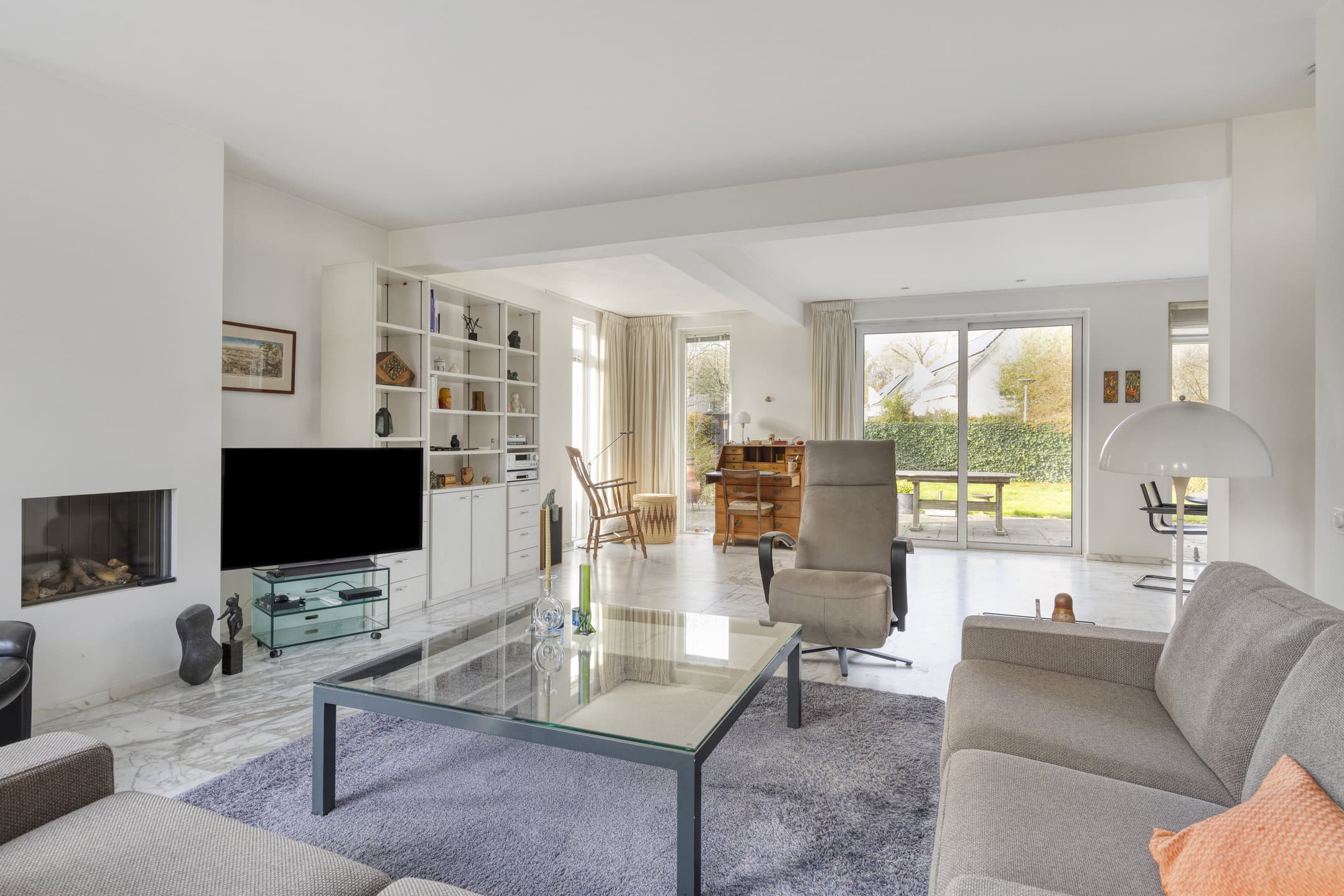 De L-vormige woonkamer is het hart van deze woning. Een heerlijke plek om samen te zijn en te genieten van de aanwezige rust en ruimte. Dankzij de diverse raampartijen doorlopend tot aan de grond en de grote schuifpui die zorgt voor een open verbinding met de tuin geniet je de hele dag van veel natuurlijk lichtinval en een prettige leefomgeving. De aanwezige gashaard biedt extra gezelligheid in de avonden, terwijl inbouwspots in het plafond de sfeer in de woonkamer compleet maken.