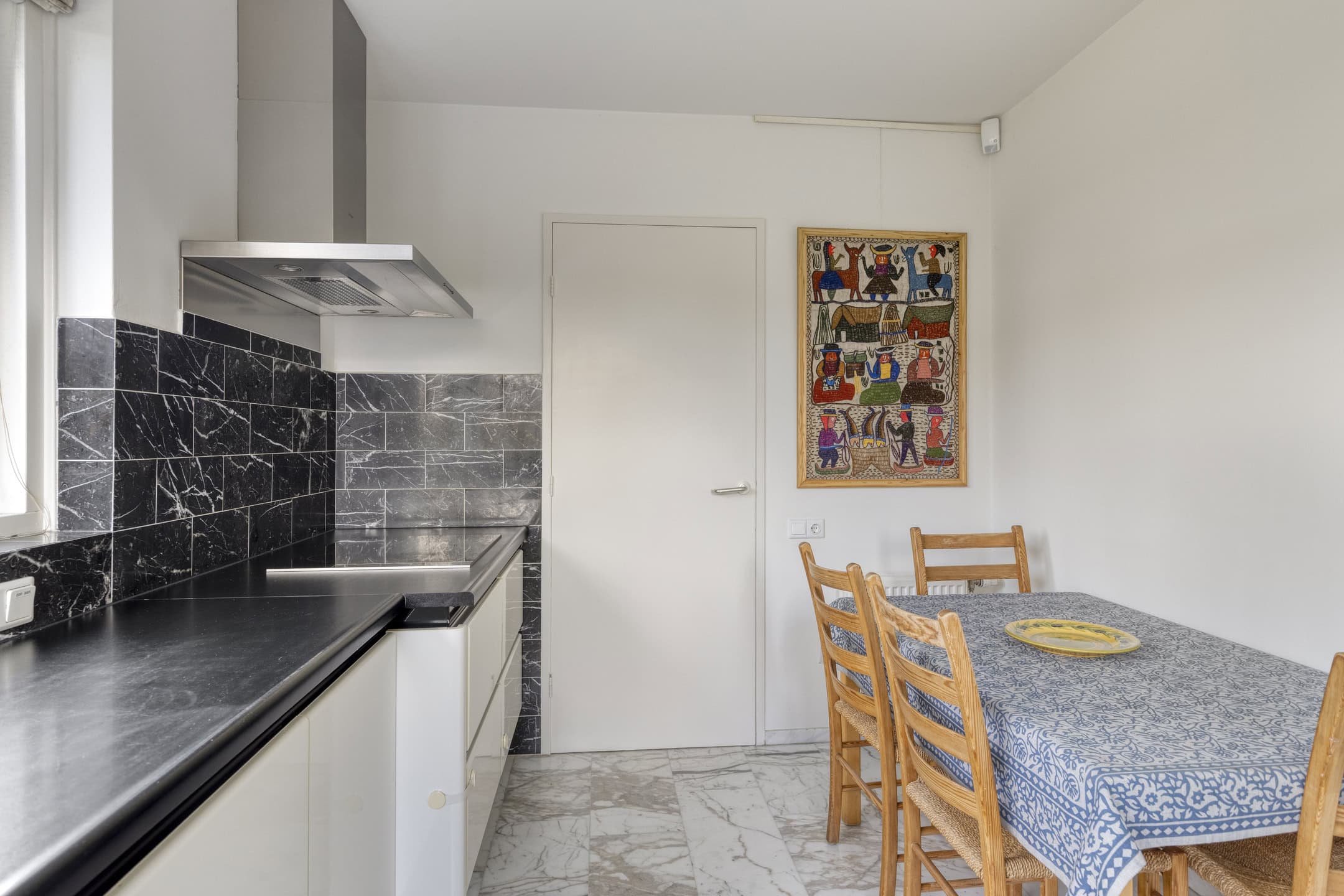 De keuken in hoekopstelling geplaatst en met een fantastisch zicht op de achtertuin biedt volop werk- en bergruimte. Zo is er naast de vele bergruimtes en lades een inductiekookplaat met afzuiging, oven, vaatwasser, koelkast en een dubbele spoelbak met mengkraan aanwezig. Hier kun je met het gezin ontbijten of (samen)koken in een prettige, licht overgoten ruimte.