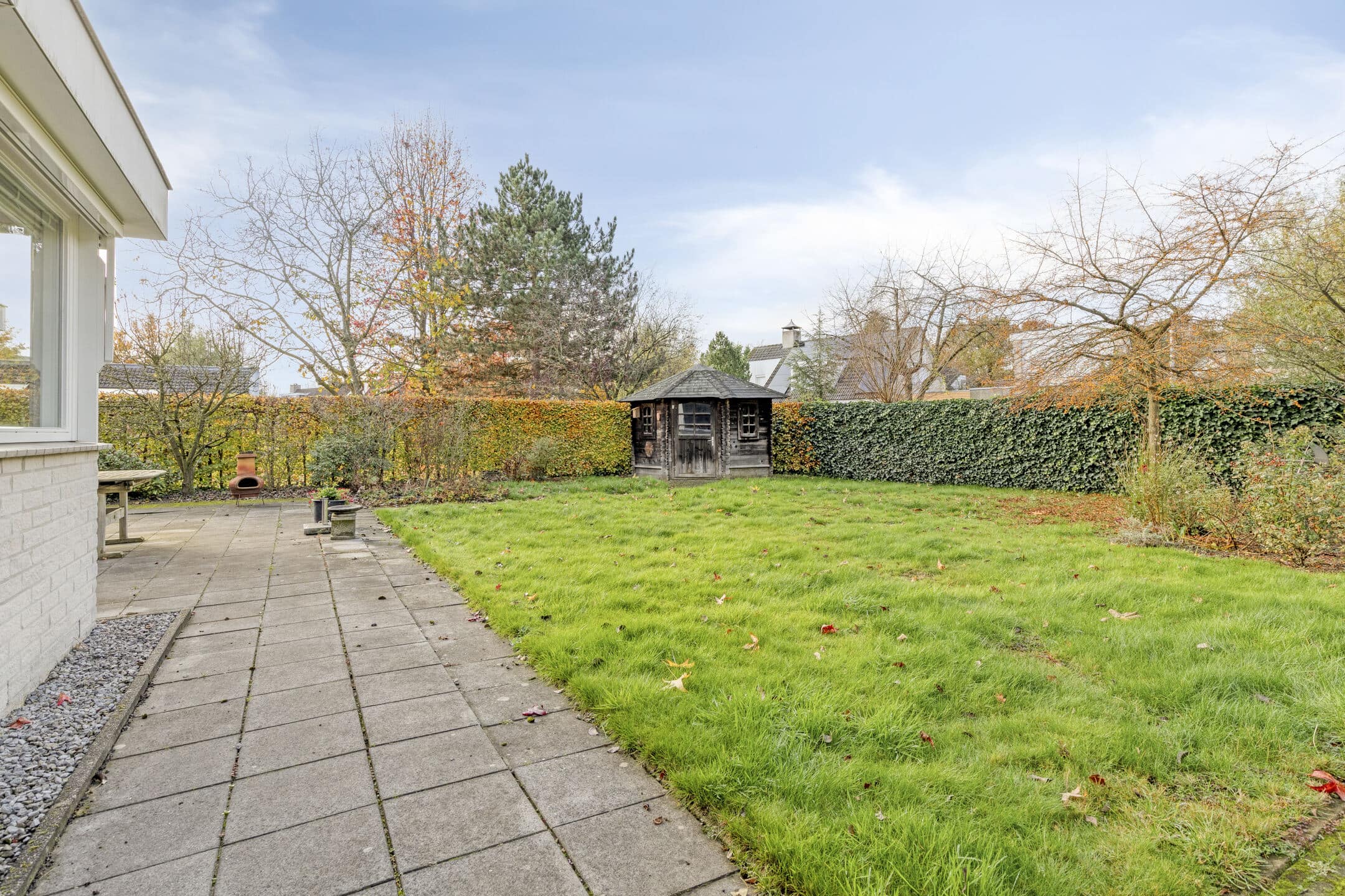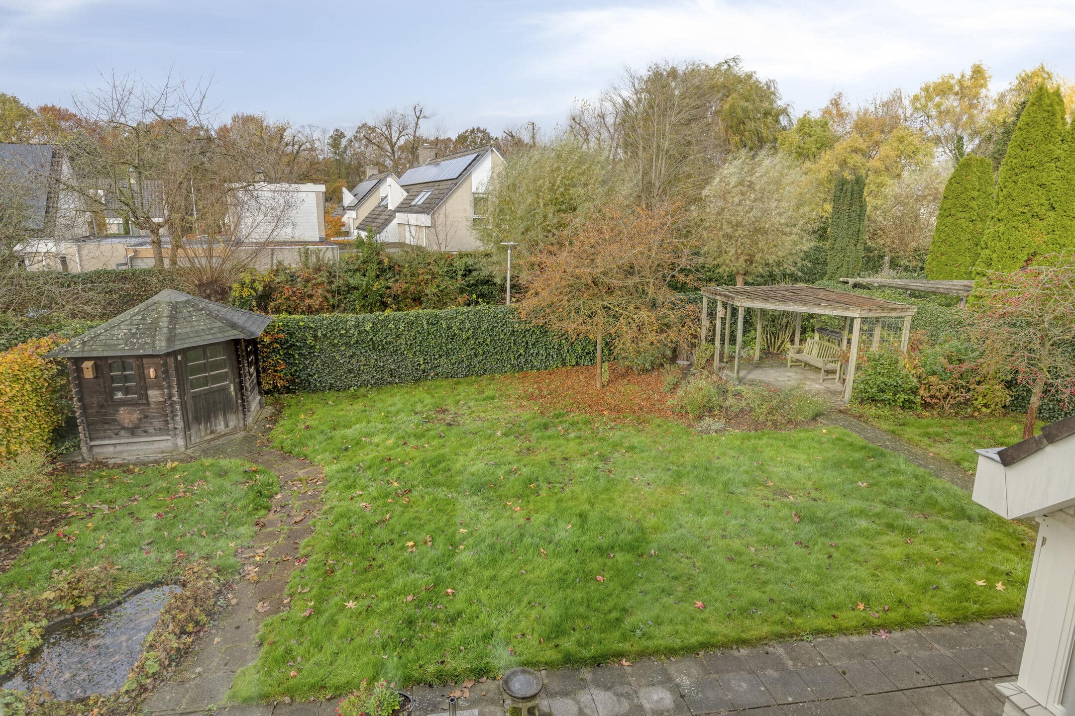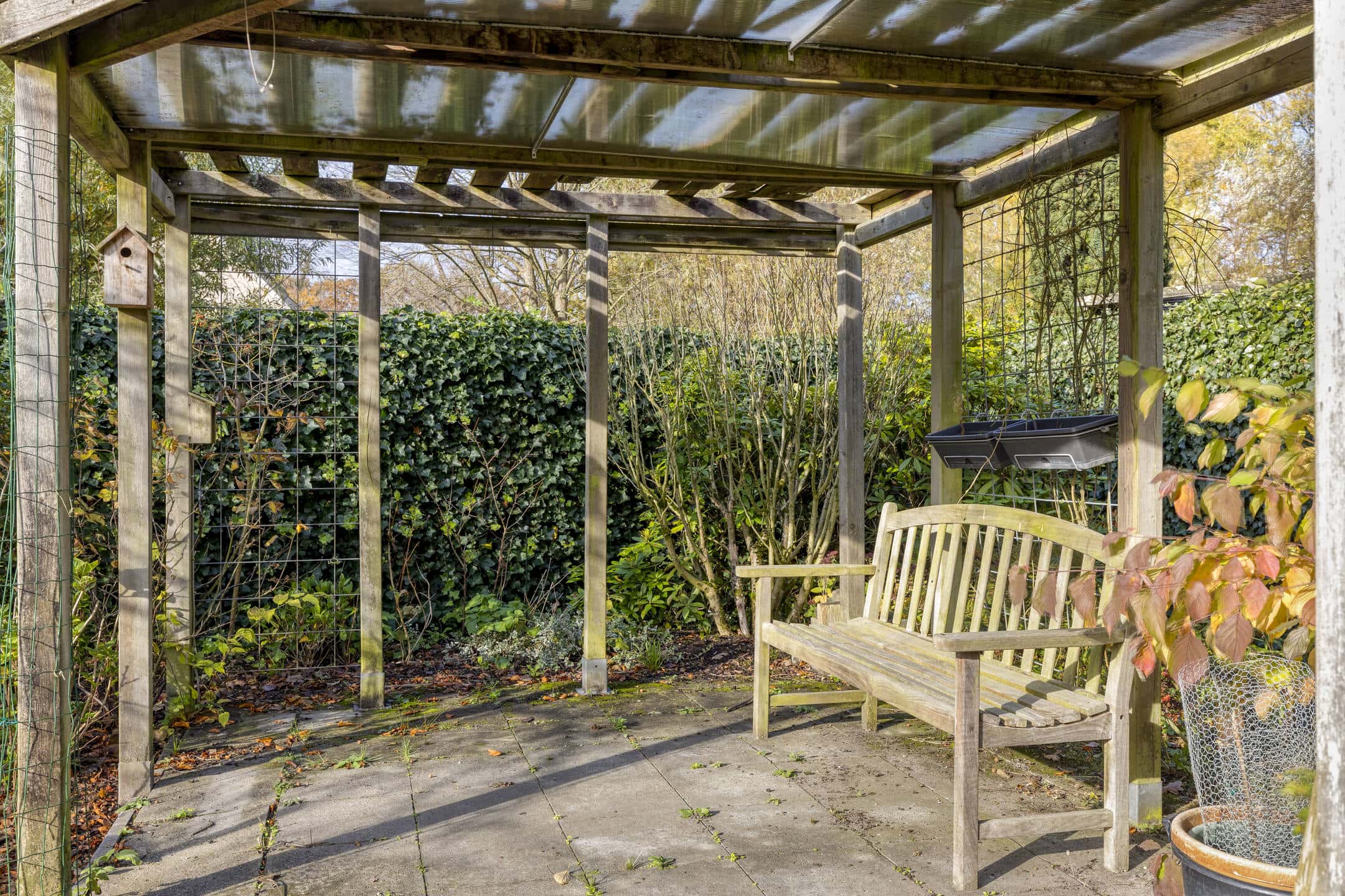De riante tuin rondom de woning gelegen biedt voor elk gezinslid wat wils. De achtertuin op het noordwesten heeft meerdere terrassen, waaronder een hoofdterras met (elektrische) zonneluifels en een terras met sfeervolle pergola. Daarnaast zijn er een houten, vrijstaande schuurtje voor tuingereedschap en een groot grasveld met diverse plantenborders aanwezig. De buitenverlichting zorgt voor een fijne sfeer in de avond en de ijzeren hekwerken aan de zijkanten van de tuin zorgen voor de veiligheid. Kinderen kunnen hier ongestoord spelen, terwijl ouders genieten van rust en privacy. Deze tuin is een heerlijke plek om te genieten.