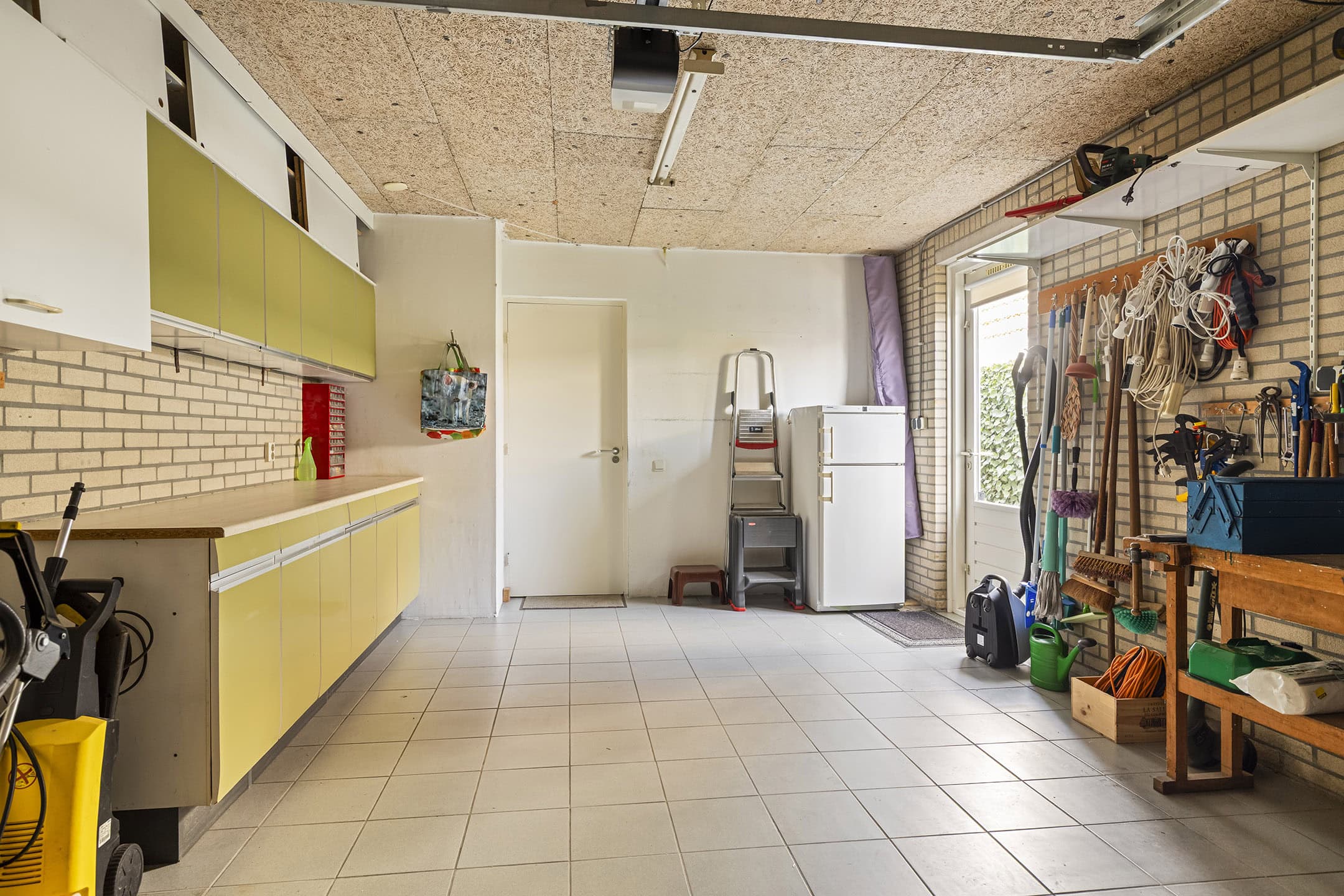 De garage is verwarmd, voorzien van een nette tegelvloer, diverse opbergkasten en een deur naar zijtuin, handig voor o.a. de afvalbakken. Deze ruimte beschikt over een elektrische roldeur en is daardoor ideaal geschikt voor het plaatsen van een auto, fietsen of tuingereedschap.