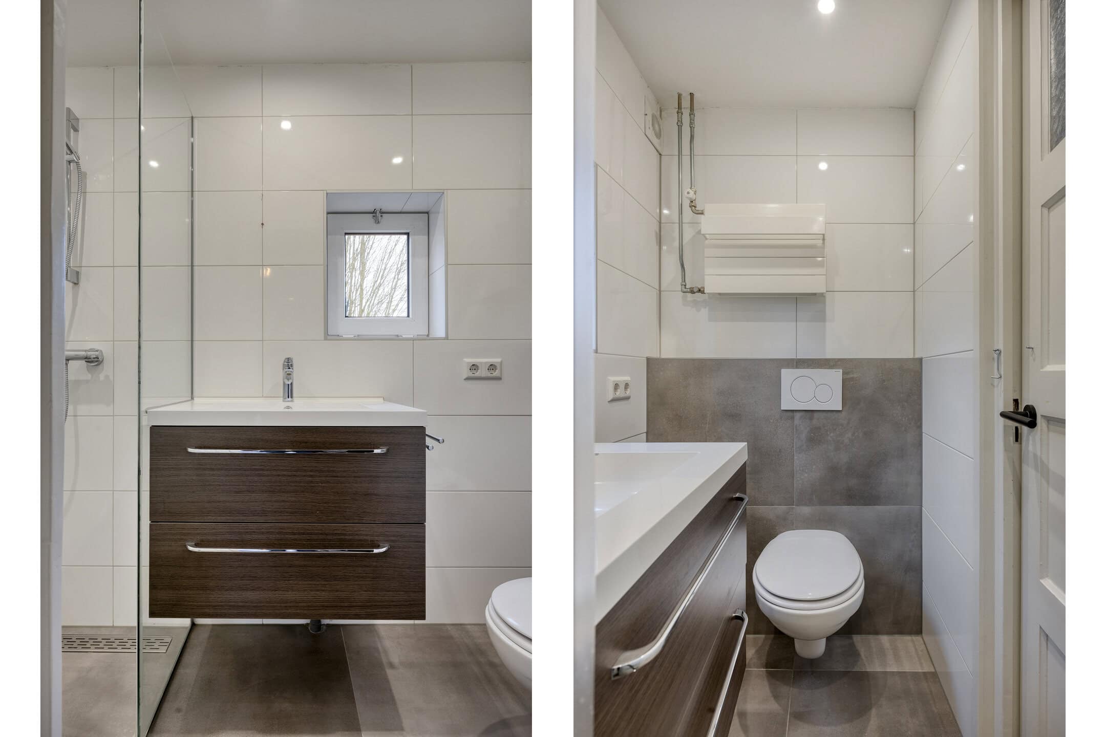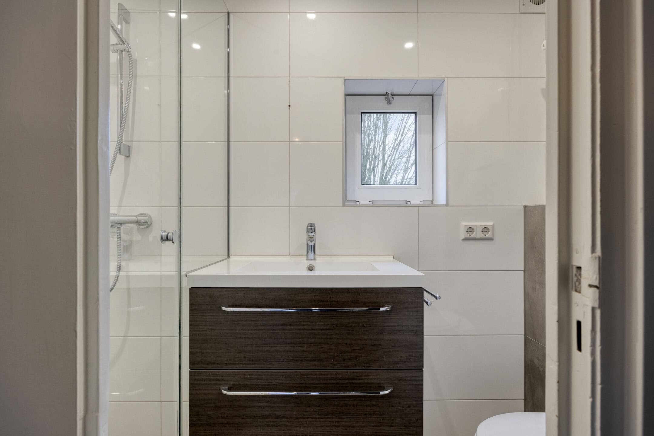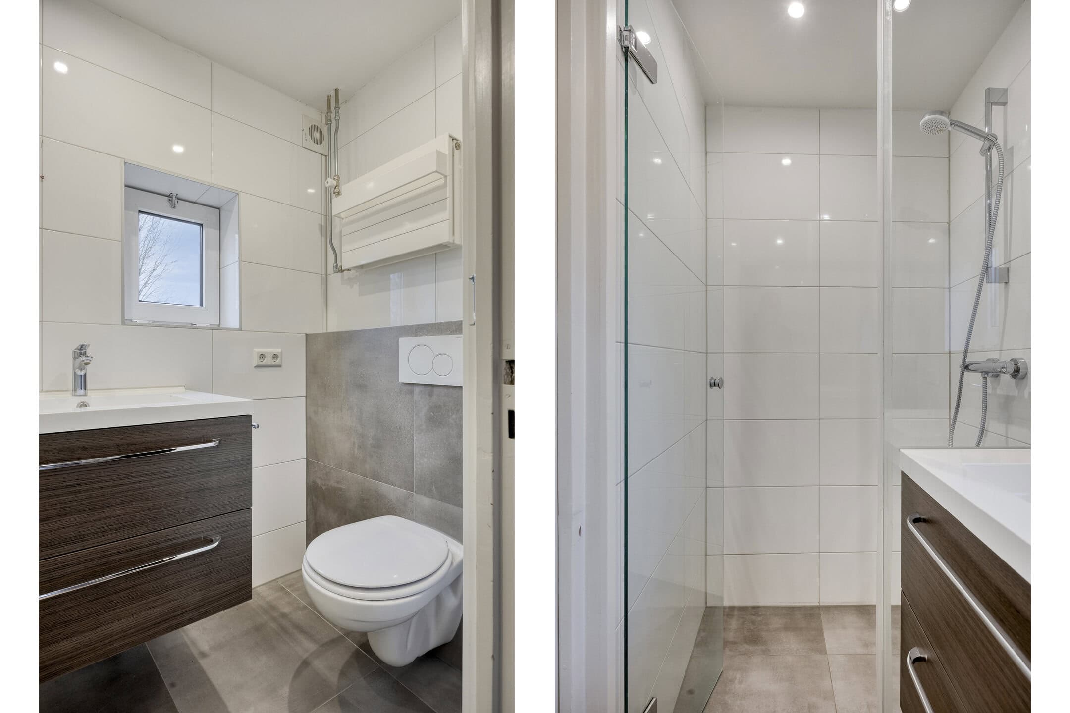 De badkamer is modern en geheel betegeld. Je vindt hier een douchecabine, een wandcloset en een wastafelmeubel. Praktisch, fris en makkelijk schoon te houden.