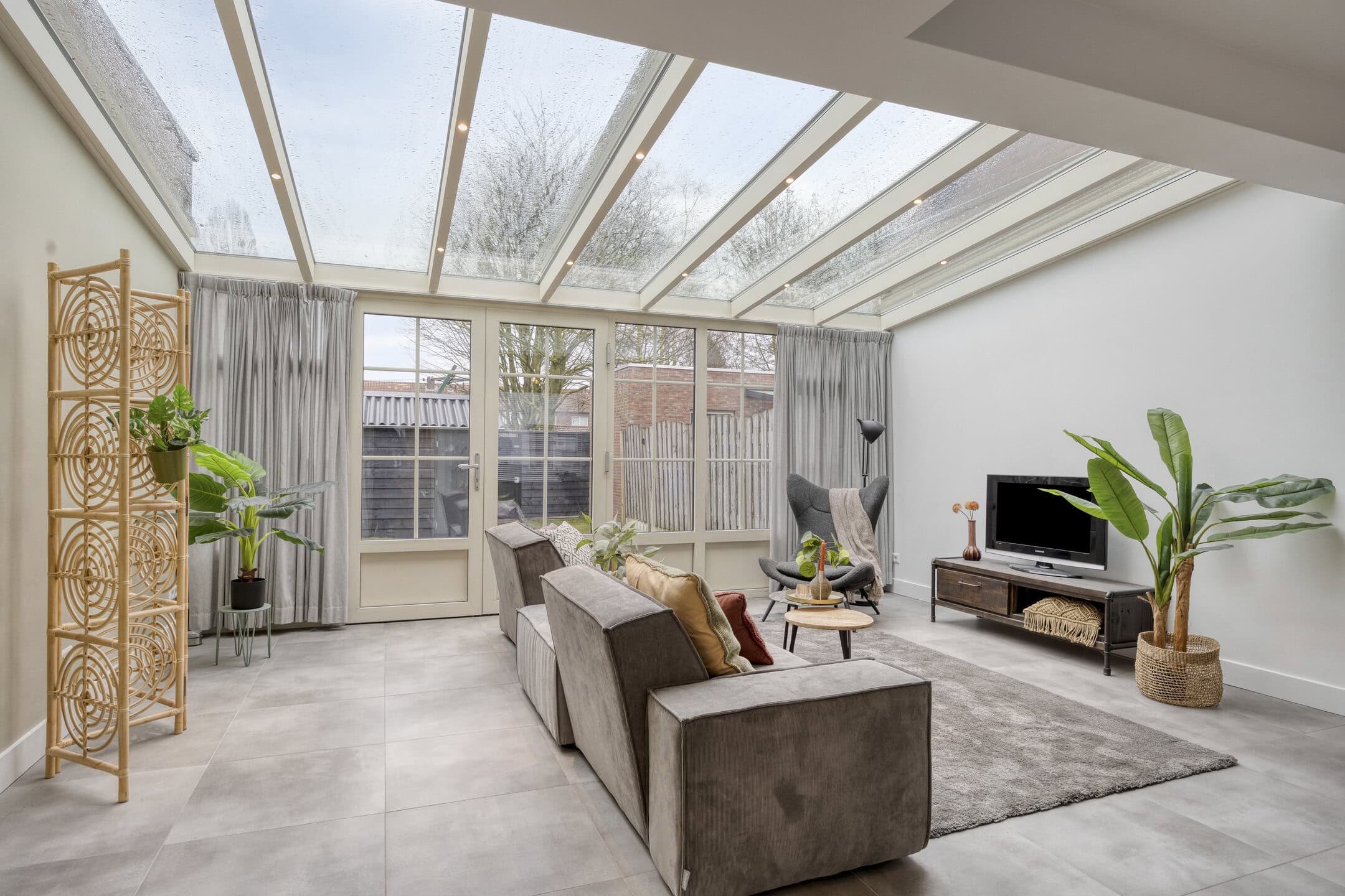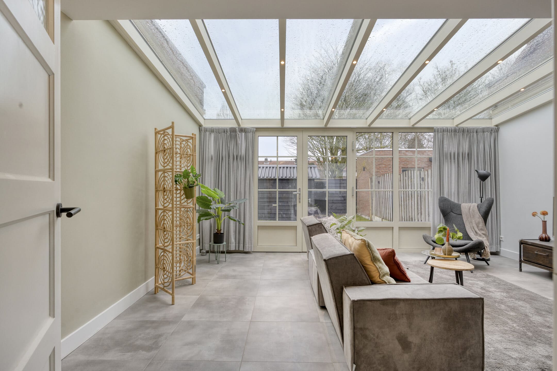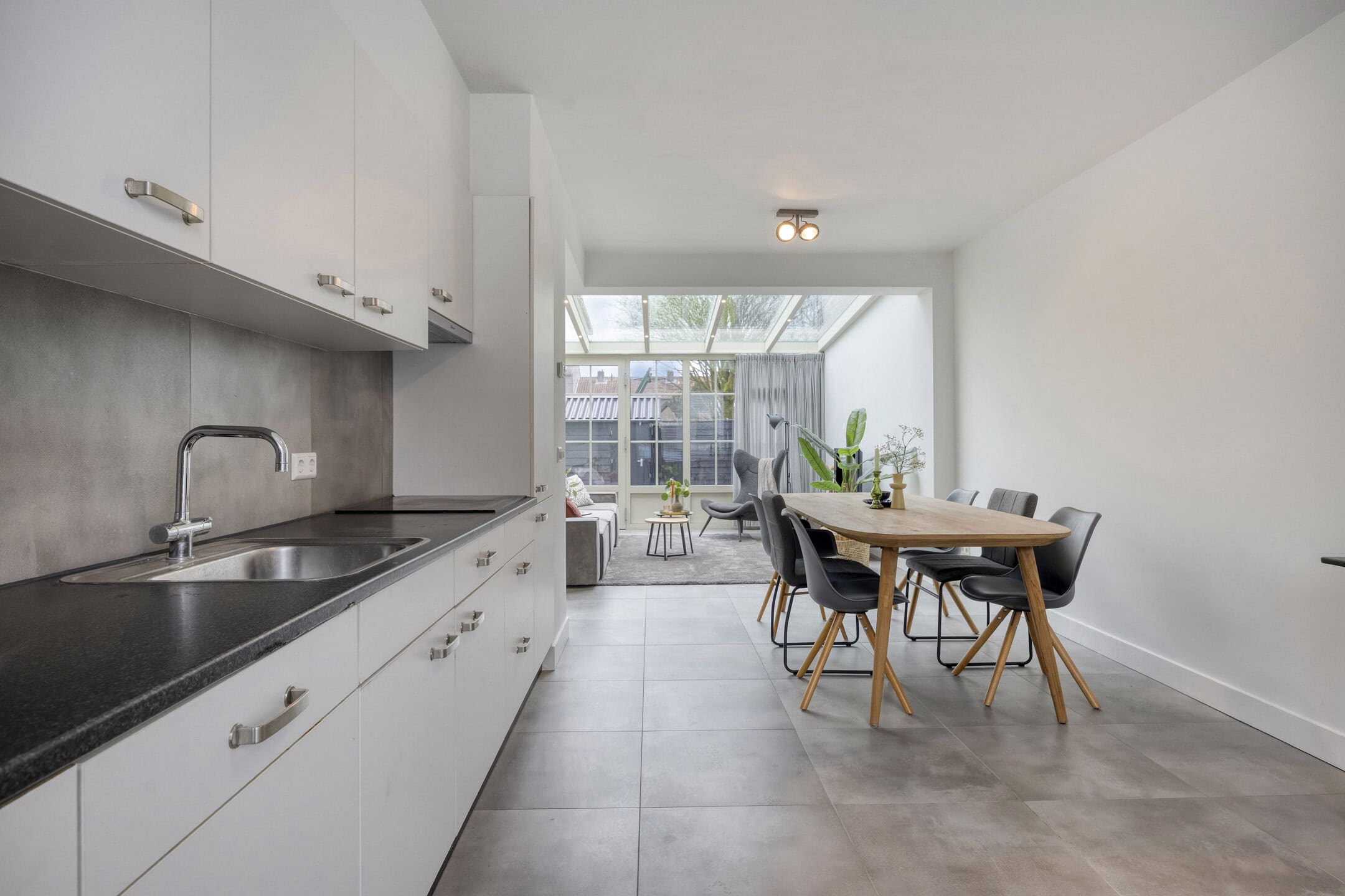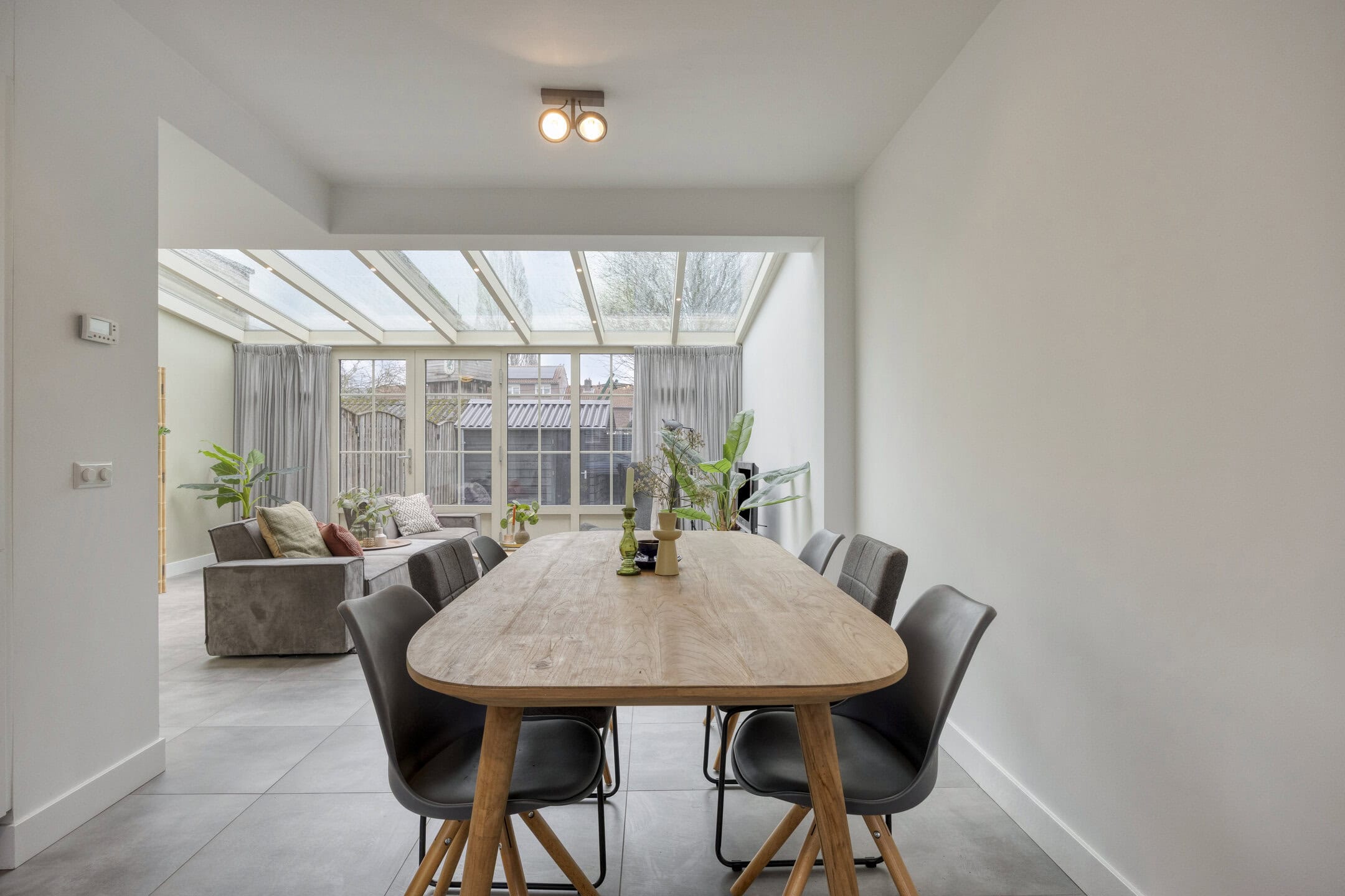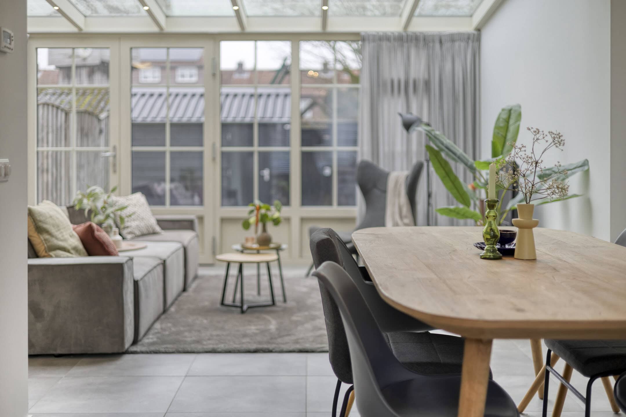 De woonkamer is opvallend ruim door de uitbouw aan de achterzijde. Hier past met gemak een grote bankopstelling, terwijl je ook voldoende ruimte overhoudt voor een lange eettafel of speelhoek. De lichtgrijze tegelvloer met vloerverwarming maakt het geheel rustig en onderhoudsvriendelijk. Via de openslaande tuindeuren betrek je op zonnige dagen de tuin makkelijk bij je woonruimte. Het serredak met elektrische zonwering helpt om het licht mooi te filteren en houdt de temperatuur comfortabel.
