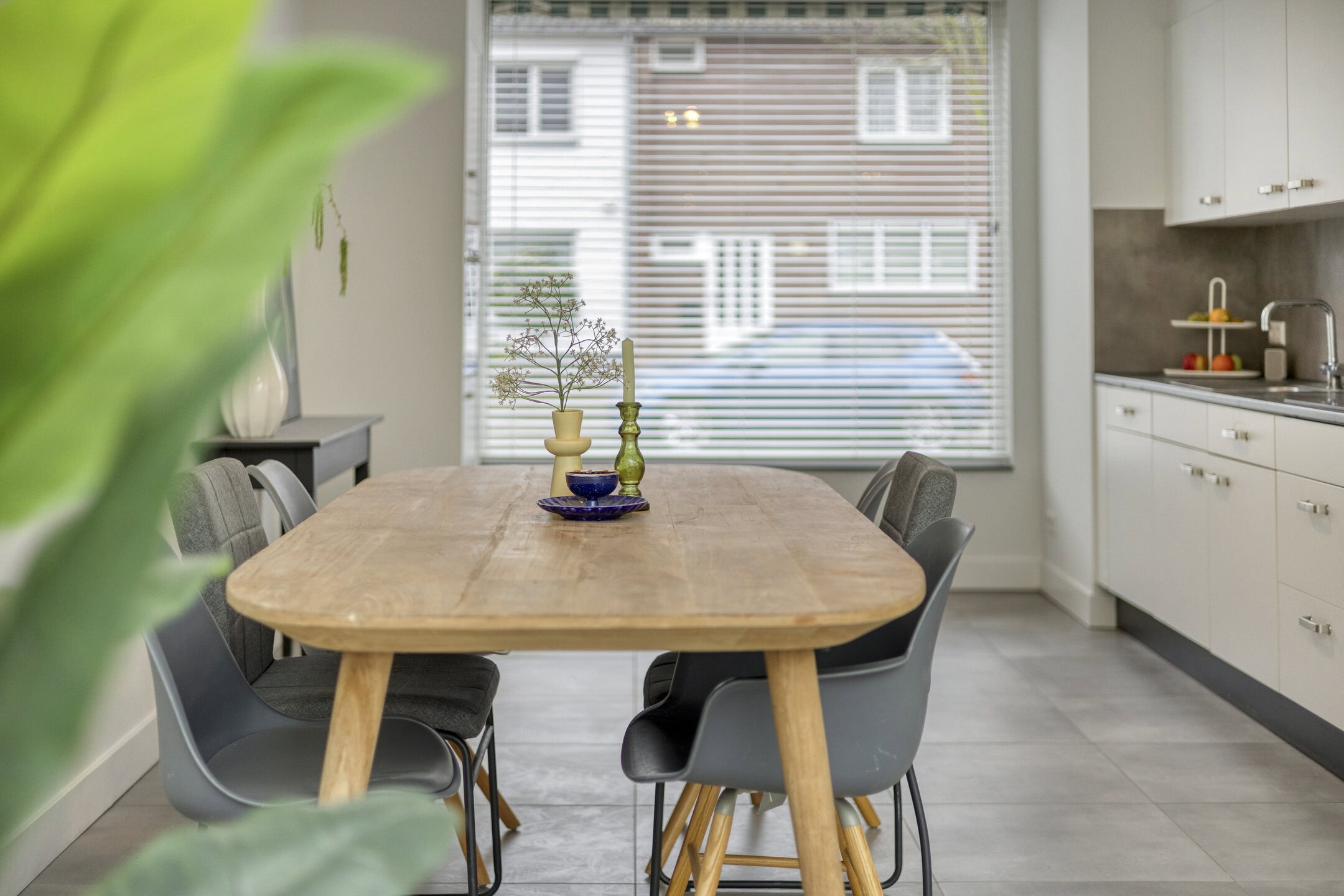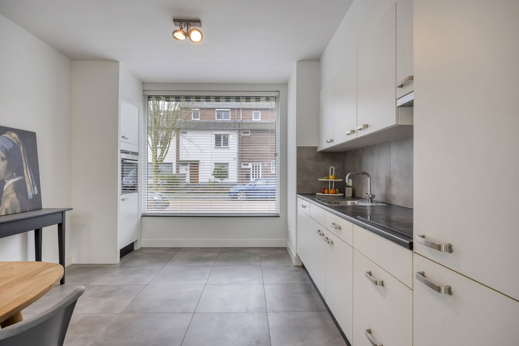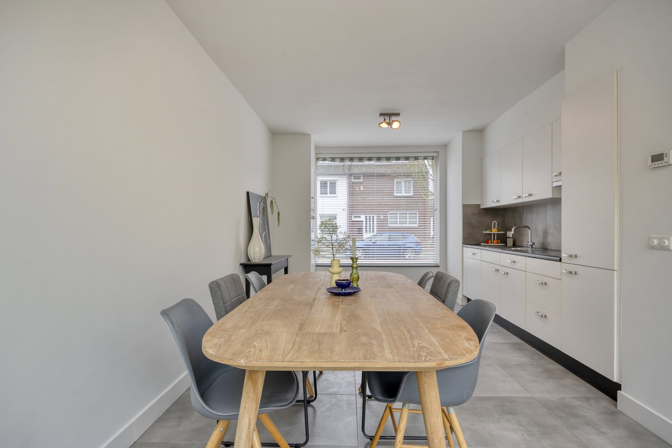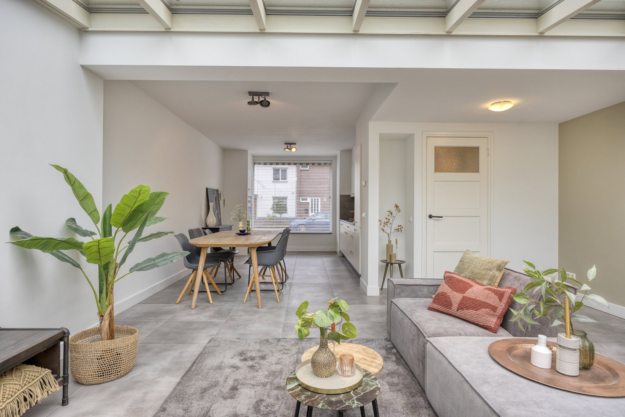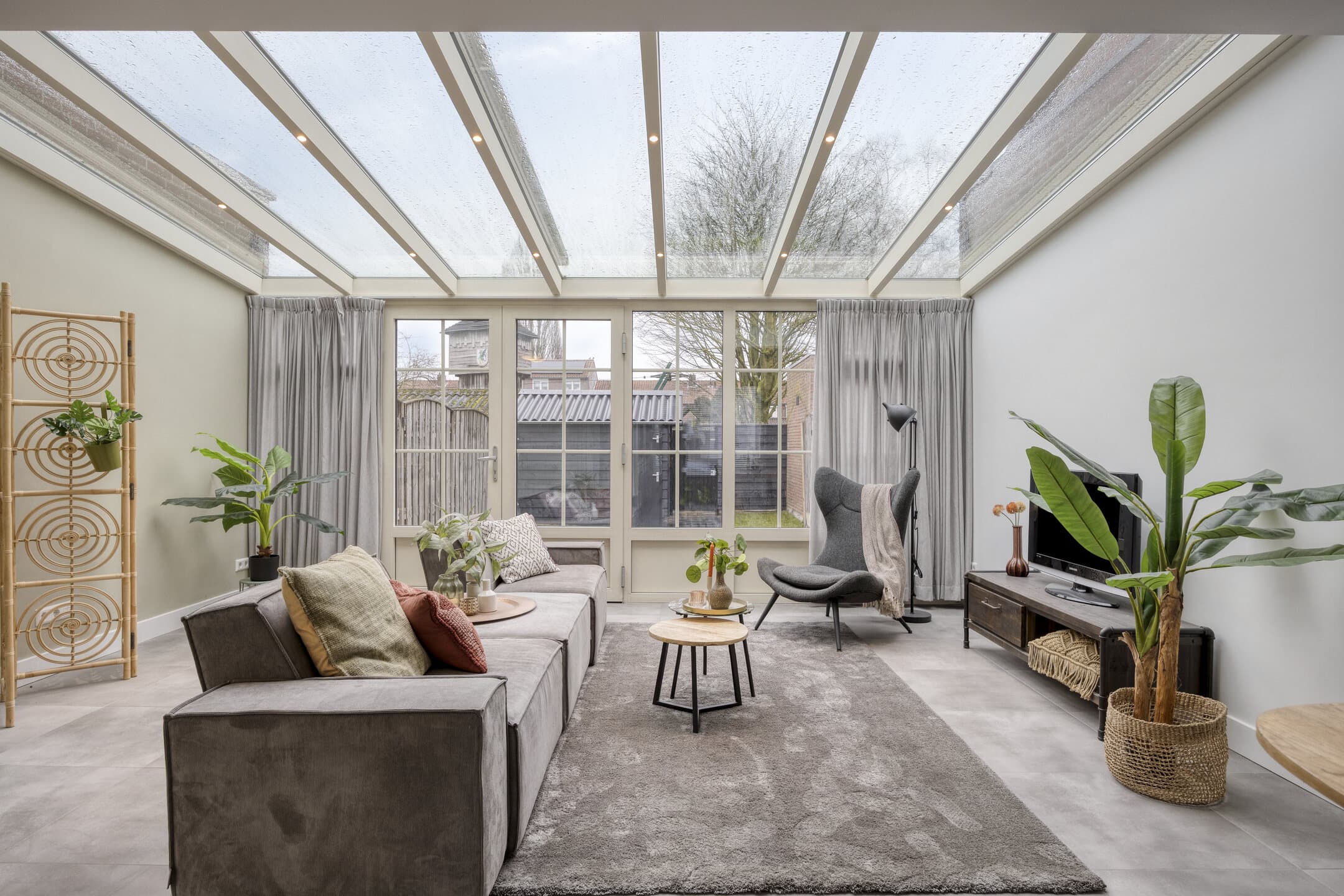 De woonkamer is opvallend ruim door de uitbouw aan de achterzijde. Hier past met gemak een grote bankopstelling, terwijl je ook voldoende ruimte overhoudt voor een lange eettafel of speelhoek. De lichtgrijze tegelvloer met vloerverwarming maakt het geheel rustig en onderhoudsvriendelijk. Via de openslaande tuindeuren betrek je op zonnige dagen de tuin makkelijk bij je woonruimte. Het serredak met elektrische zonwering helpt om het licht mooi te filteren en houdt de temperatuur comfortabel.