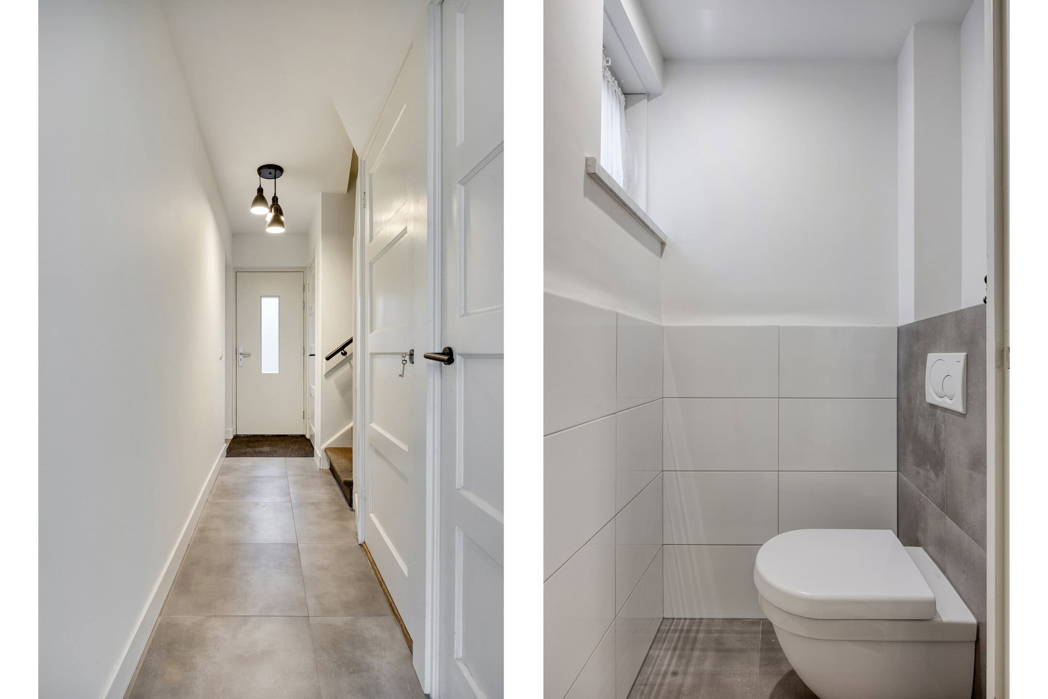De toiletruimte is modern betegeld en uitgevoerd met een wandcloset. Netjes afgewerkt en prettig in gebruik voor dagelijks gemak en bezoek.