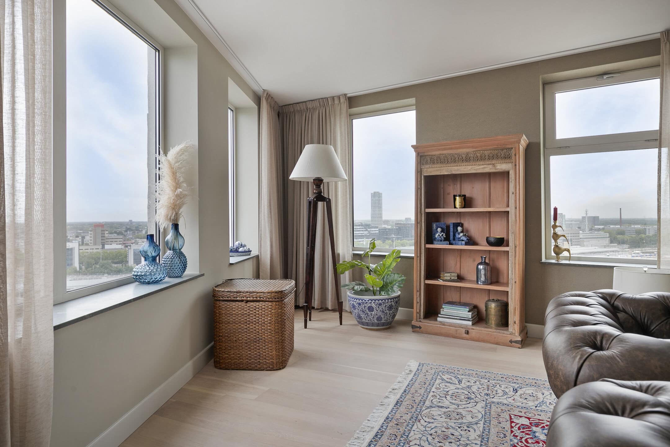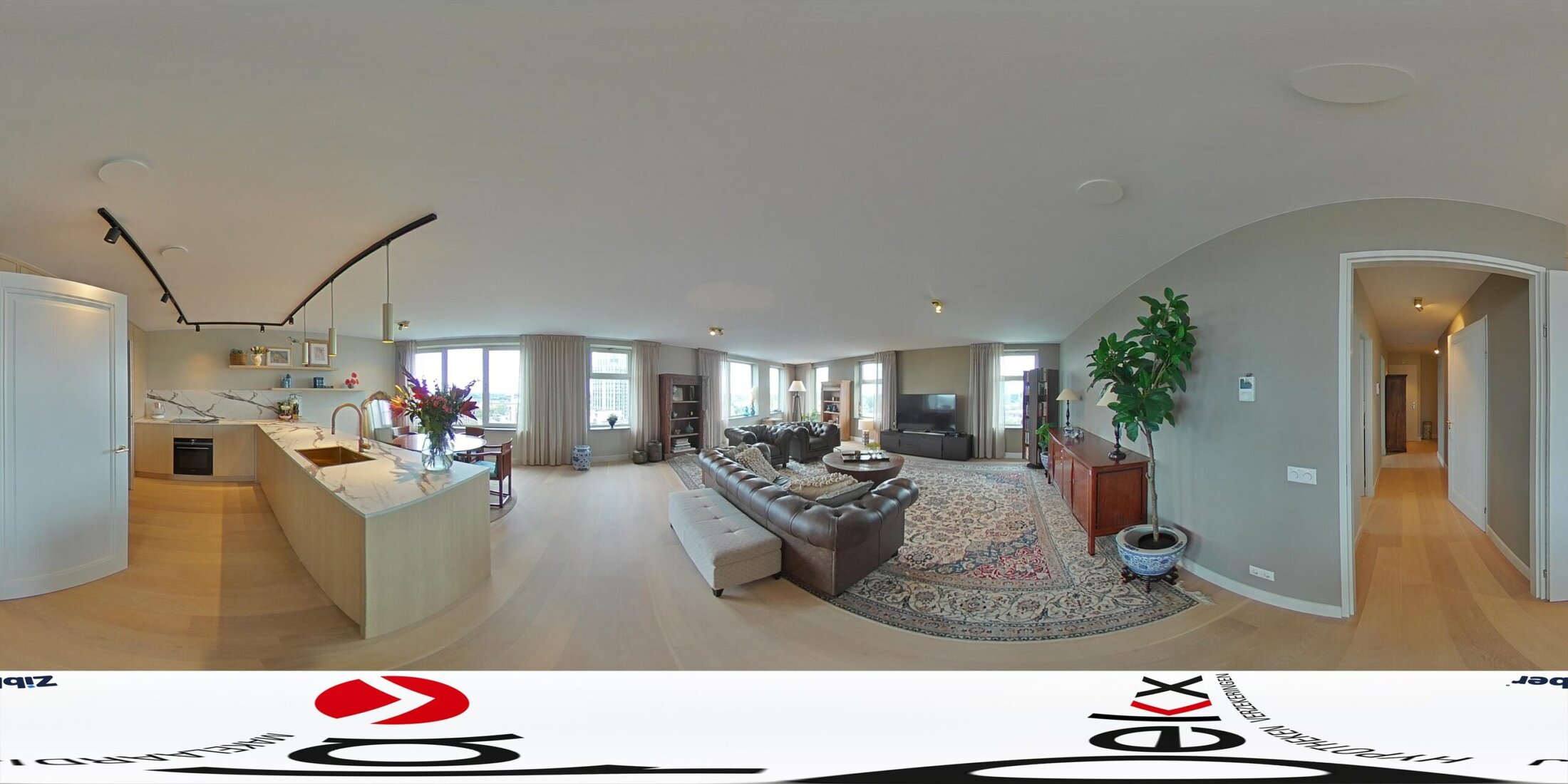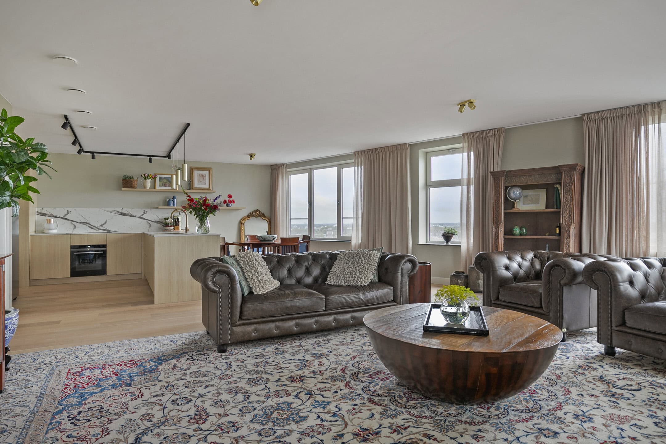 De royale living valt direct op door de overvloed aan licht. Grote ramen met lage vensterbanken zorgen voor een panoramisch uitzicht, waarbij de zonsondergang elke dag een bijzonder schouwspel biedt. De eikenhouten vloer en de strakke afwerking geven de ruimte een warme uitstraling.