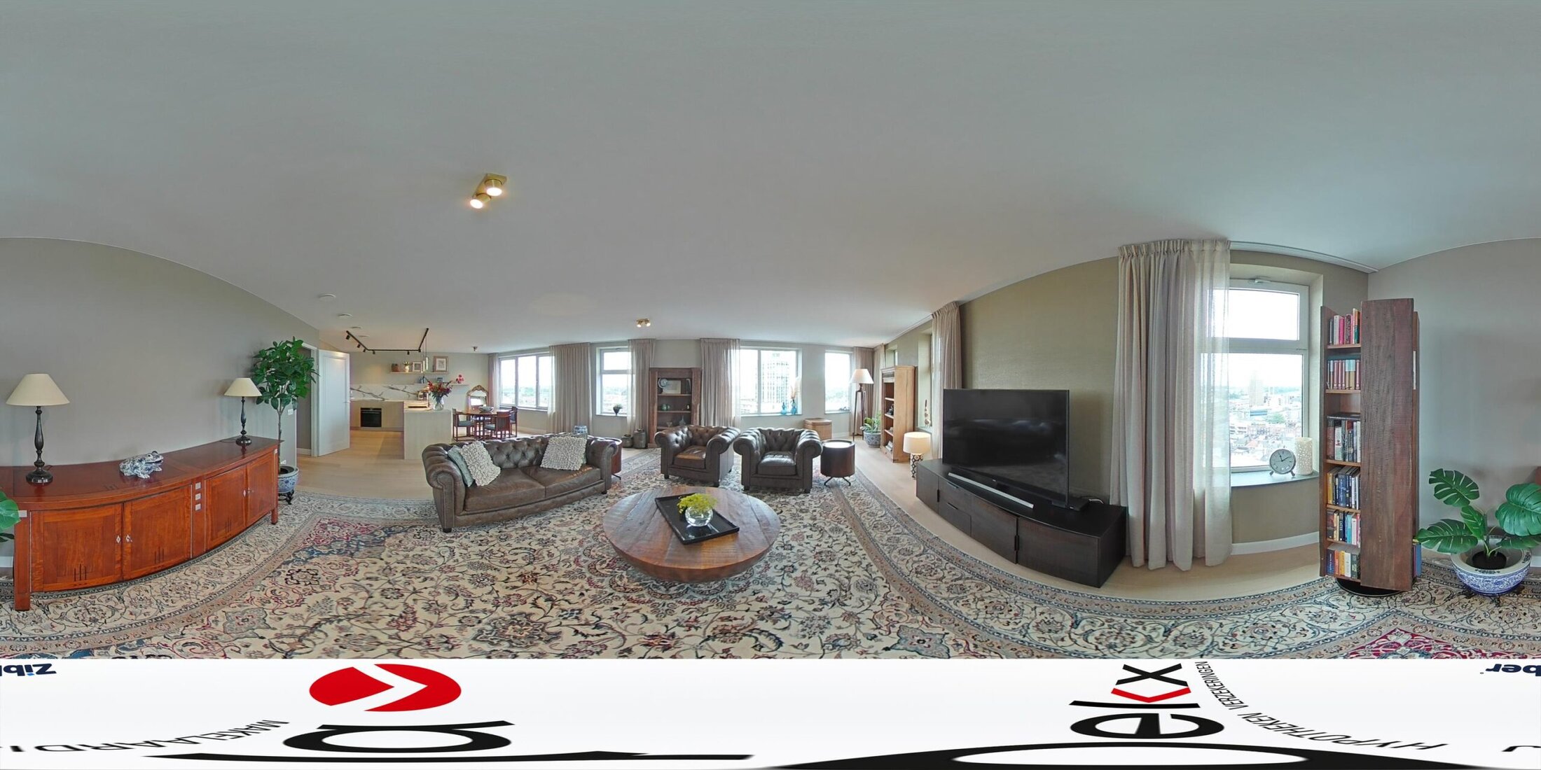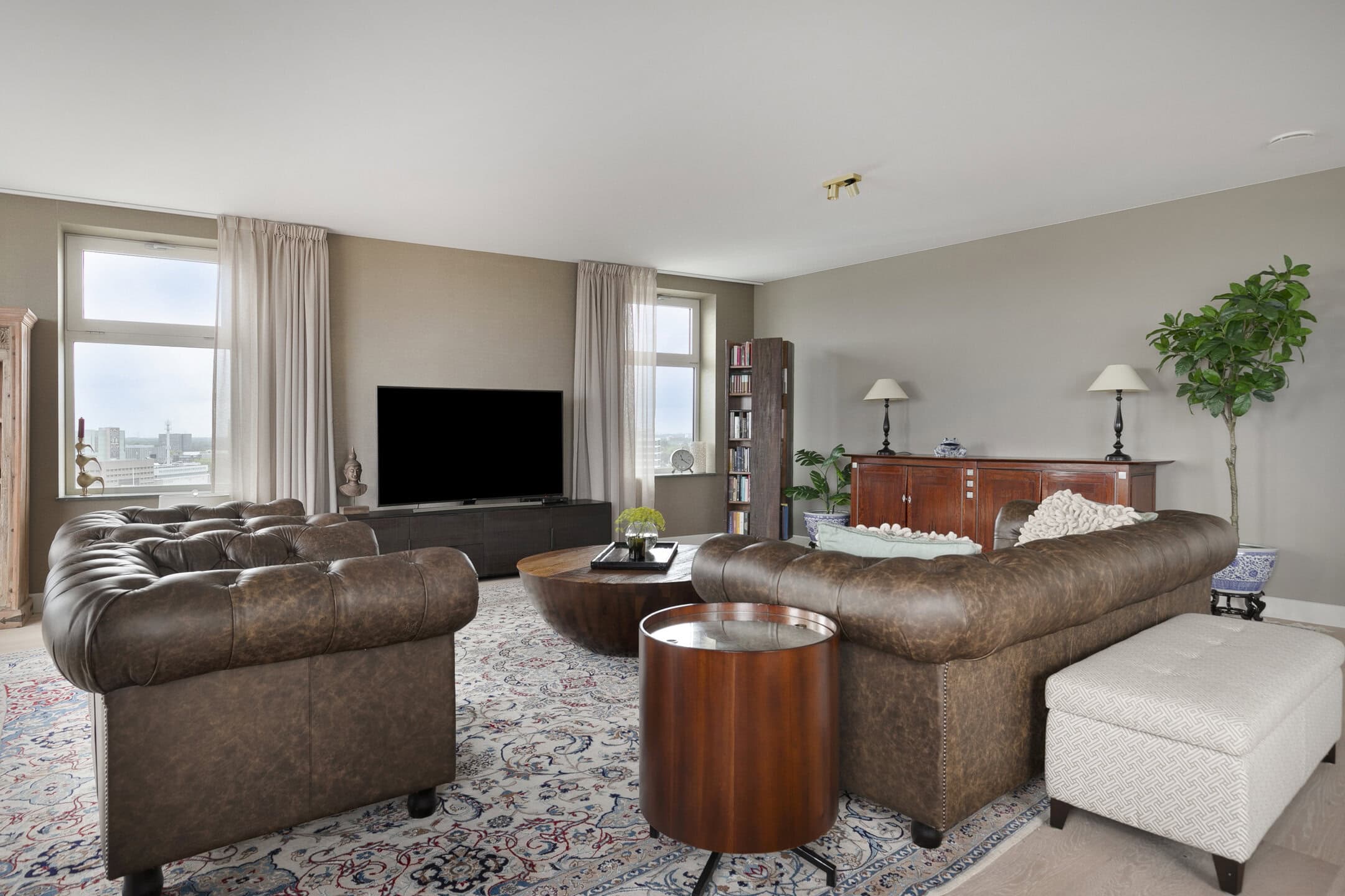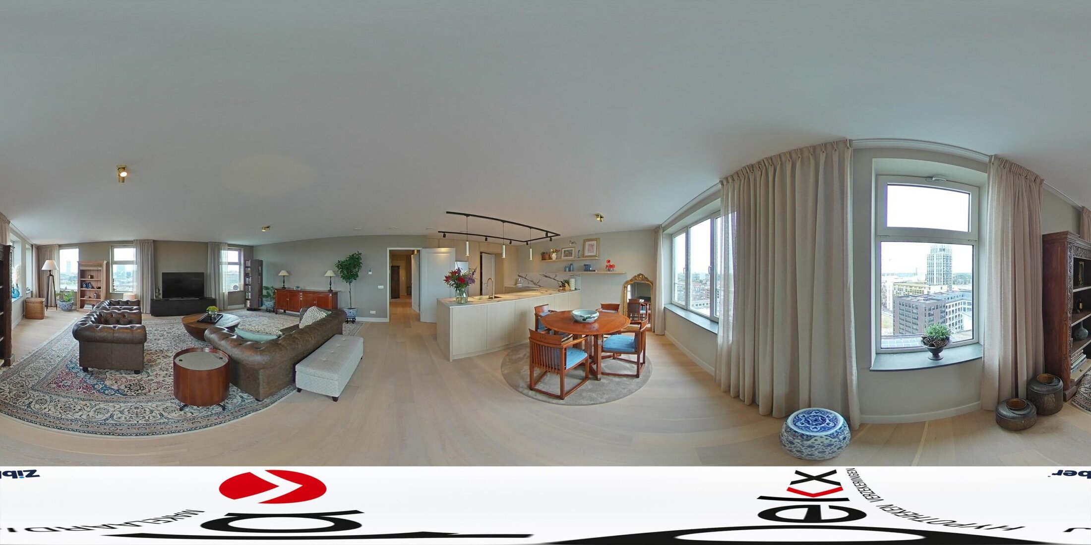 De royale living valt direct op door de overvloed aan licht. Grote ramen met lage vensterbanken zorgen voor een panoramisch uitzicht, waarbij de zonsondergang elke dag een bijzonder schouwspel biedt. De eikenhouten vloer en de strakke afwerking geven de ruimte een warme uitstraling.