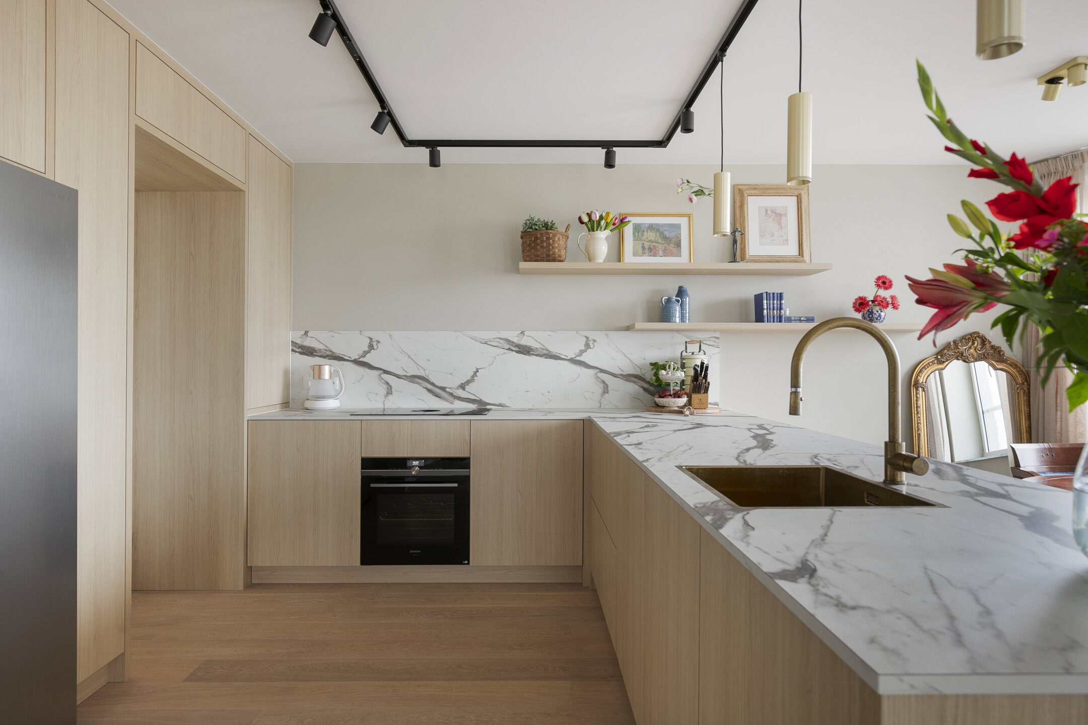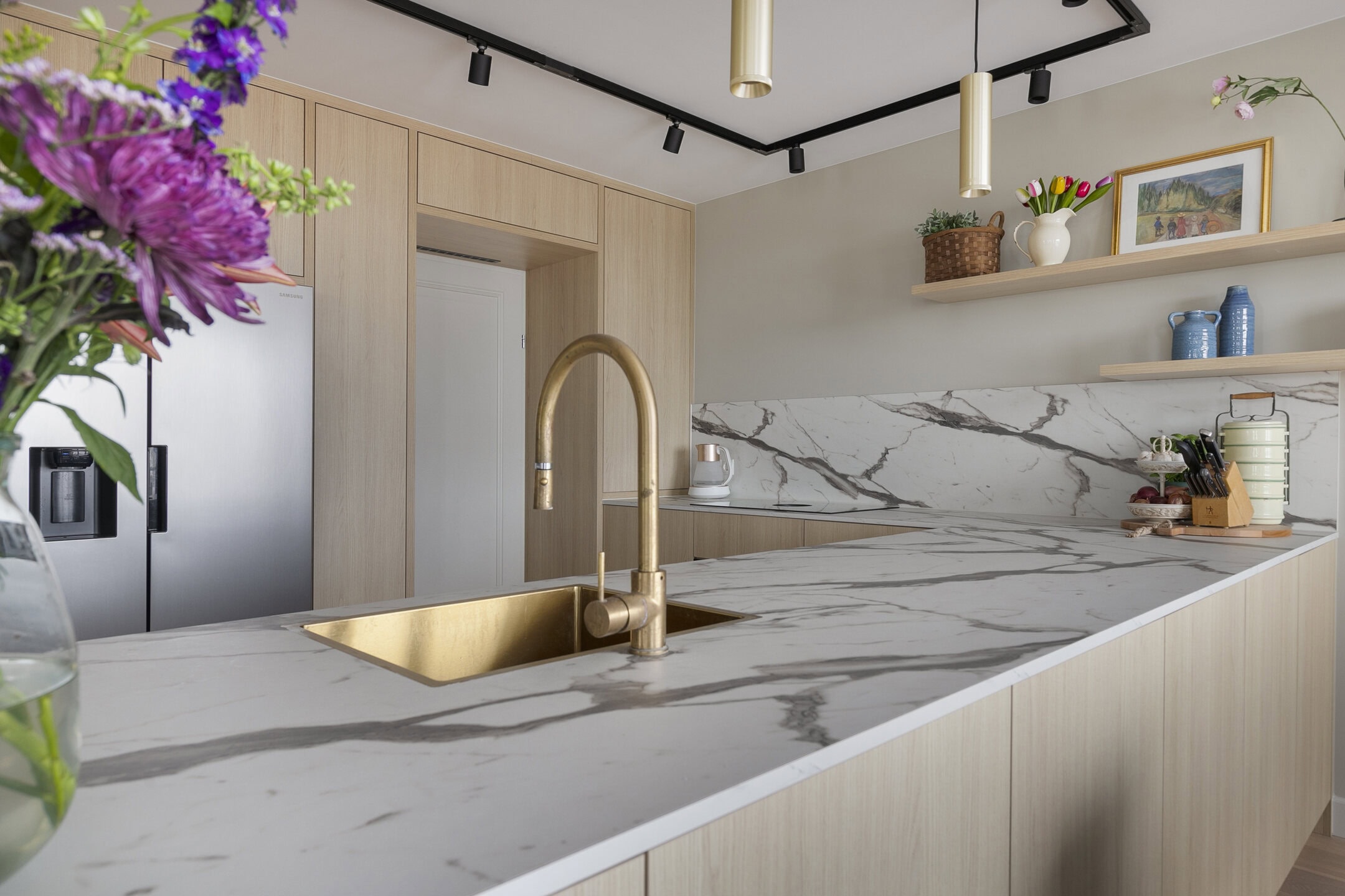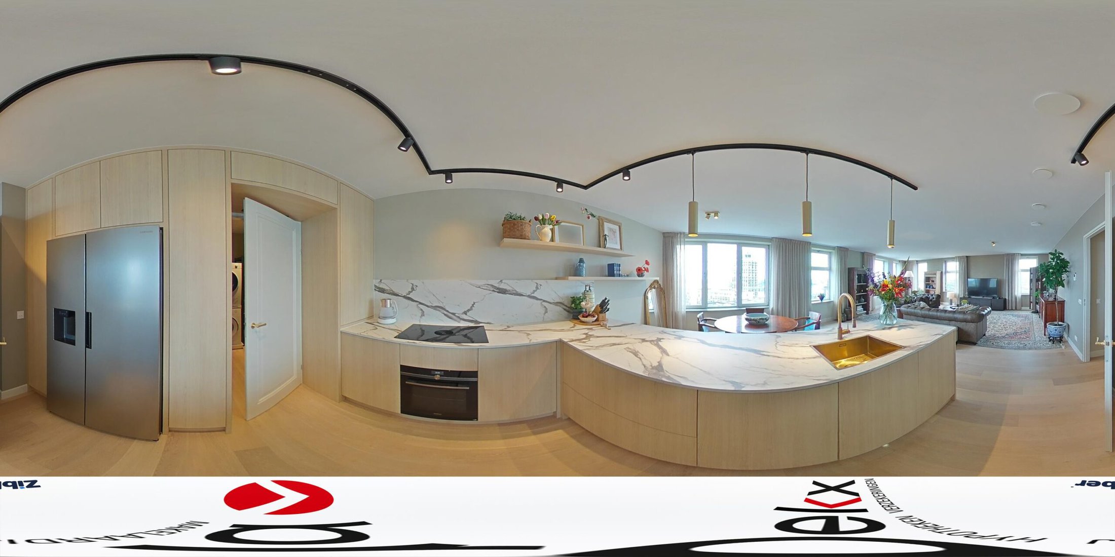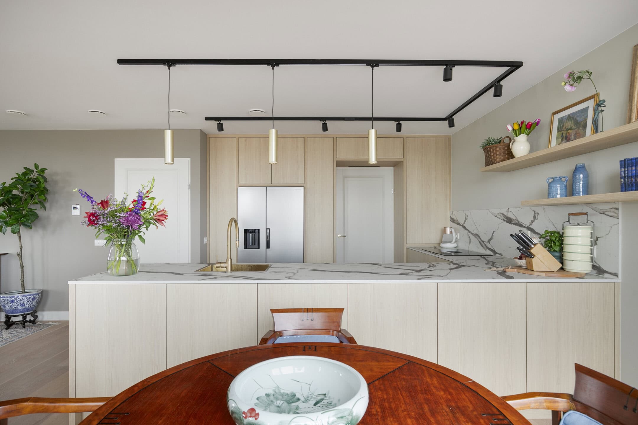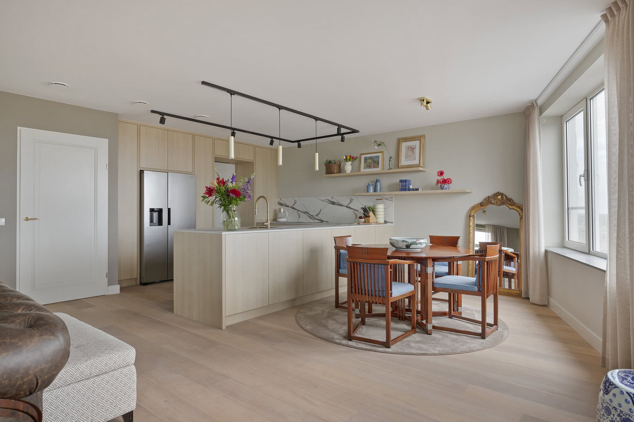De open maatwerkkeuken vormt het hart van het appartement. Het grote spoeleiland nodigt uit tot samen koken en borrelen, terwijl de hoogwaardige inbouwapparatuur van A-merken het comfort verhoogt. Zo beschikt de keuken onder andere over een Bora inductiekookplaat met geïntegreerde afzuiging, een Amerikaanse koelkast met ijsdispenser, een vaatwasser en een oven.