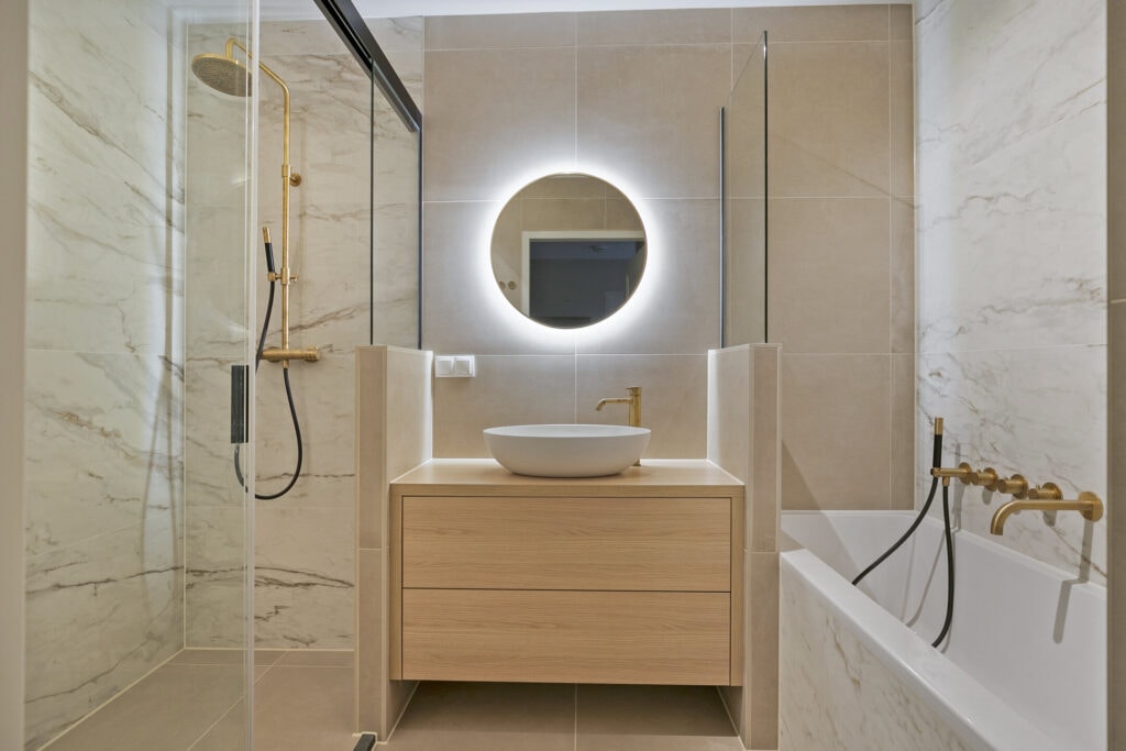De luxe badkamer is voorzien van een ligbad, inloopdouche, stijlvol wastafelmeubel en hoogwaardige inbouwkranen.