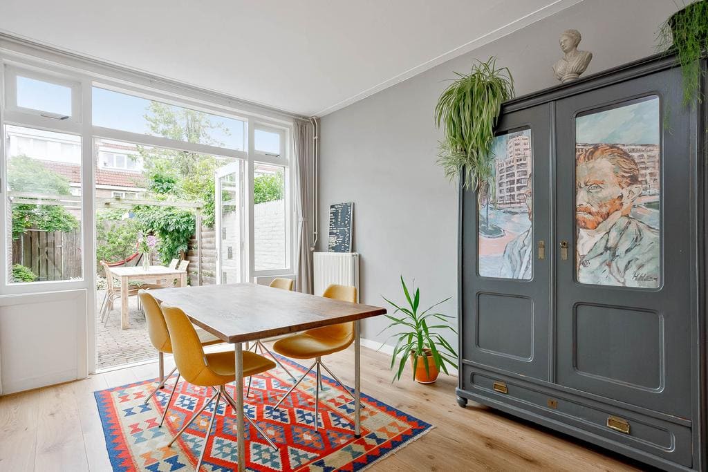 Aan de achterzijde is de ruime eetkamer gesitueerd. Deze ruimte geniet van veel lichtinval door de dubbele openslaande deuren en grote raampartijen aan de achterzijde. Deze ruimte is voorzien van een vaste inbouwkast.