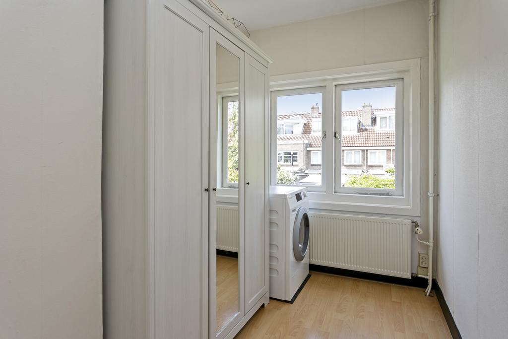 Slaapkamer 3) is aan achterzijde gelegen en betreft een fijne kinder of werkkamer. Deze kamer is voorzien voor de aansluiting van het witgoed en wordt daarom gebruikt als garderobe ruimte en waskamer.