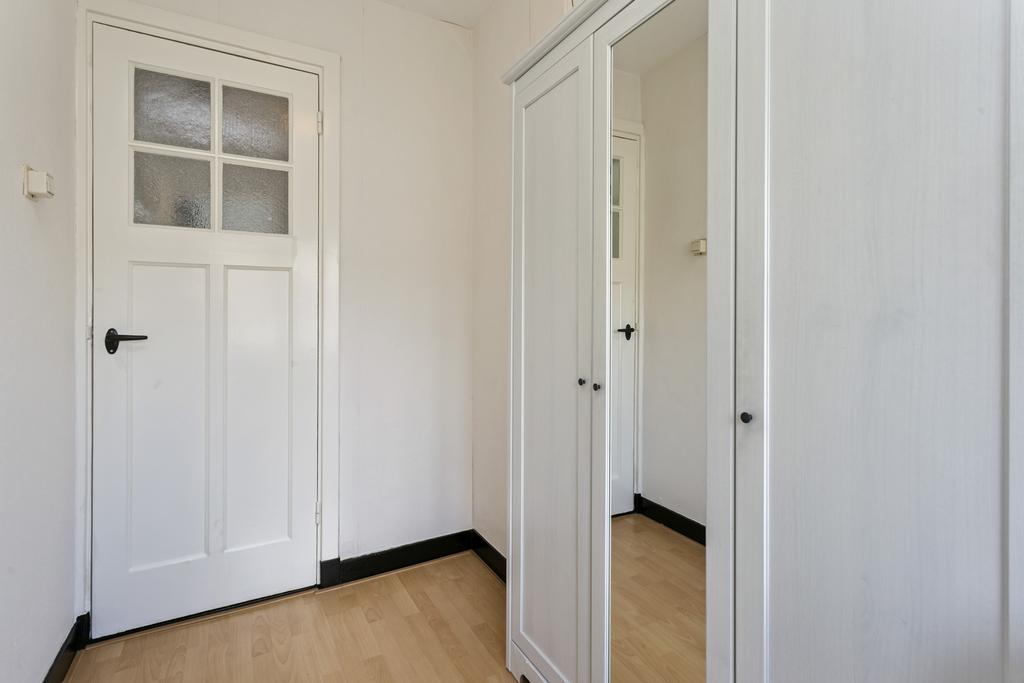 De ontvangsthal geeft toegang tot de meterkast, trapopgang naar eerste verdieping, trapkast, toiletruimte, keuken en woonkamer.