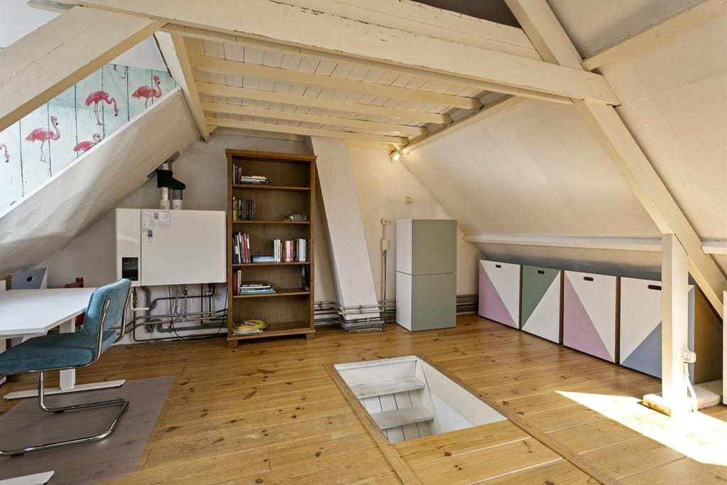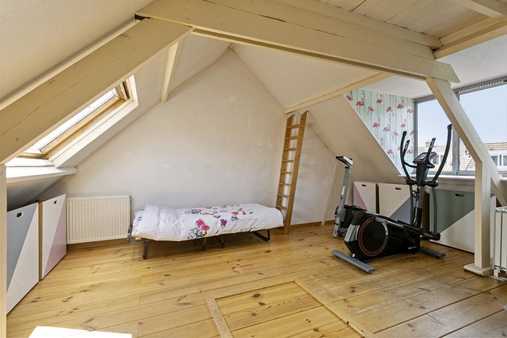 De ruimte is fraai afgewerkt met een houten vloer en is ideaal te gebruiken als (master)bedroom of kantoorruimte. De spullen kun je op de handige vliering opbergen, ideaal!