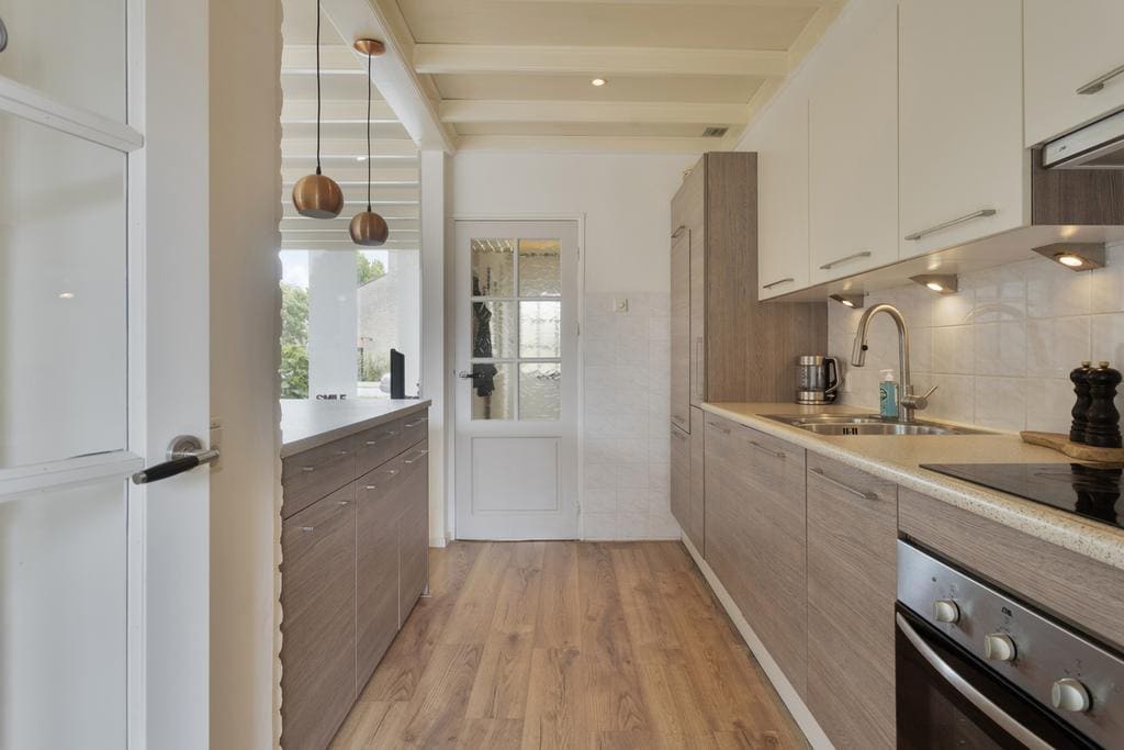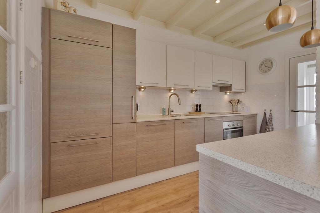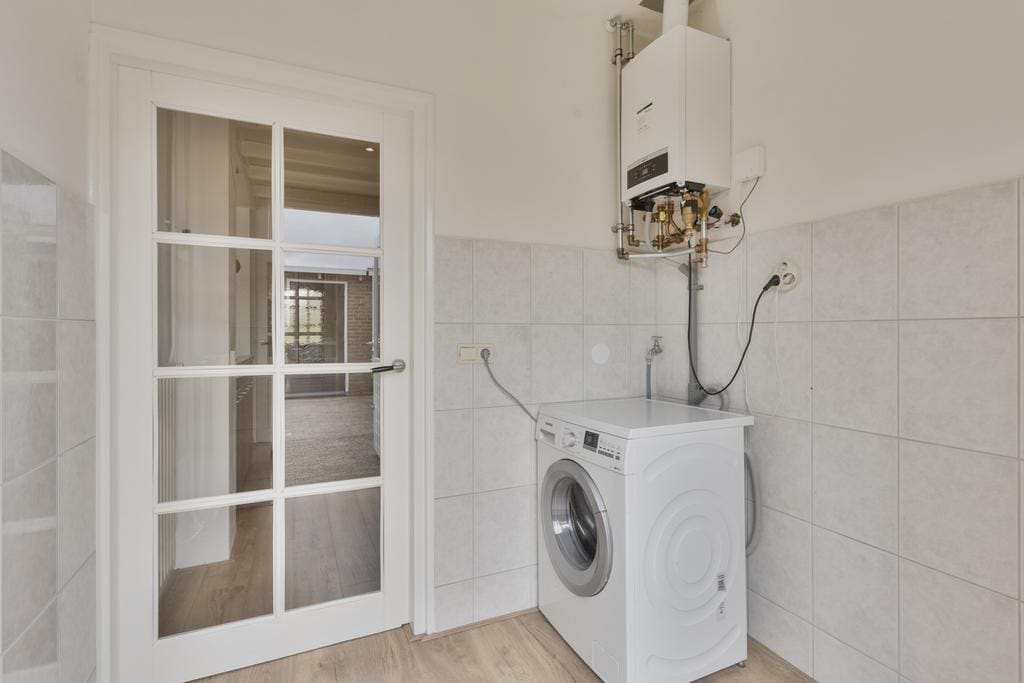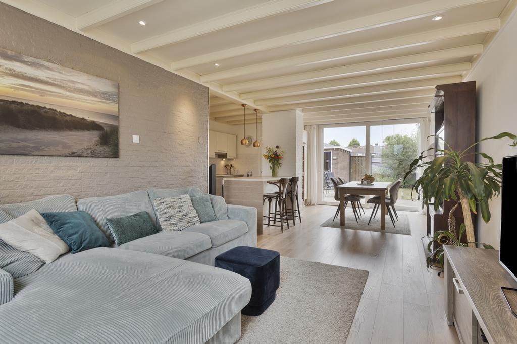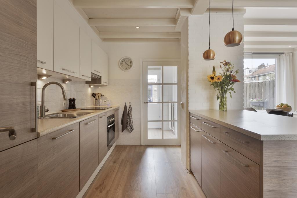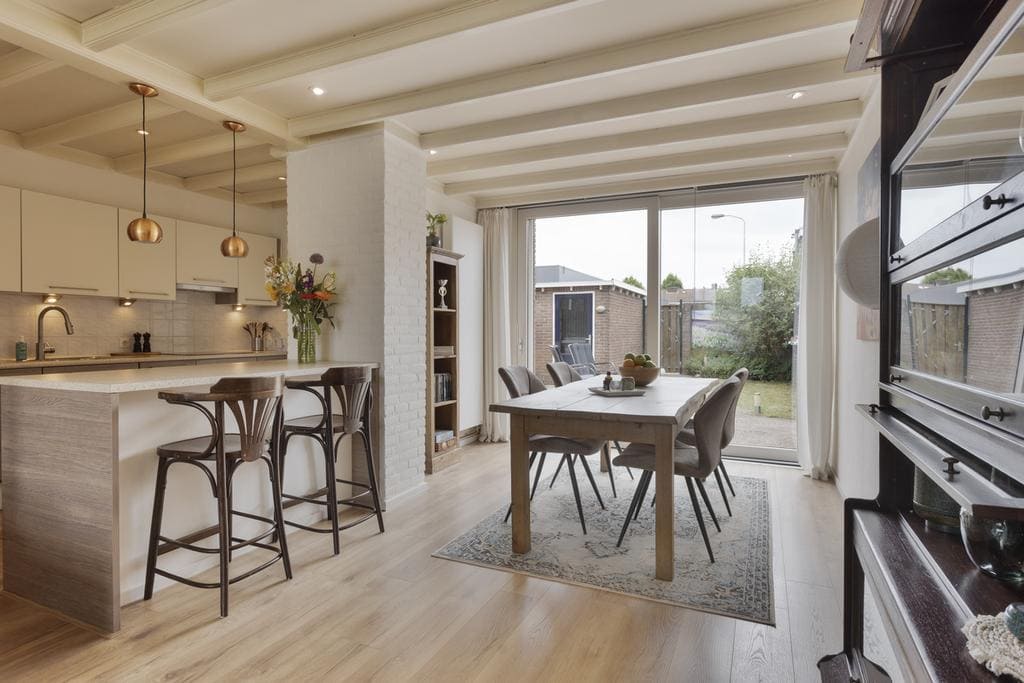 Je stapt binnen via de voordeur in een ruime hal. Hier vind je de vaste trap naar de eerste verdieping, een handige trappenkast, de meterkast en het toilet met fonteintje. Vanuit de hal loop je door naar de woonkamer, waar je in de open keuken komt. De keuken is uitgerust met een bar, wandkasten en apparatuur zoals een inductiekookplaat, vaatwasser, oven en koelkast met vriesvak. De centrale bar is een fijne plek om aan te werken, omdat het een connectie geeft met de woonkamer. Naast de keuken leidt een deur naar de bijkeuken, die tevens dienst kan doen als wasruimte dankzij de aanwezige witgoedaansluitingen. In de berging vind je ook de c.v.-ketel. De woonkamer is compleet uitgerust met een lichte laminaatvloer en biedt voldoende ruimte voor een zitgedeelte en eettafel. De grote schuifpui aan de achterzijde zorgt er voor dat de zon goed doorkomt, waardoor je ook in het voor- en najaar kunt genieten van genoeg lichtinval in de woonkamer. Via de schuifpui stap je zo de tuin in.