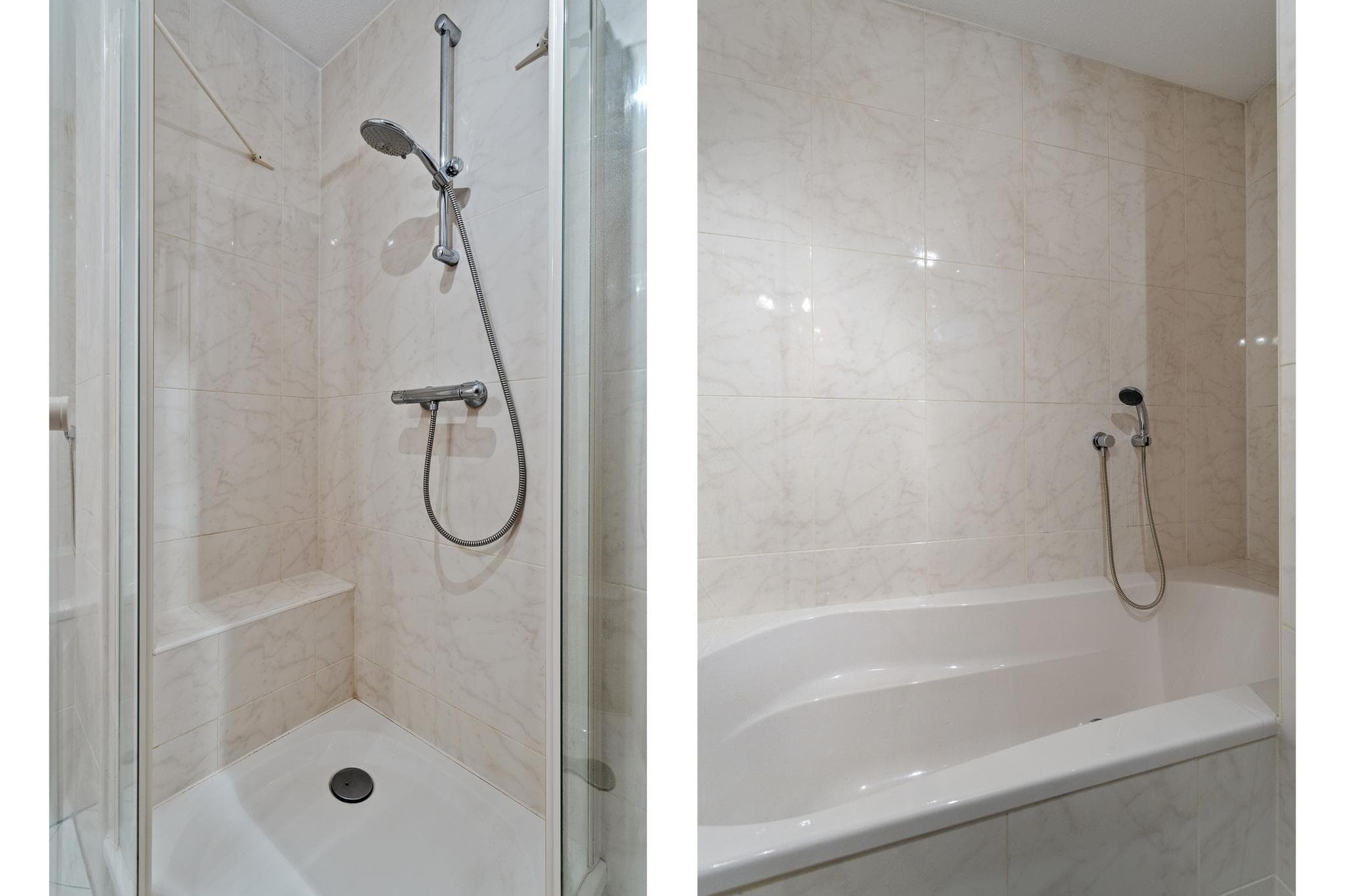 De complete badkamer is volledig betegeld en uitgerust met een douchecabine, ligbad, tweede toilet en een wastafel. Daarnaast zijn er een badkamermeubel, designradiator en een fraaie spiegel aanwezig.