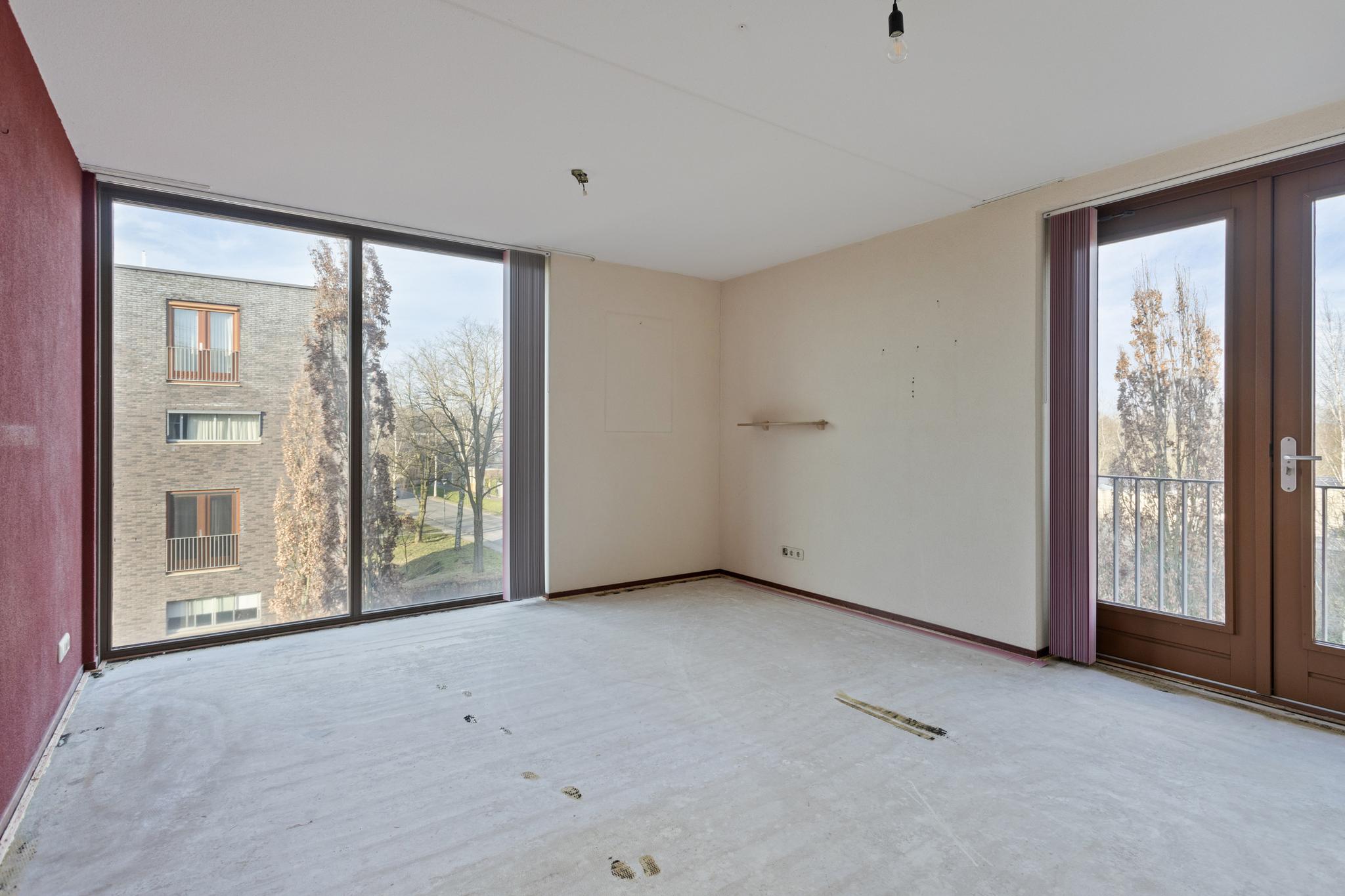 Het appartement beschikt over twee slaapkamers. De hoofdslaapkamer is bijzonder ruim en licht door de grote ramen tot aan de grond en biedt voldoende ruimte voor een tweepersoonsbed en een kledingkast. De tweede slaapkamer met vloerbedekking is ideaal als logeerkamer, werkkamer of kinderkamer. Beide kamers beschikken over openslaande deuren met frans balkon.