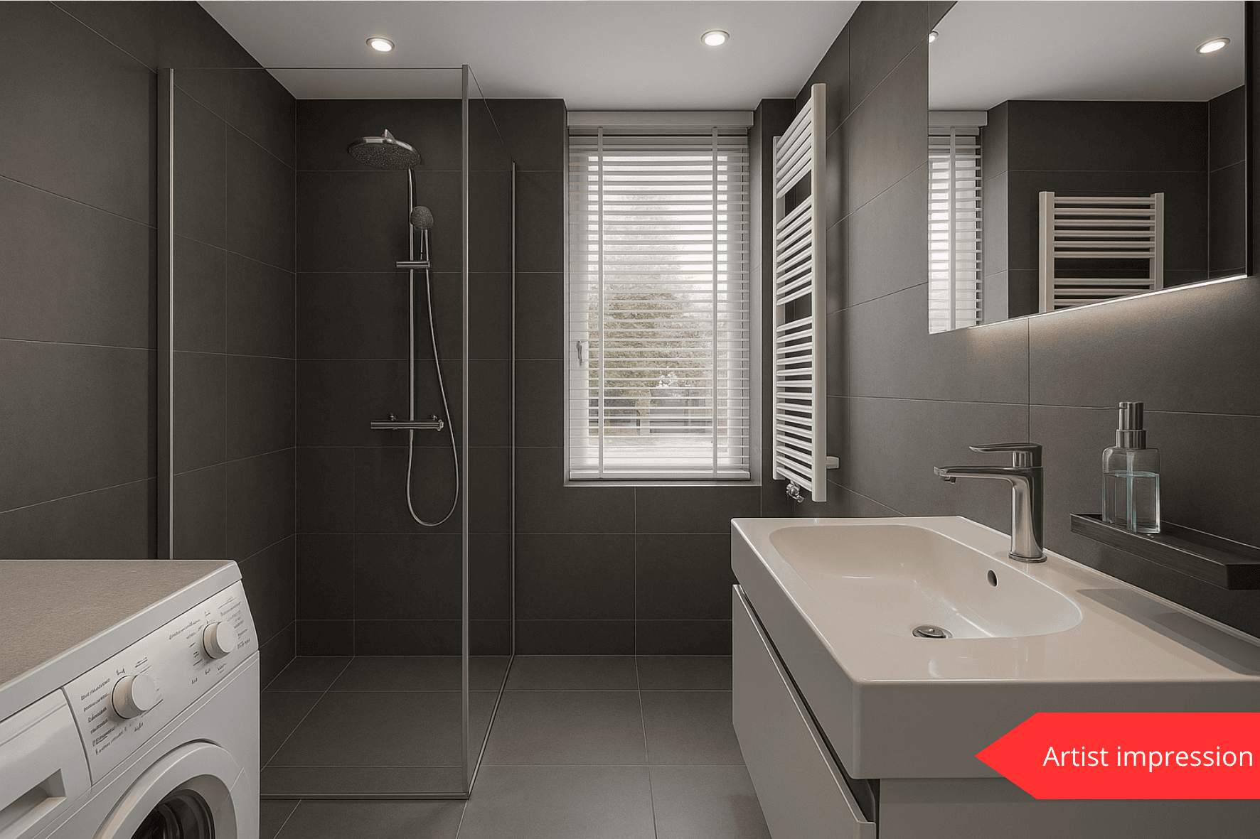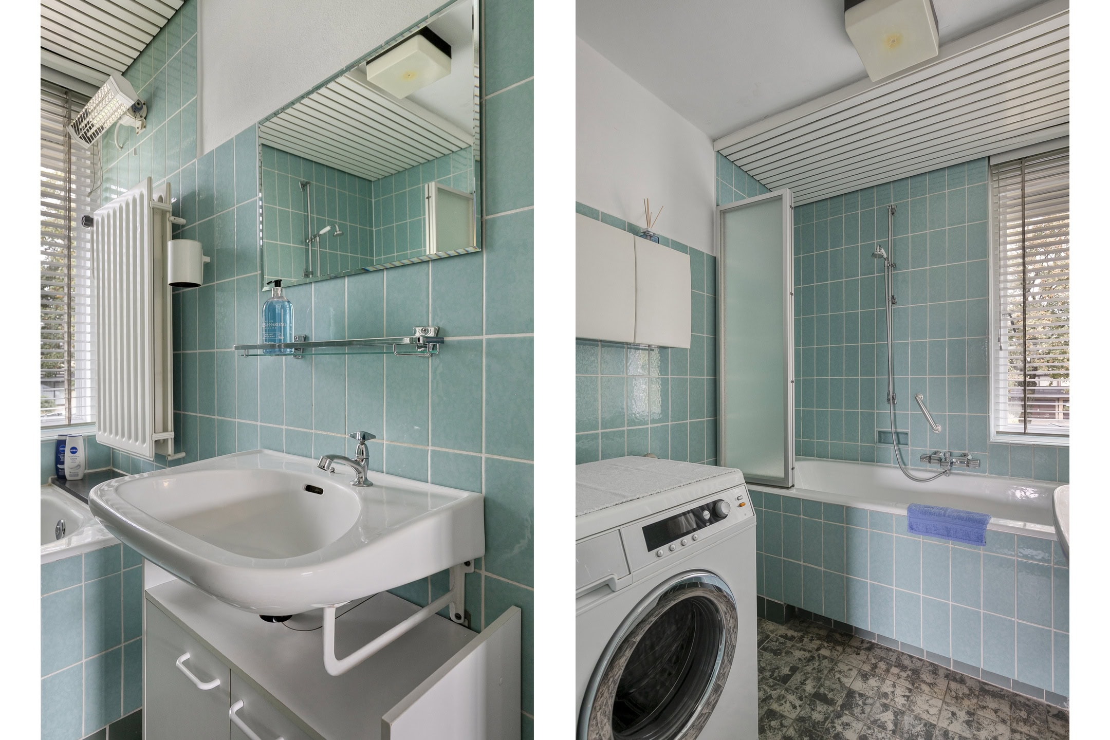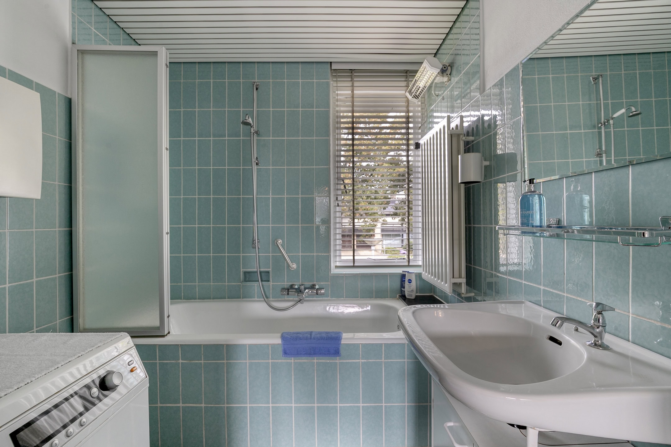 De badkamer is keurig verzorgd en voorzien van een ligbad met douche en een wastafel. Wie graag een moderne wellnessruimte creëert, kan hier eenvoudig een frisse update doorvoeren dankzij de praktische indeling en het raam dat zorgt voor natuurlijke ventilatie.