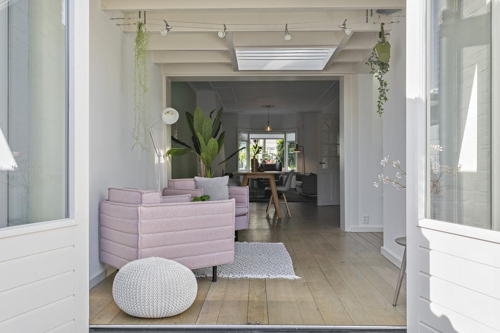 De hal is voorzien van een antraciete tegelvloer (60×60 cm). In de hal bevindt zich de gerenoveerde trapopgang naar de eerste verdieping en de vernieuwde meterkast. De woonkamer heeft een bijzonder sfeervolle voorkamer met een erker en een open haard. De ruimte is voorzien van een eikenhouten plankenvloer. Aan de achterzijde is de woning uitgebouwd en geven openslaande deuren toegang tot de tuin.