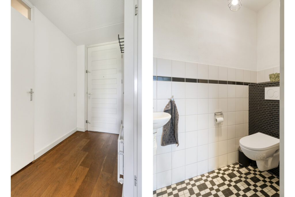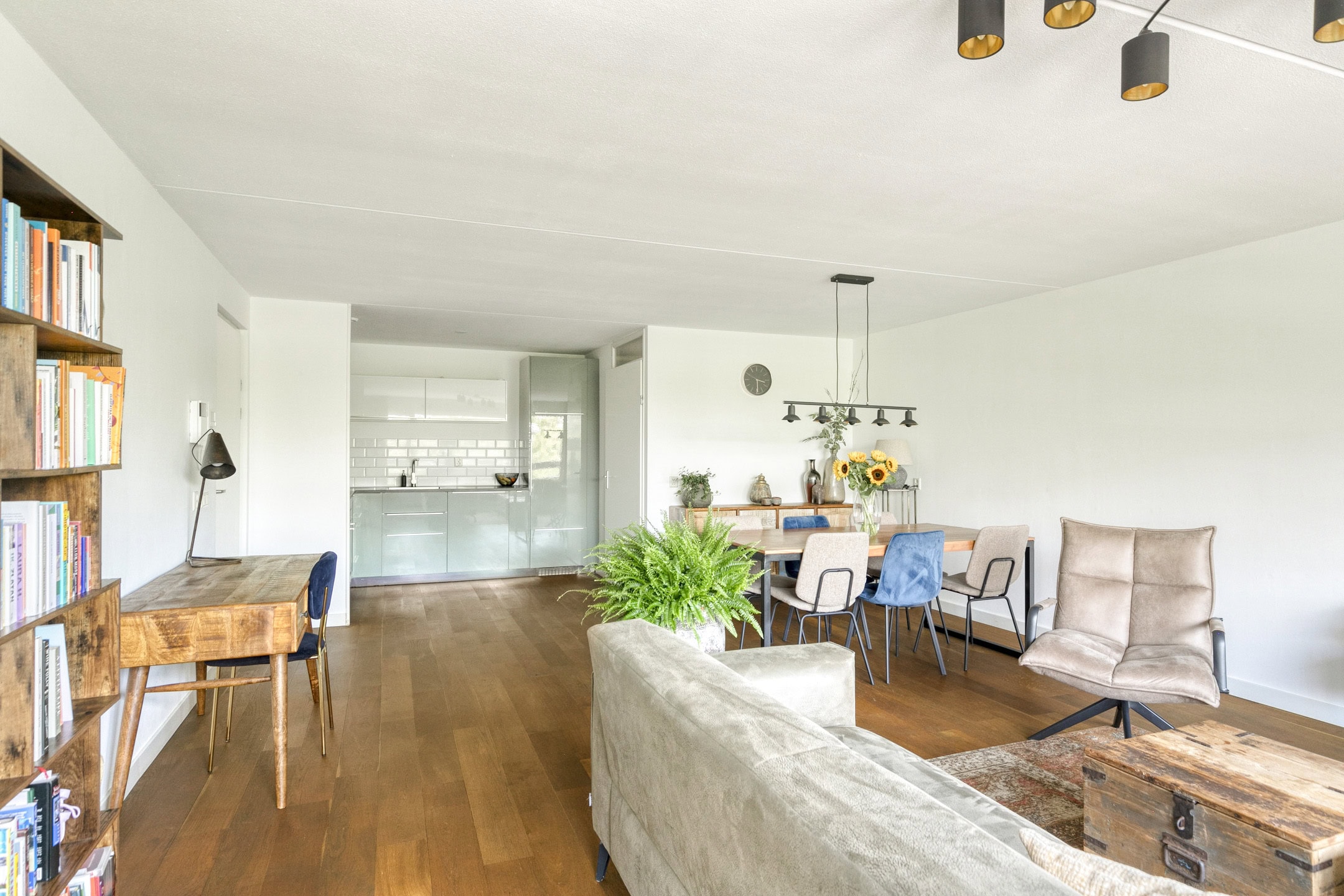 Via een overdekte, inpandige galerij bereikt u de voordeur van het appartement. Eenmaal binnen komt u in een ruime hal die direct een gevoel van warmte en welkom oproept. De fraaie houten vloer loopt door in alle woonvertrekken en draagt bij aan de stijlvolle uitstraling van het geheel. In de hal vindt u tevens een handige bergkast met de in 2019 vernieuwde CV-combiketel en de unit voor mechanische ventilatie.