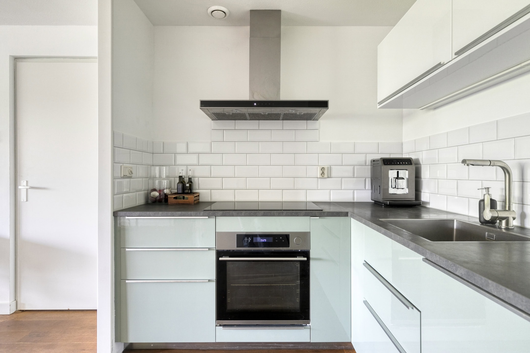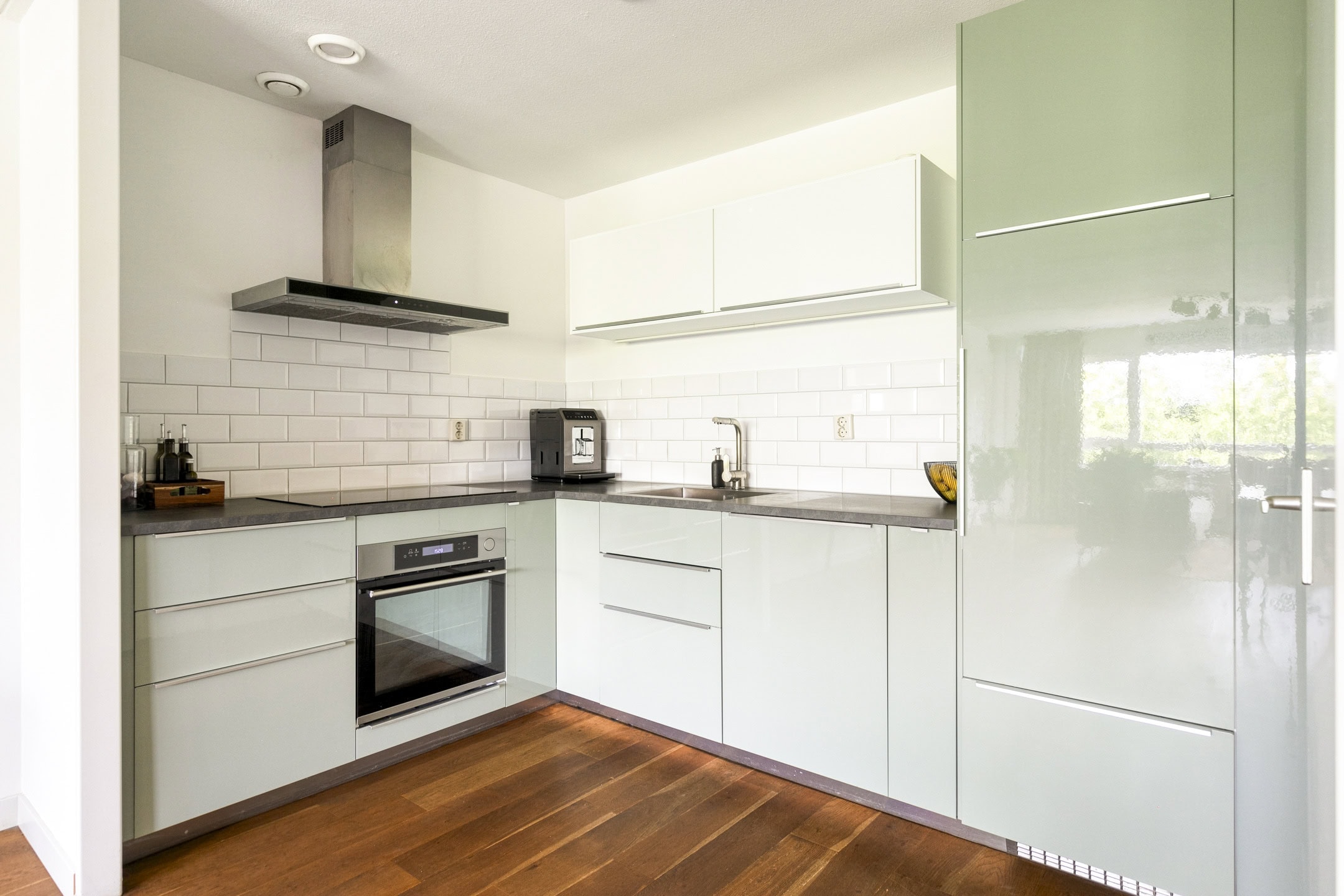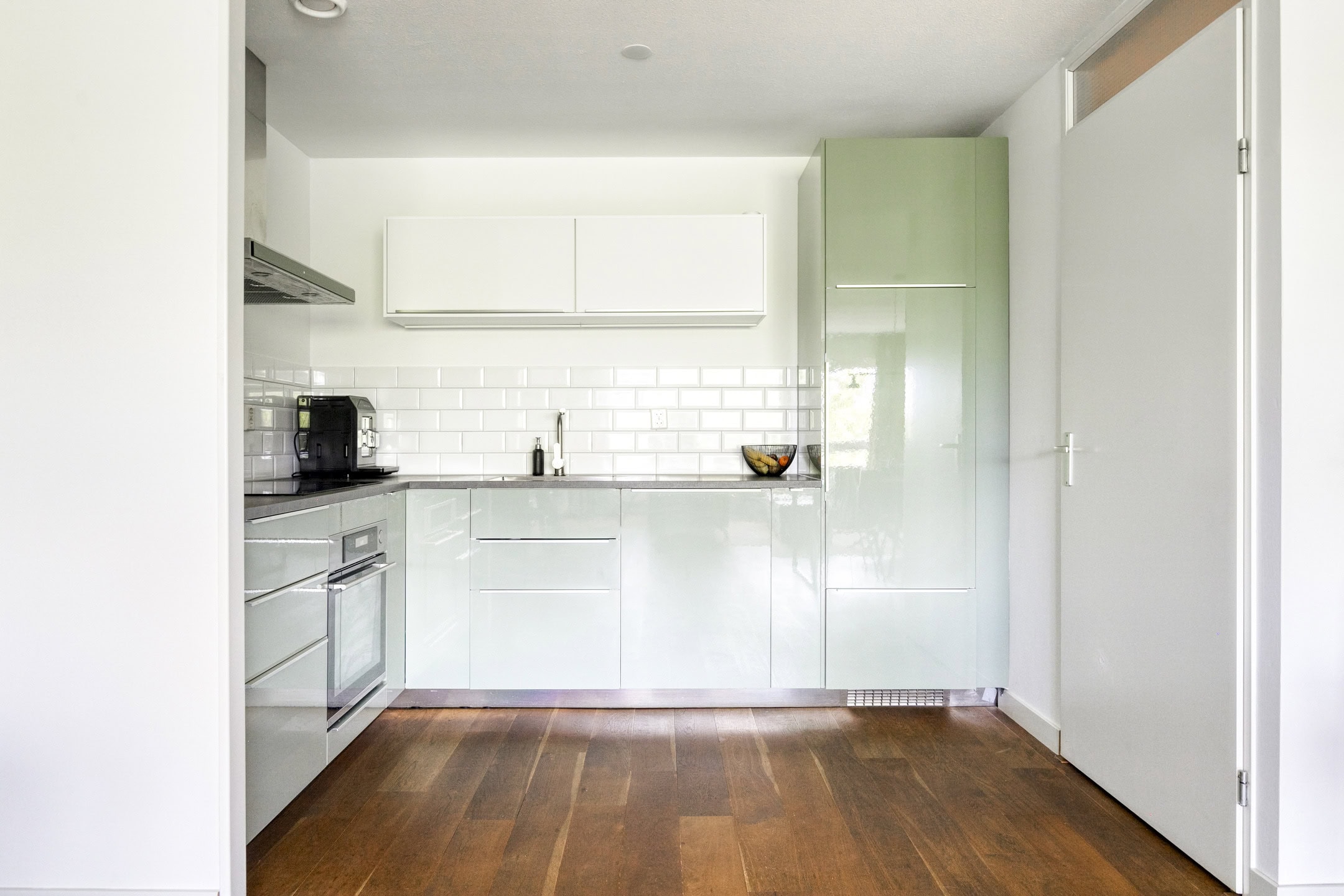 De woonkamer is zonder twijfel een van de hoogtepunten van deze woning. Dankzij de grote raampartijen geniet u hier van een heerlijk lichtinval en een rustgevend uitzicht over het kanaal. De open keuken sluit naadloos aan op de woonruimte en is uitgevoerd in een moderne hoekopstelling met hoogwaardige inbouwapparatuur, waaronder een inductiekookplaat, afzuigkap, oven, koelkast en vaatwasser. De keuken biedt daarnaast volop kastruimte, wat zorgt voor een strak en opgeruimd geheel.