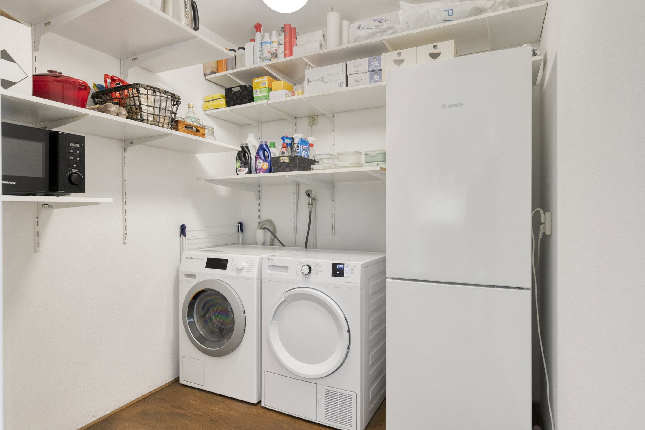 Aangrenzend aan de keuken bevindt zich een ruime bijkeuken met aansluiting voor de wasmachine en extra bergruimte – ideaal voor het opbergen van huishoudelijke spullen of voorraad.