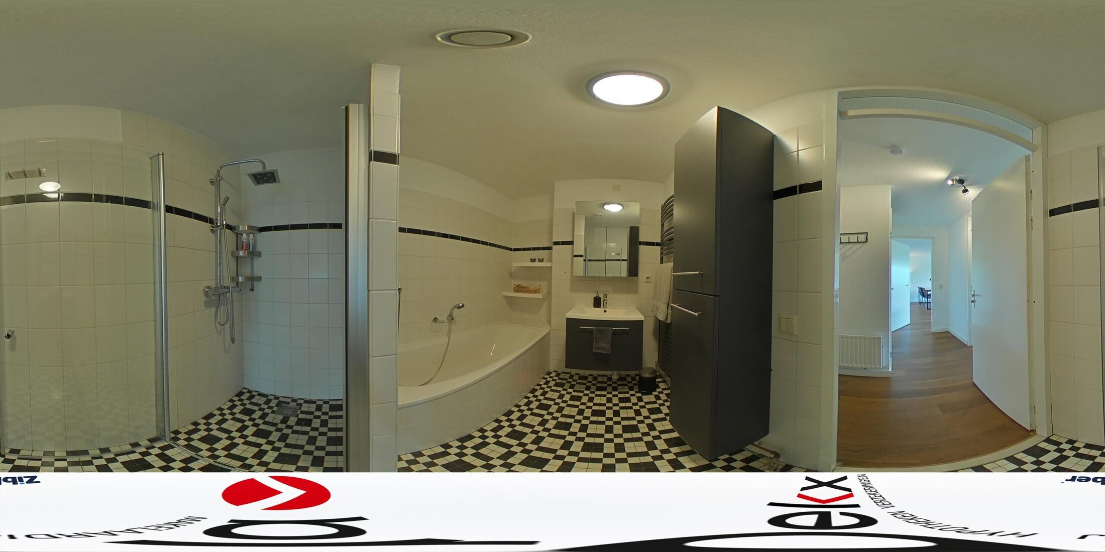 Aan de rechterzijde bevindt zich het separate toilet, voorzien van fonteintje en een moderne betegeling. De badkamer is eveneens gedeeltelijk betegeld en beschikt over een comfortabel ligbad, een aparte douche met glazen spatscherm, een badkamermeubel met wastafel, een spiegelkast en een handdoekenkast – alles strak en praktisch ingericht.