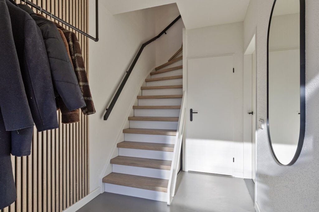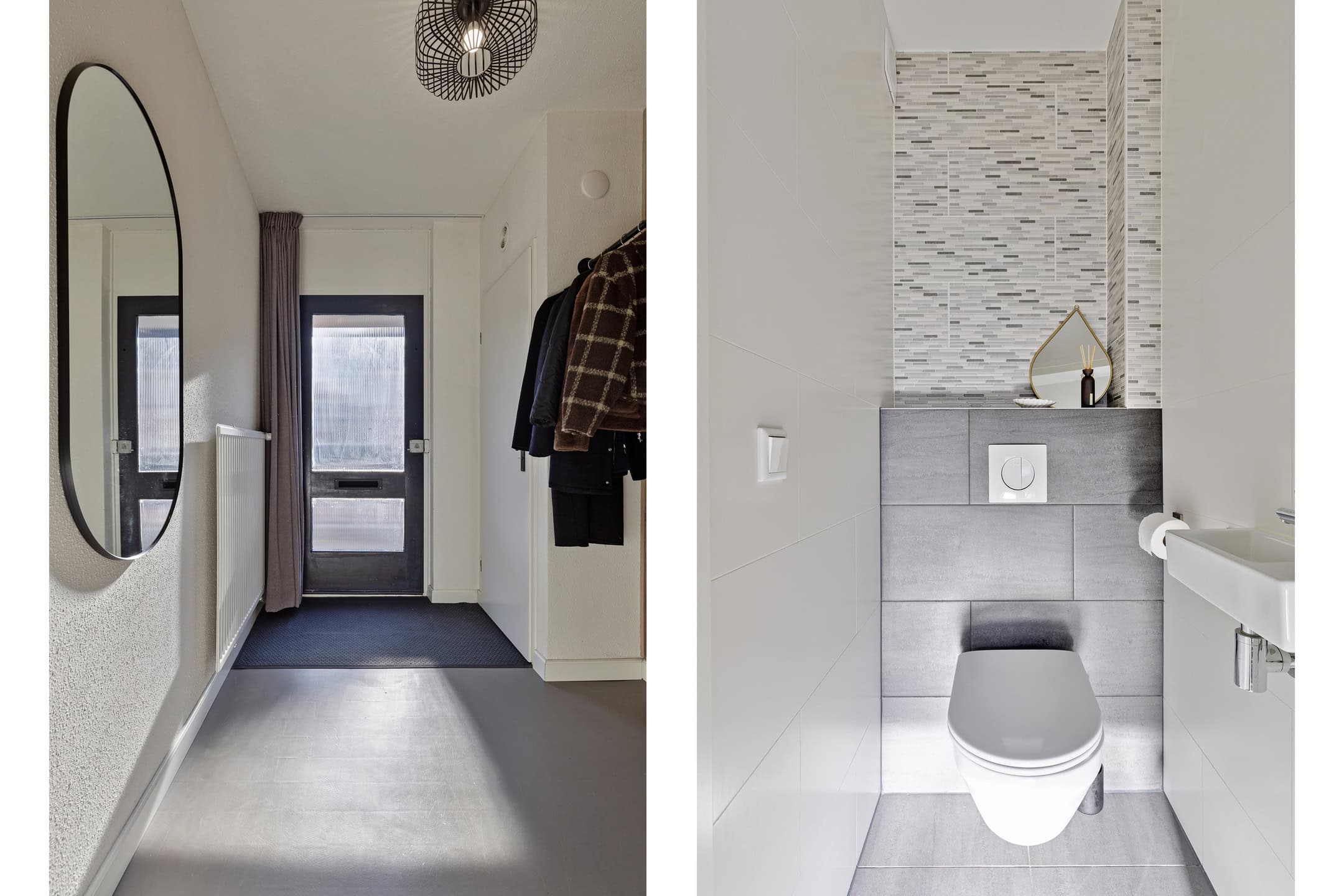Via de overdekte entree bereik je de ruime ontvangsthal met garderobemogelijkheid, meterkast, praktische trapkast met bergruimte en fraaie trapopgang naar de eerste verdieping. Vanuit de hal krijg je toegang tot de woonkamer en de modern, geheel betegeld toiletruimte met wandcloset en fonteintje.