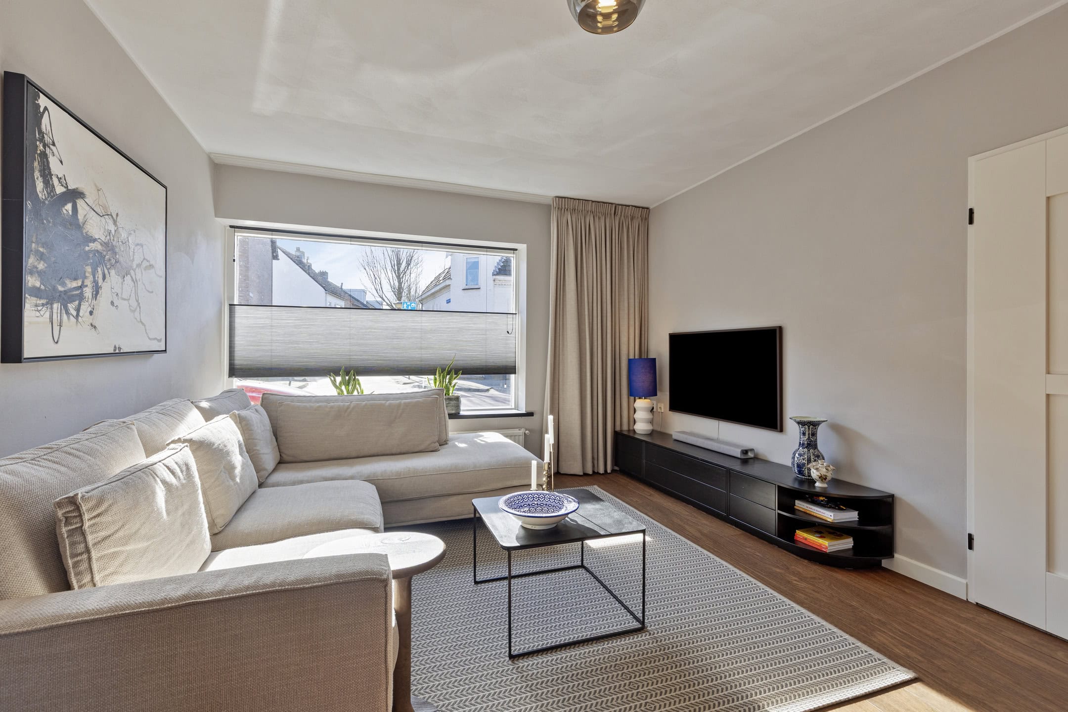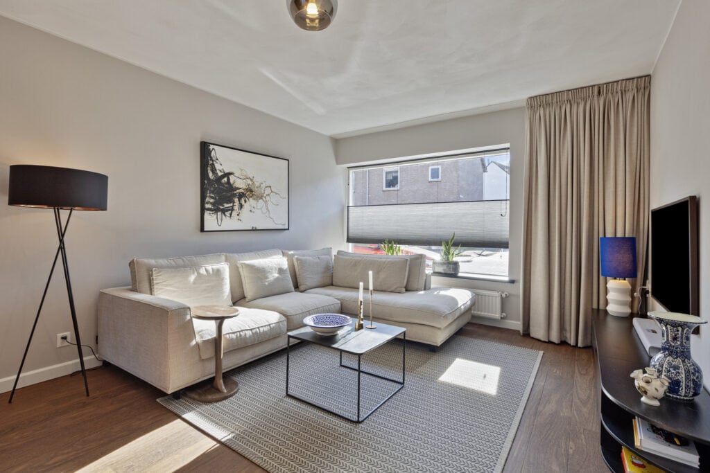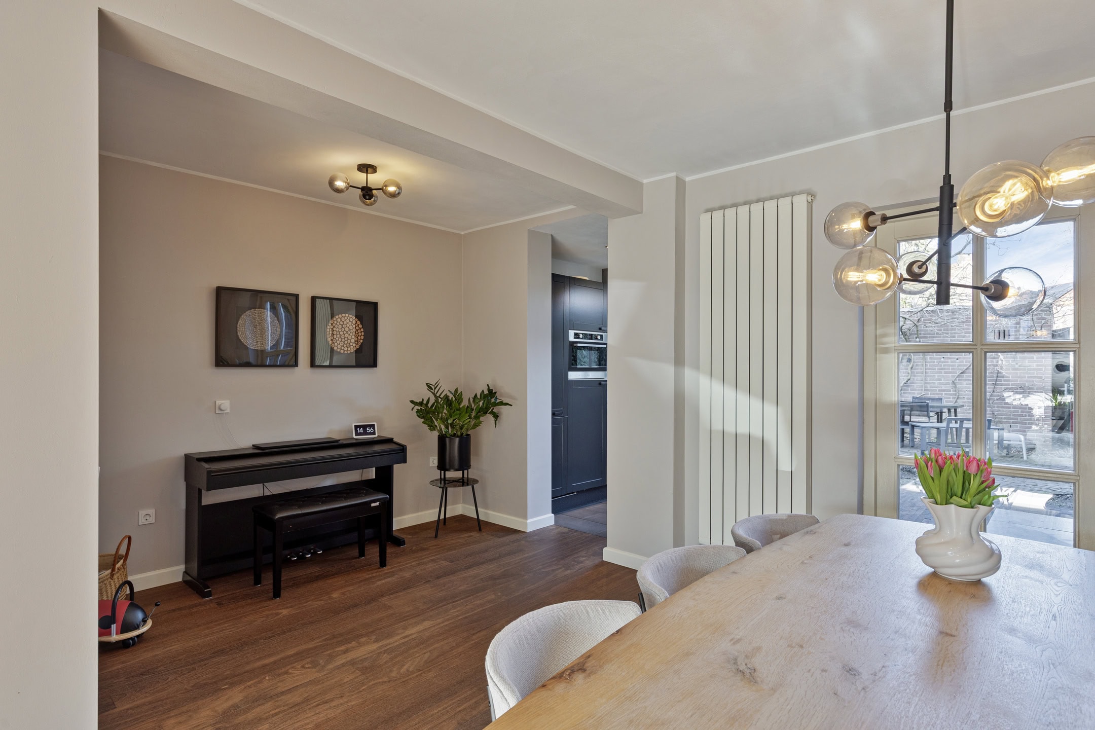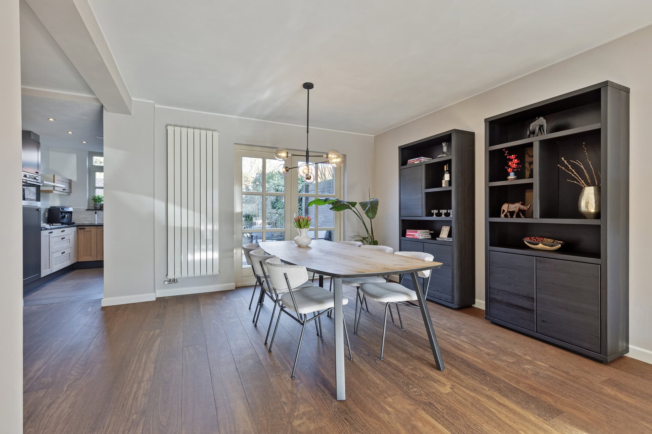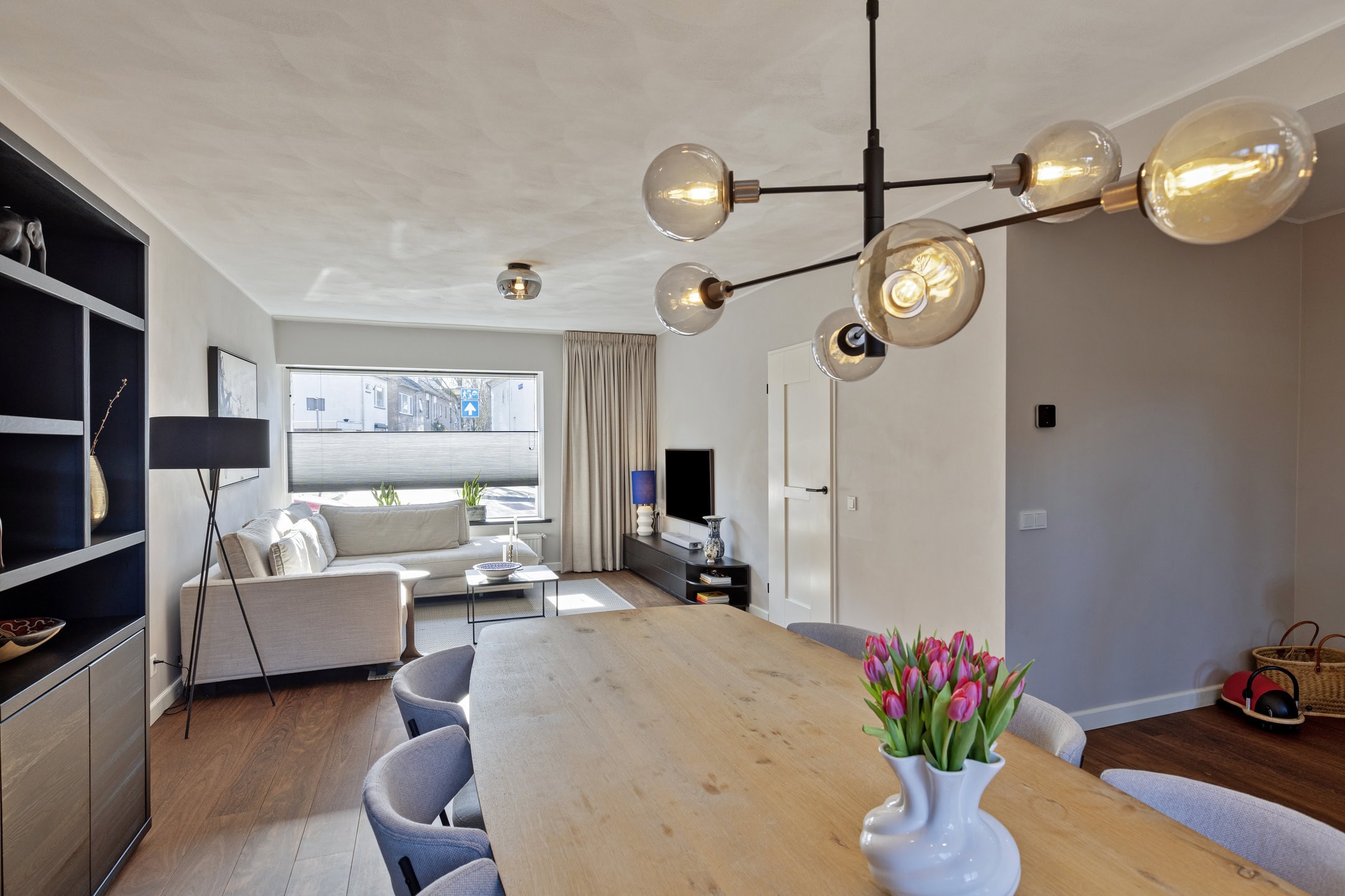 De riante, brede en L-vormige woonkamer beschikt over een prachtige parketvloer, grote raampartij aan de voorzijde, strak stucwerk en sfeervolle openslaande deuren naar de tuin. Een fijne, lichte leefruimte met voldoende plaats voor een royale zit- en eethoek.