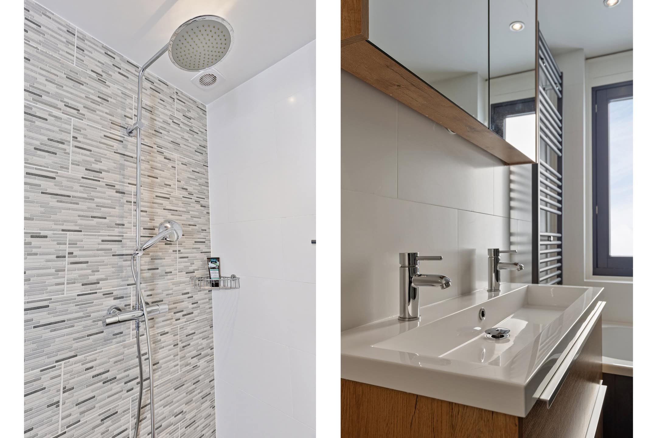 De luxe, moderne badkamer is volledig betegeld en gelegen aan de voorzijde van de woning. De badkamer is uitgerust met een inloopdouche met glazen wanden, een ligbad, wandcloset, designradiator en wastafelmeubel met dubbele kraan. Het stucwerk plafond is voorzien van sfeervolle inbouwspots. In deze ruimte kom je heerlijk tot rust.