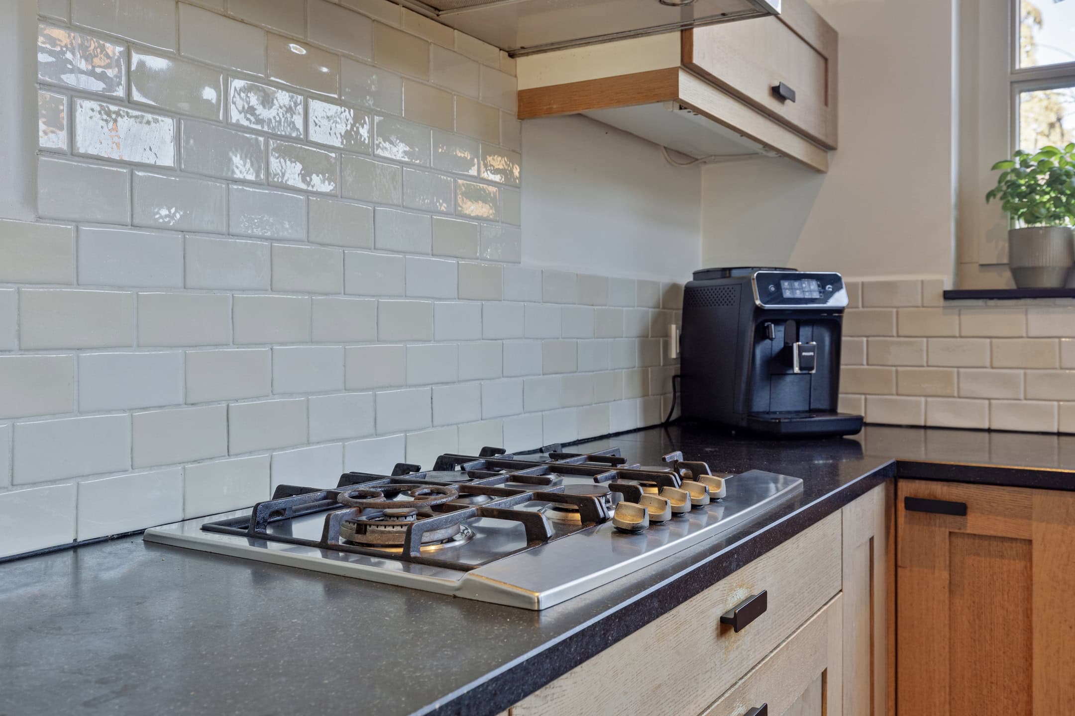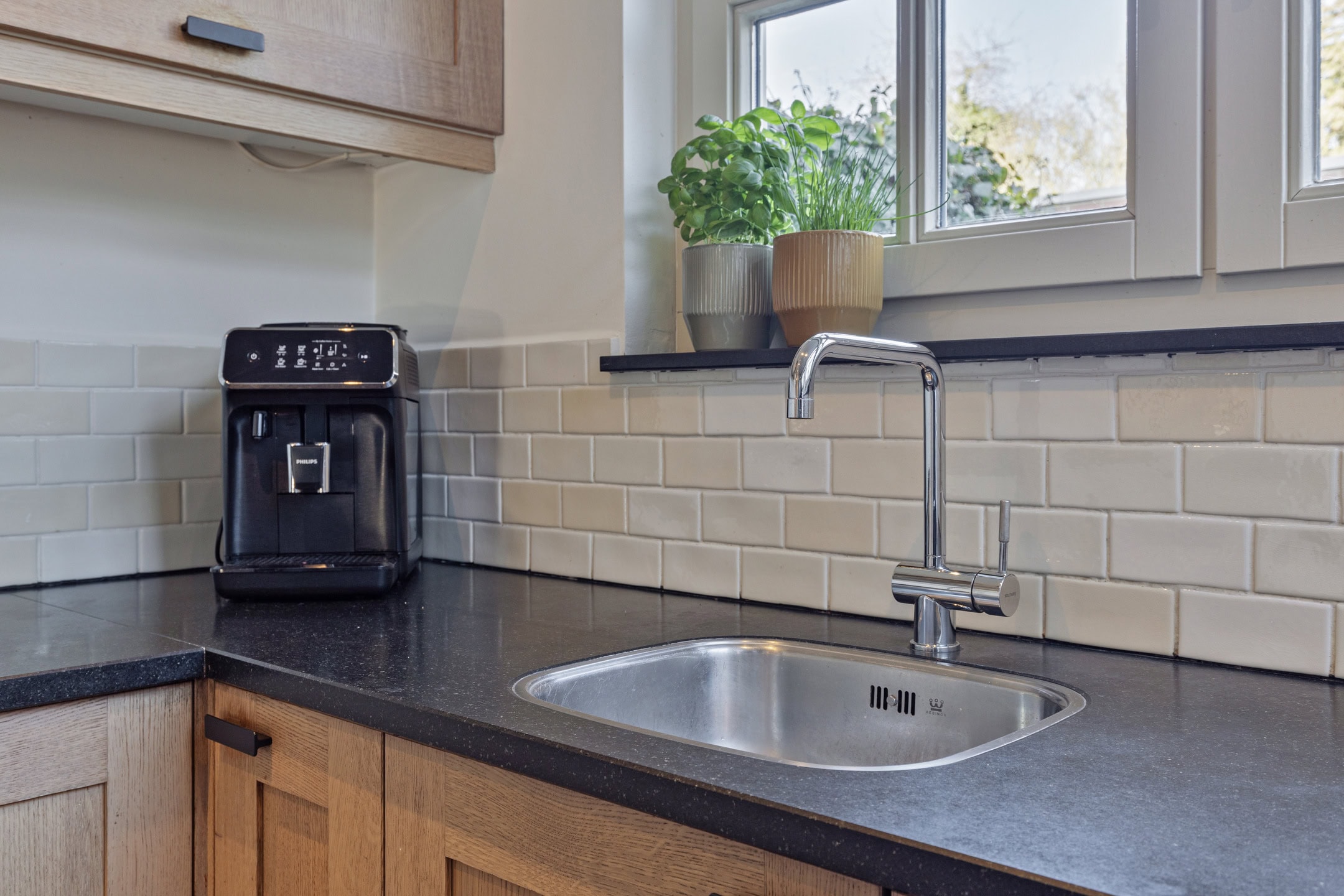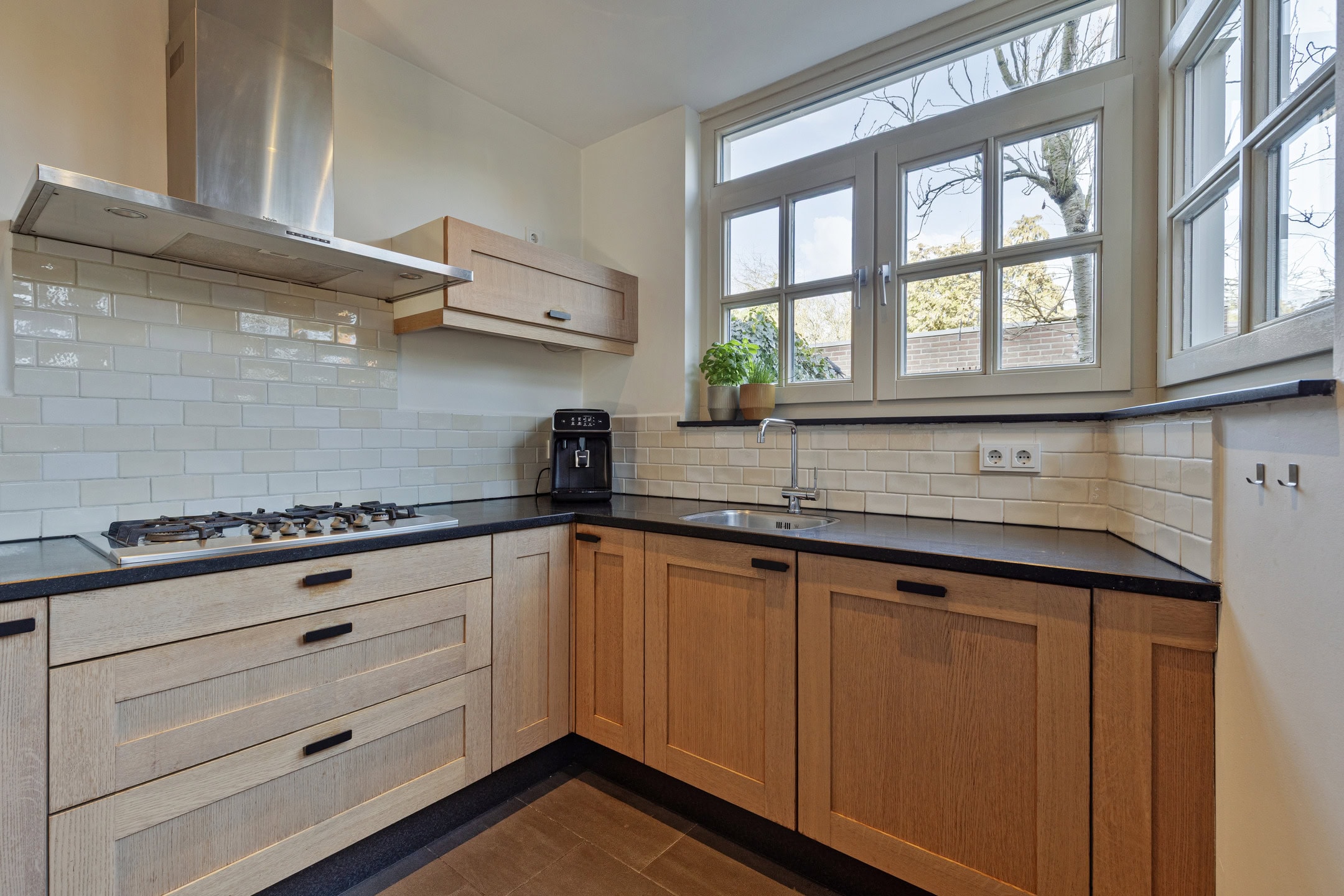 De keuken is in de uitbouw geplaatst en is uitgevoerd met een praktische tegelvloer voorzien van vloerverwarming, inbouwspots en een fraai hoekraam. De moderne keukeninrichting beschikt over diverse kasten en lades, een composiet werkblad, spoelbak, 5-pits gaskookplaat, koelkast, vrieskast, combi oven-/magnetron, afzuigkap en een vaatwasser.