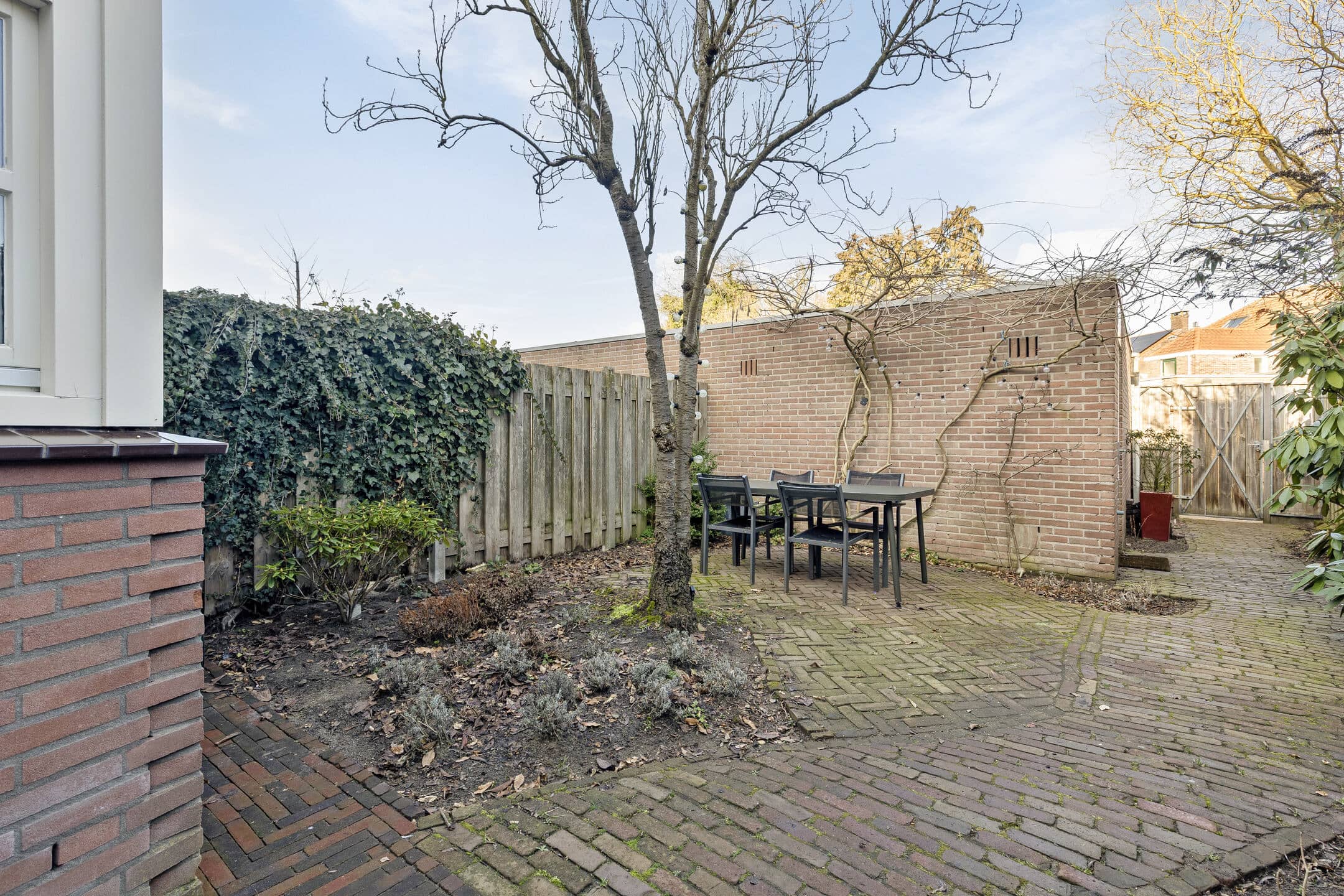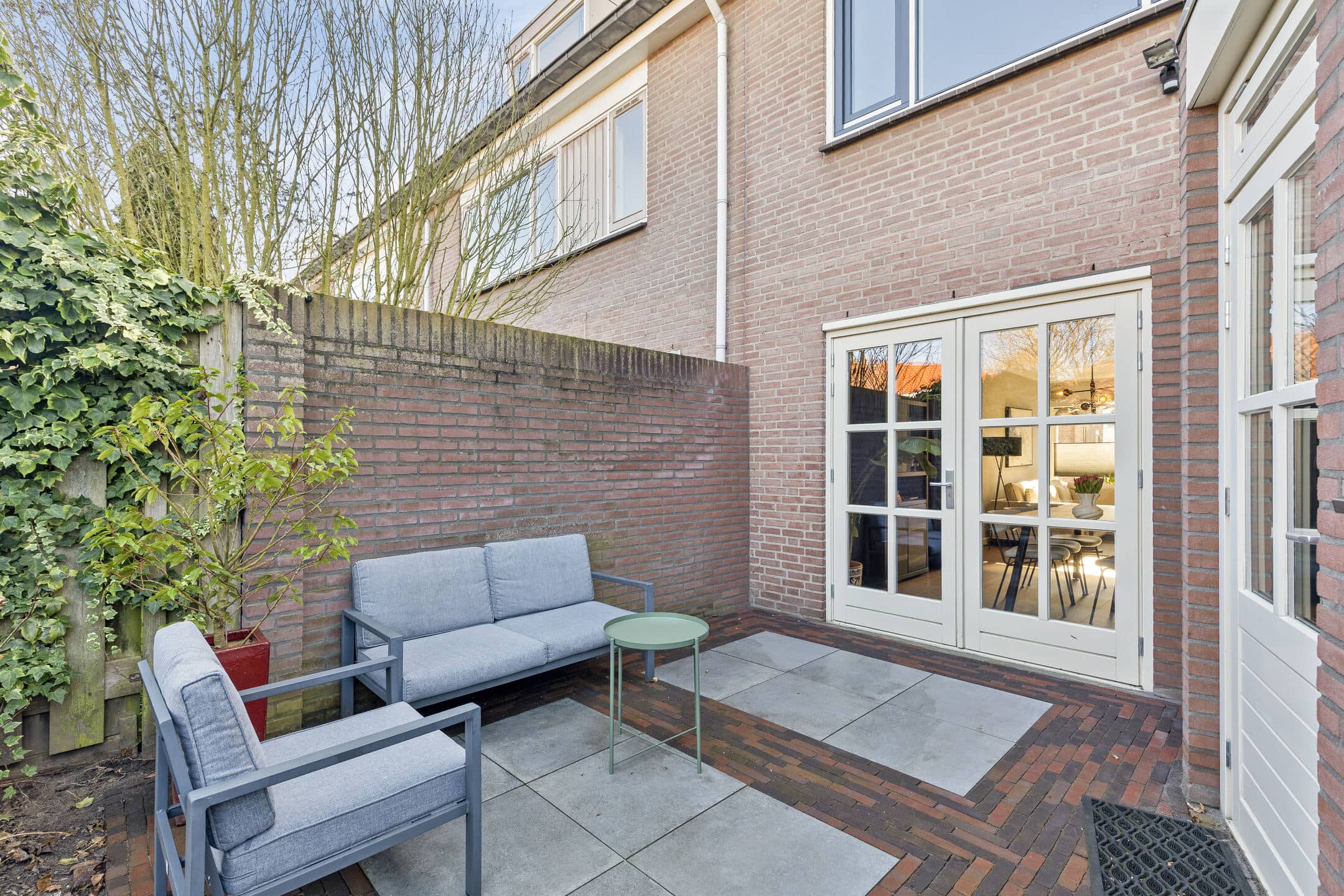 De diepe achtertuin is gelegen op het noordoosten en biedt een fijne mix van zon en schaduw. Direct aan de woning ligt een ruim terras, bereikbaar via de openslaande deuren van de woonkamer en de tuindeur in de keuken wat een prettig verlengstuk van de leefruimte is.