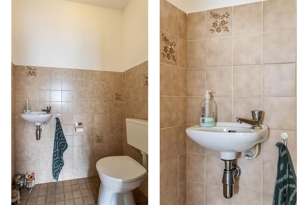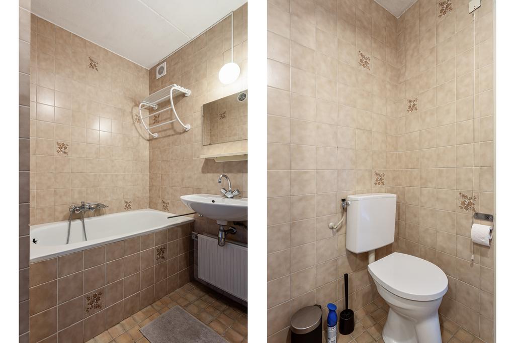 De badkamer is volledig betegeld en voorzien van een toilet, wastafel, mechanische ventilatie, ligbad en douchecabine.