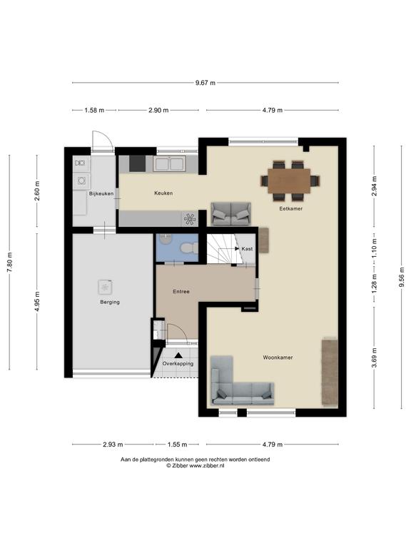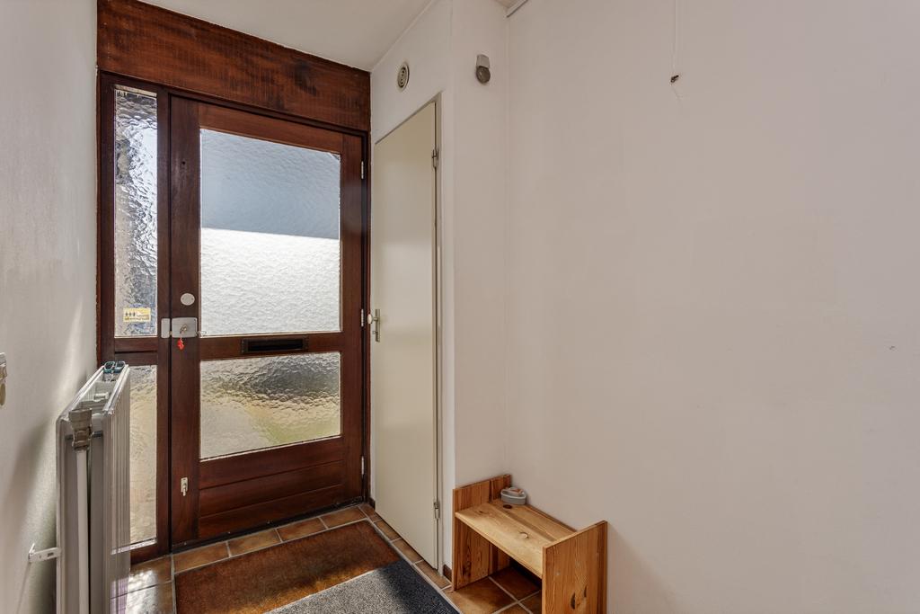 De ruimte ontvangsthal biedt toegang tot de toiletruimte, meterkast, trapopgang, trapkast en de woonkamer.