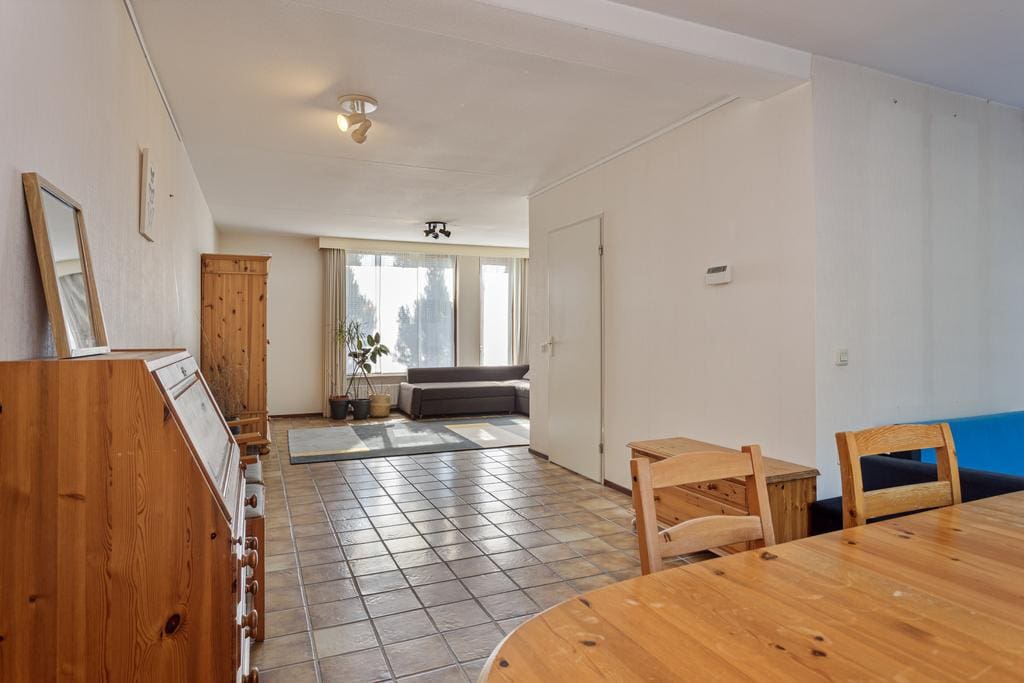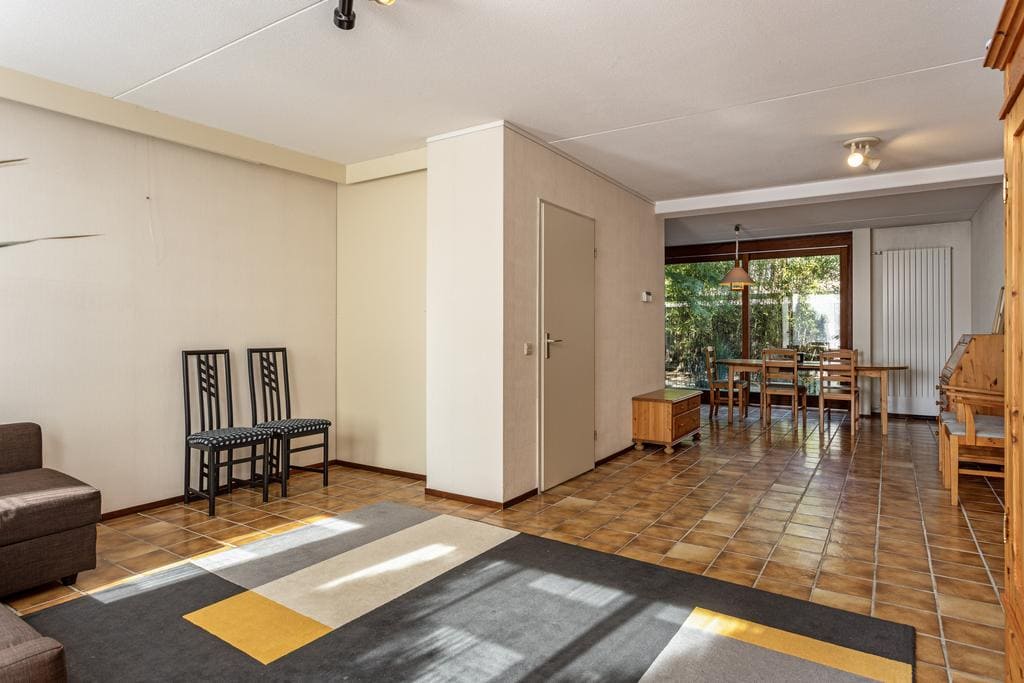 De gehele begane grond is voorzien van een tegelvloer en geniet van veel lichtinval door de grote raampartij aan de voorzijde en de royale schuifpui aan de achterzijde. De woonkamer is zeer ruim en is functioneel ingedeeld. De voorzijde heeft een royale zithoek en aan de achterzijde is een eveneens royale eethoek gecreëerd. Aan de achterzijde is een schuifpui geplaatst en een designradiator. De schuifpui geeft direct toegang tot het royale vlonderterras in de achtertuin.