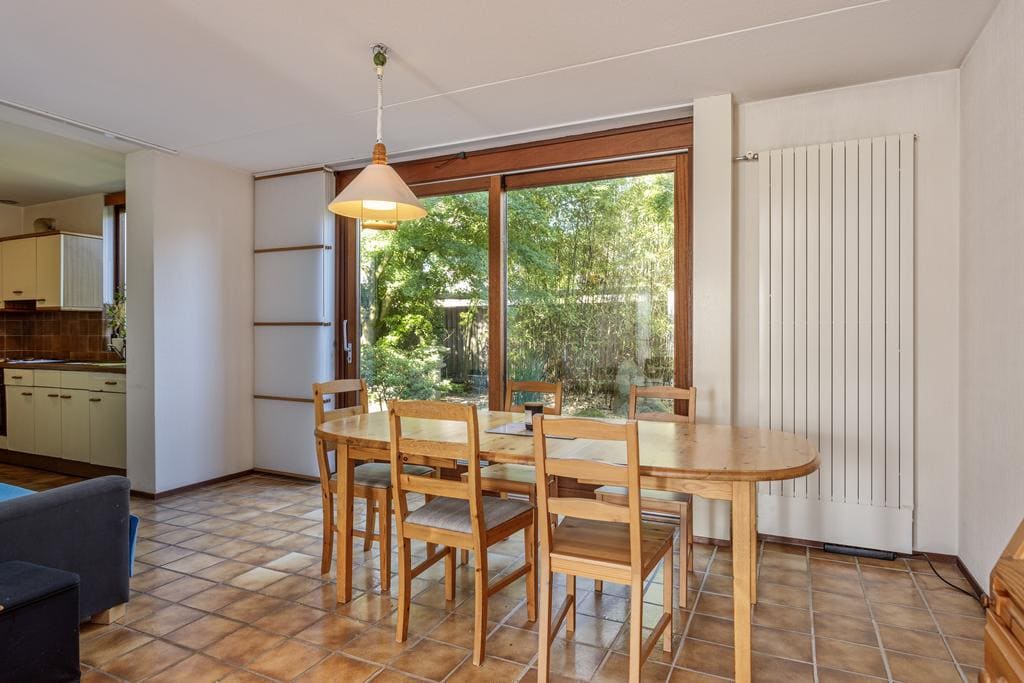 The semi-open kitchen can be reached through the dining room. The kitchen is set up on 2 sides and equipped with an electric hob, extractor hood, oven, fridge and freezer. The window overlooks the backyard. Handy utility room accessible through a door. The utility room has a tiled floor and connections for washing equipment. Through a door you reach the indoor garage and a door to the backyard.