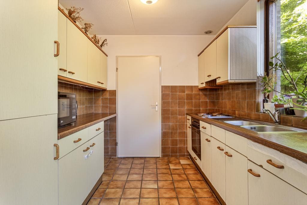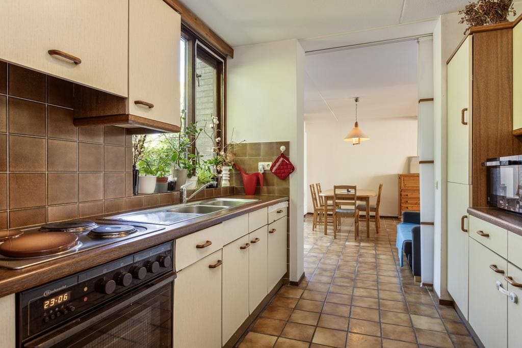 Middels de eetkamer te bereiken halfopen keuken. De keuken is opgesteld aan 2 zijden en voorzien van elektrische kookplaat, afzuigkap, oven, koelkast en diepvries. Het raam kijkt uit over de achtertuin.
