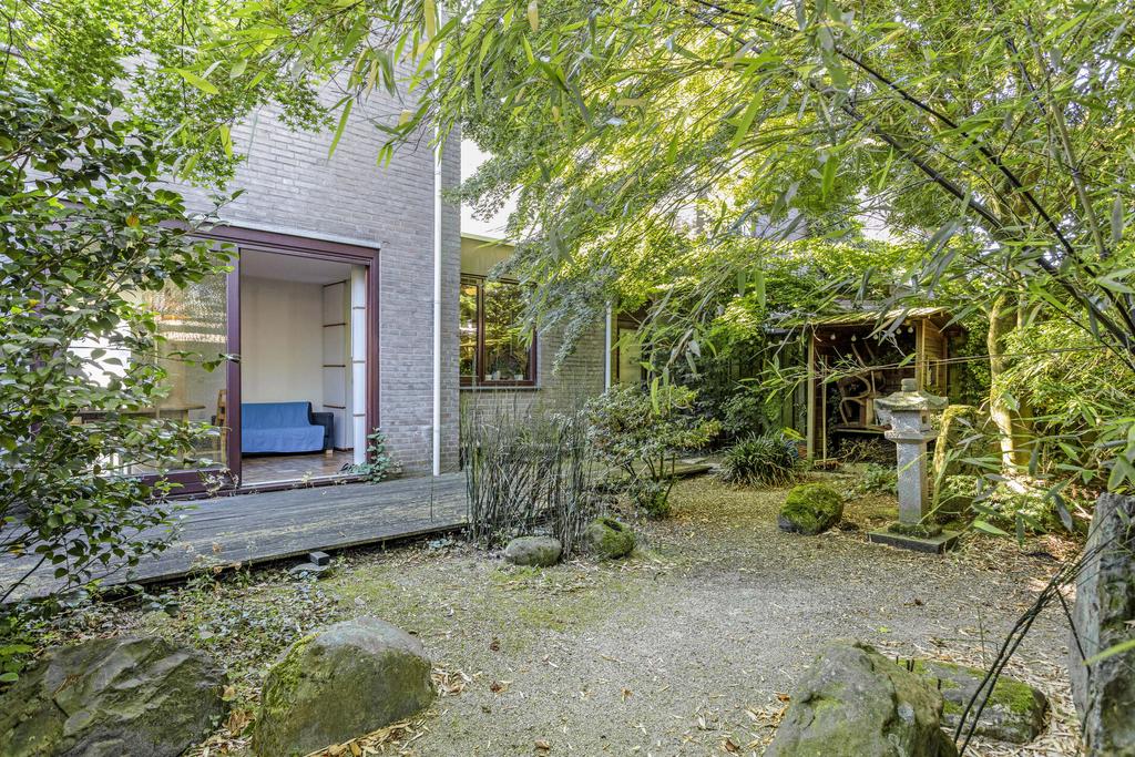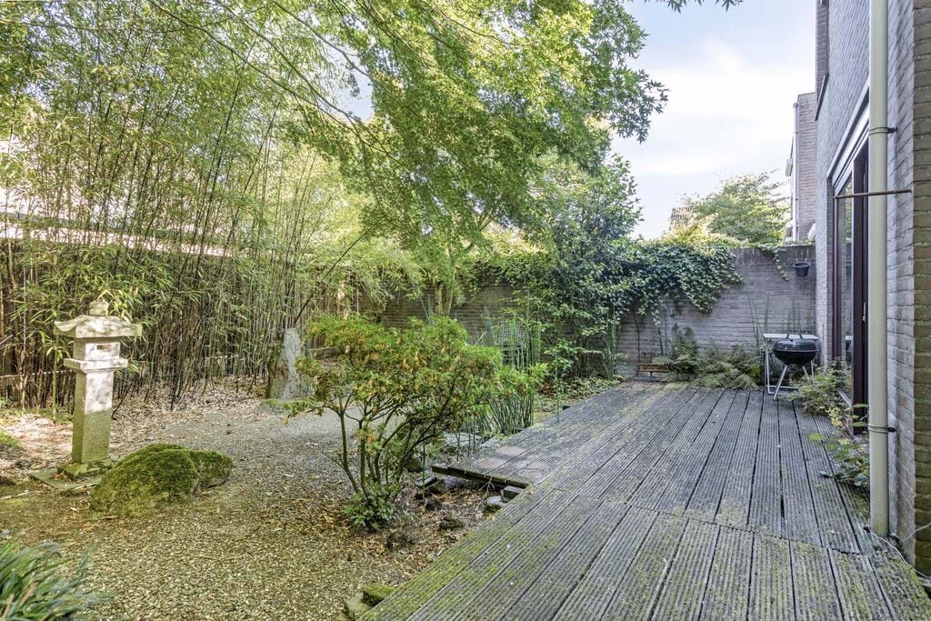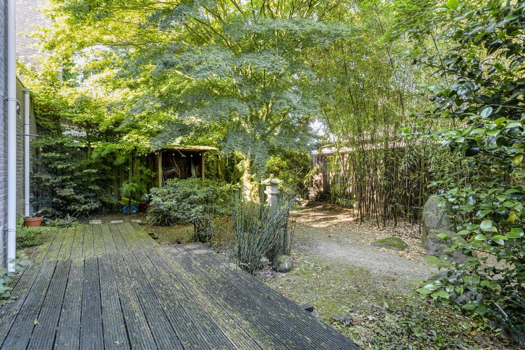 Front garden with driveway to the garage. Ideal! The garage has a concrete floor, electricity and a sectional garage door. The backyard is completely enclosed by mature plants and therefore offers plenty of privacy! The garden is located on the west and has a large deck terrace. This terrace is almost the full width of the house. The terrace can be reached from the living room, through the sliding doors, or from the pantry. The garden is laid out in Japanese style, which is reflected in the plants and the (decorative) stones used. This makes it a quiet, green and unique garden.