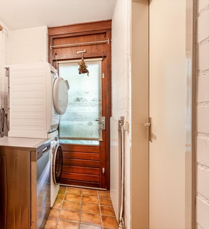 Via een deur te bereiken handige bijkeuken. De bijkeuken is voorzien van een tegelvloer en aansluitingen voor de wasapparatuur. Via een deur bereik je de inpandige garage en een deur naar de achtertuin.