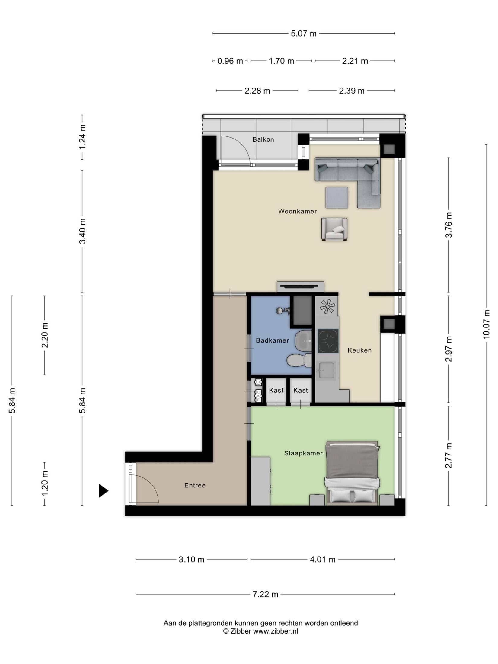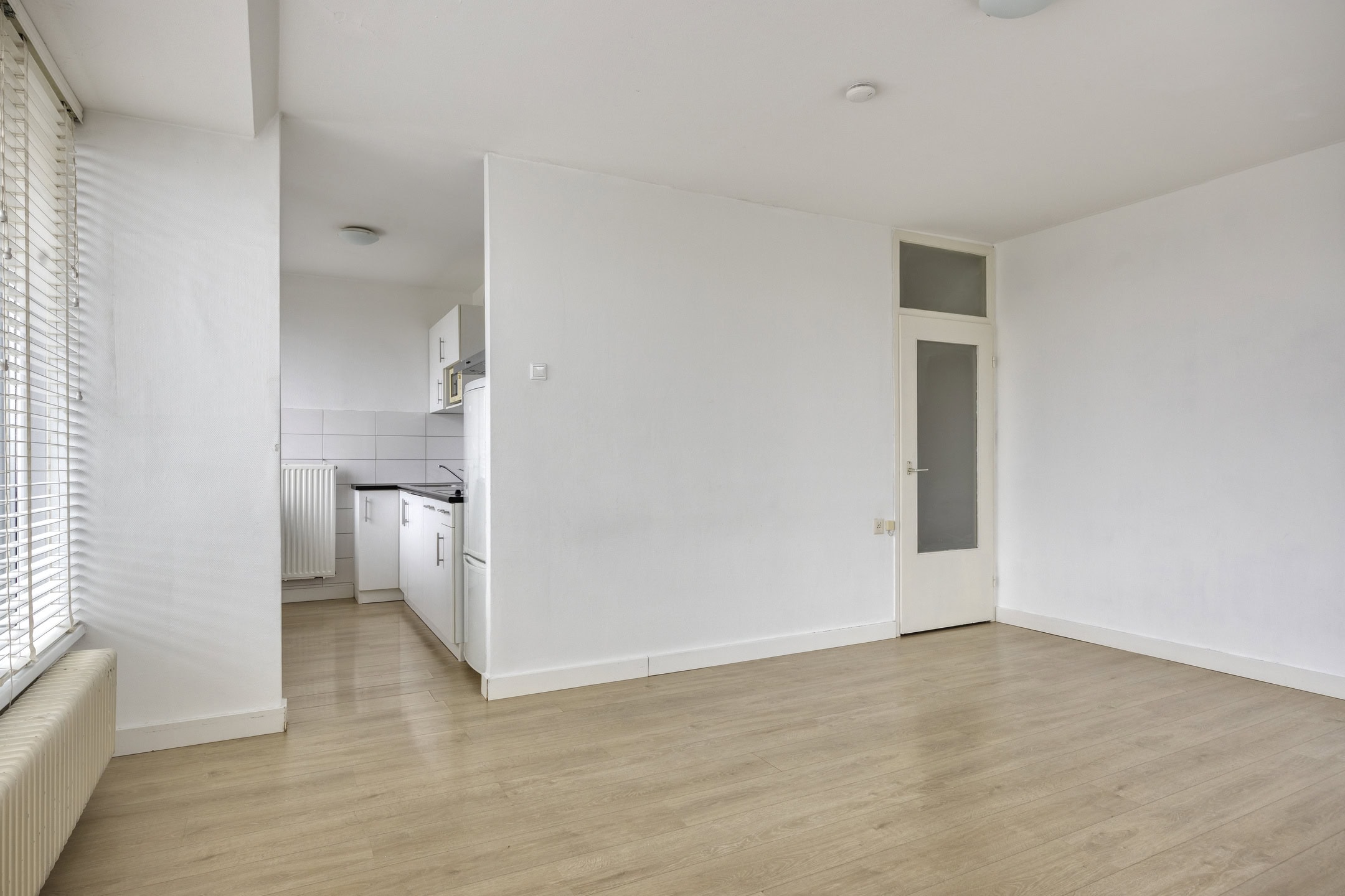 Op de zesde verdieping bereik je het appartement via het portiek met een handige inpandige bergkast. In de hal vind je de vernieuwde meterkast en toegang tot alle vertrekken.