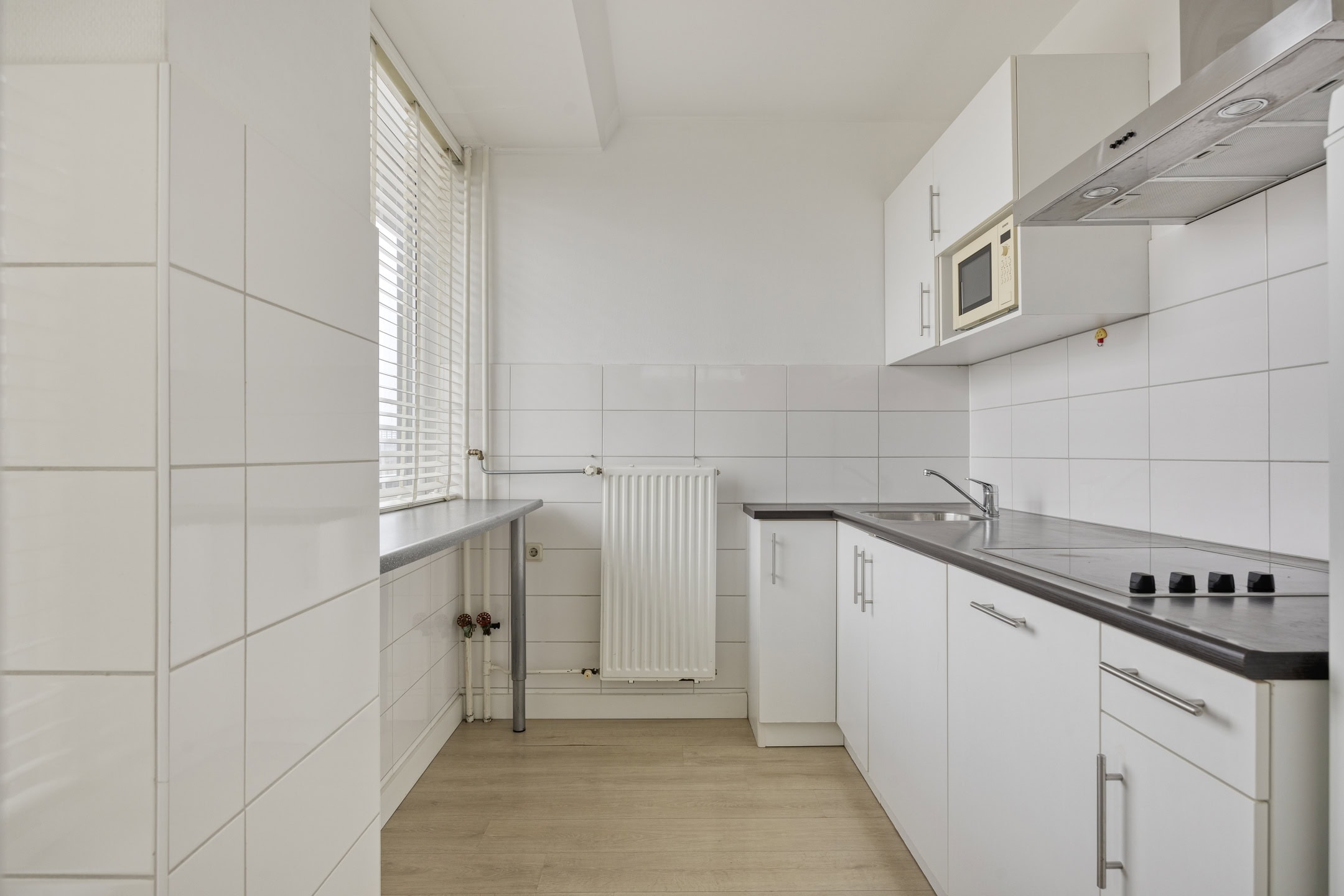 De halfopen keuken sluit prettig aan op de woonkamer en is voorzien van een gemoderniseerde wandopstelling met voldoende werk- en bergruimte. Door de open verbinding blijft de sfeer luchtig en betrokken.