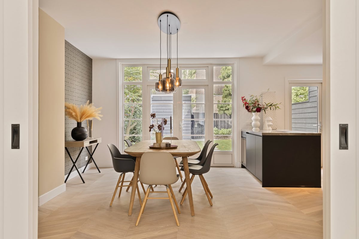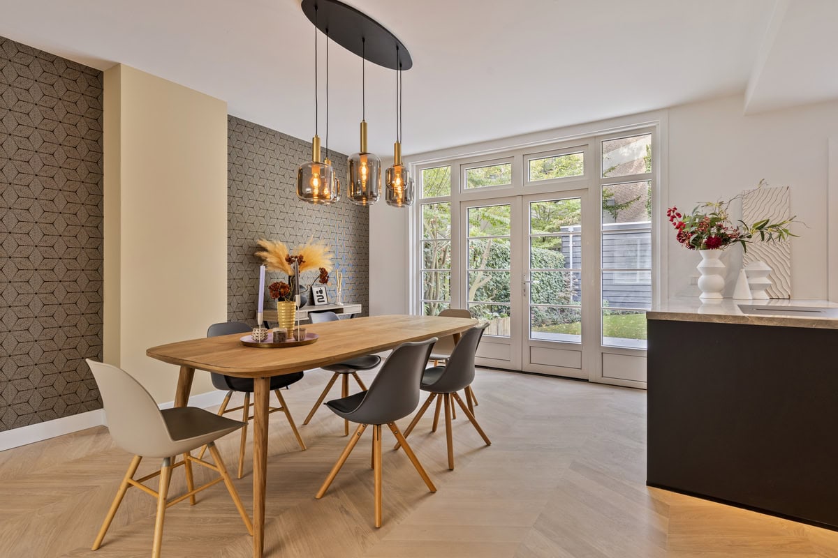 De woonkamer en-suite combineert stijl en comfort met een zitkamer aan de voorzijde en een royale eetkamer met open keuken aan de achterzijde. De schuifdeuren met originele muurkasten vormen een elegante scheiding tussen de ruimtes. De geïsoleerde betonvloer met vloerverwarming is afgewerkt met een hoogwaardige lamelparketvloer in Hongaarse punt. Openslaande deuren en een aparte loopdeur geven toegang tot de fraai aangelegde achtertuin.