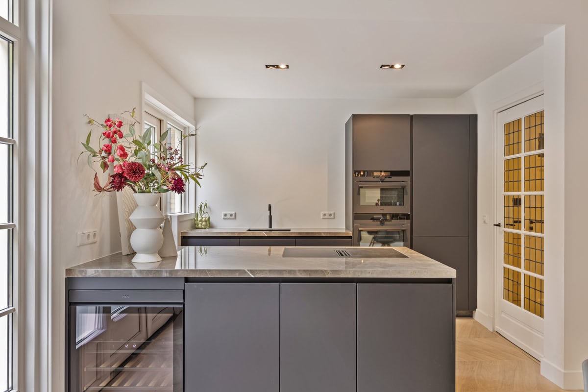 De open keuken is ontworpen voor de culinaire liefhebber, met hoogwaardige inbouwapparatuur en een luxe uitstraling. Enkele highlights zijn de inductiekookplaat met geïntegreerde afzuiging, een combi- en stoomoven, een Quooker die zowel kokend als gekoeld bruisend water levert, en een exclusieve wijnklimaatkast met 2 temperatuurzones.