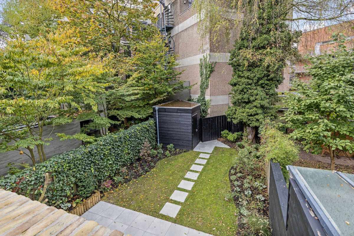 De circa 15 meter diepe achtertuin, gelegen op het westen, biedt veel privacy en zon. De tuin is volledig opnieuw aangelegd, voorzien van een houten berging en een vrije achterom. Hier geniet u van rust en ruimte, een zeldzame luxe in het stadscentrum.