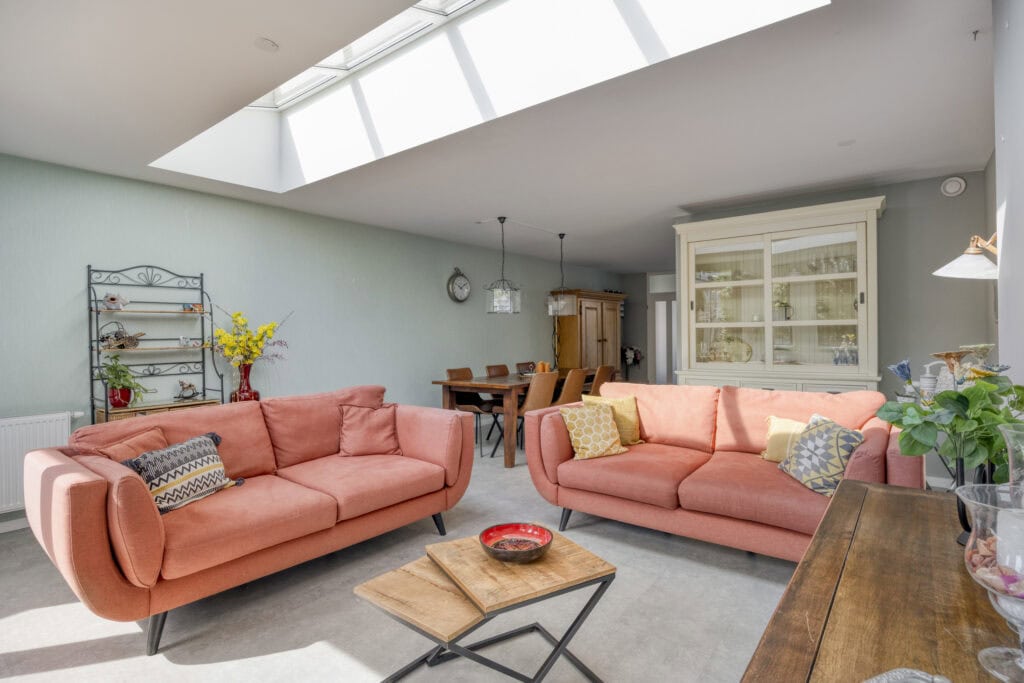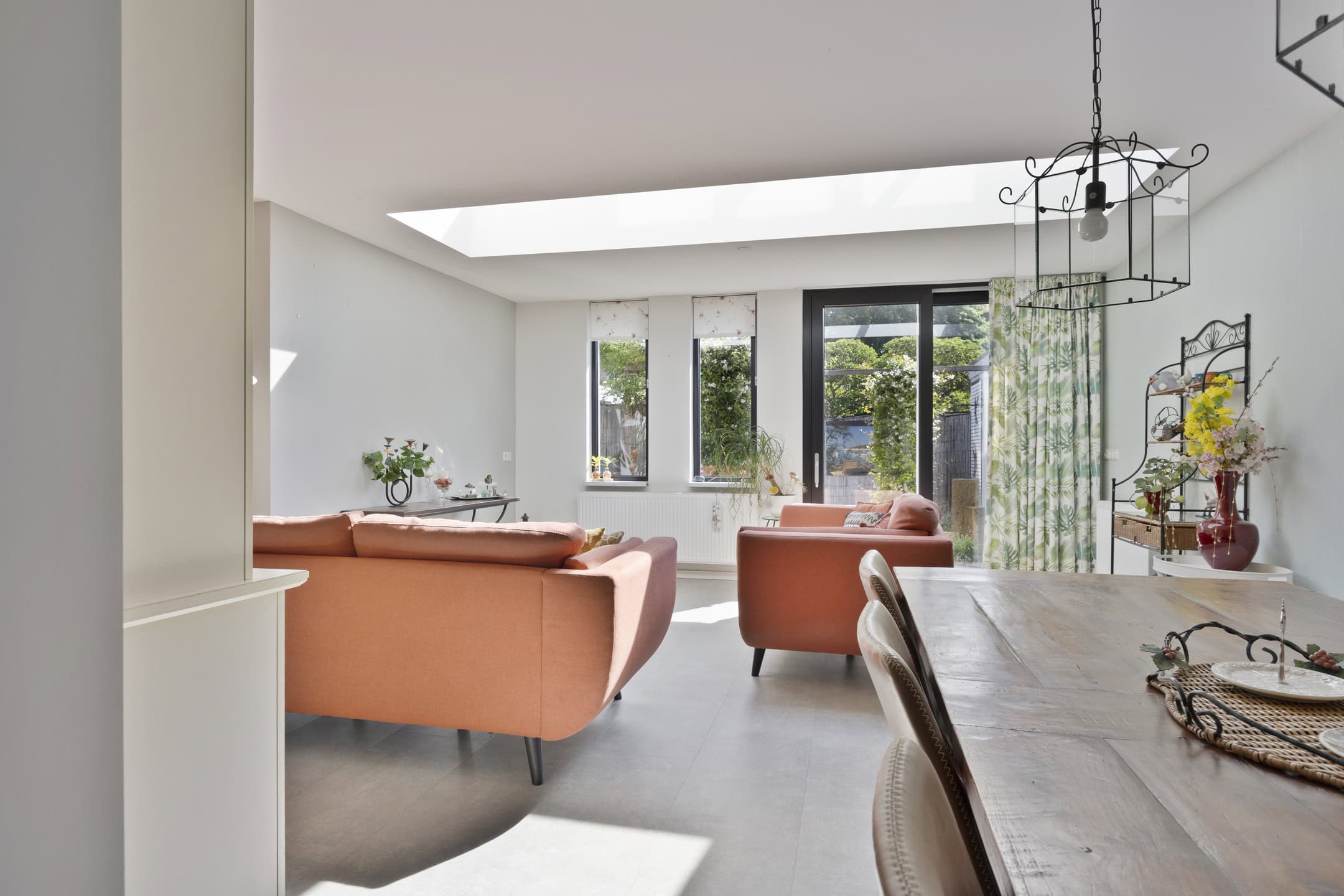 Aan de achterzijde is de woning over de volle breedte uitgebouwd, waardoor een royale en lichte woonkamer is ontstaan. De grote lichtstraat in het plafond zorgt voor een prettige lichtinval en een open sfeer. Vanuit de woonkamer bereik je het portaal met trapopgang en een strak afgewerkte toiletruimte met wandcloset en fonteintje. De hele begane grond is voorzien van een onderhoudsvriendelijke PVC-vloer in een neutrale kleur.